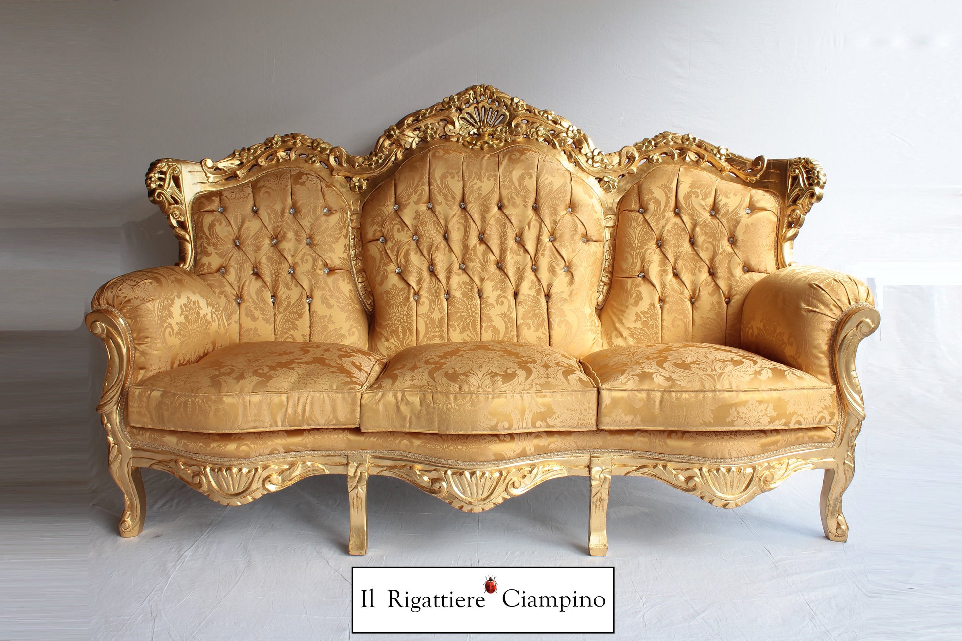 Set salotto in stile barocco, foglia oro e damasco dorato