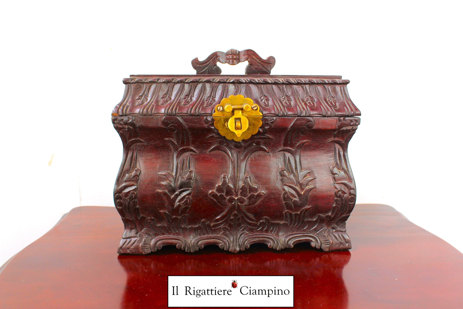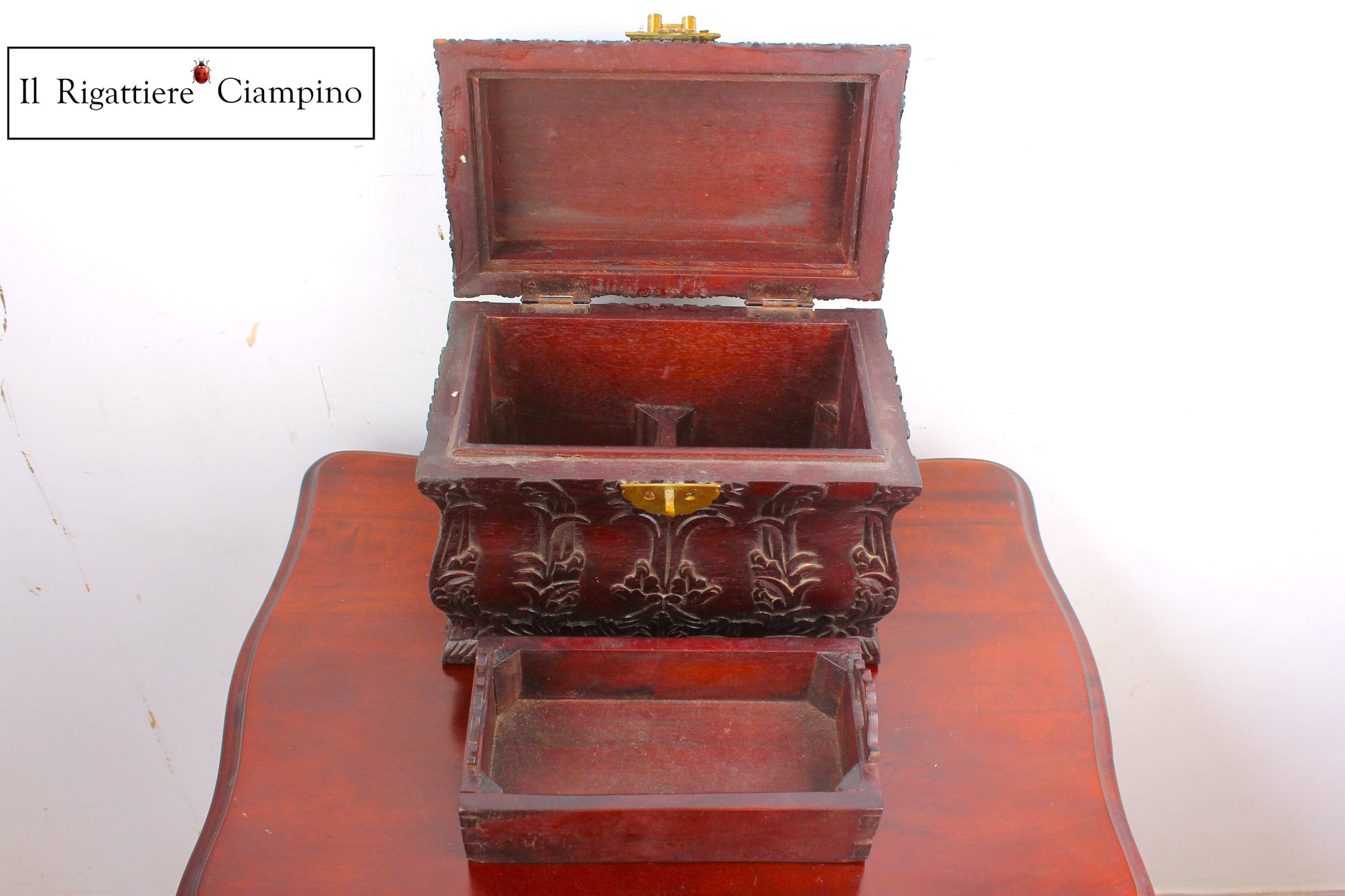Scrigno piccolo per bigiotteria, chiusura in ottone. Ripiani interni.