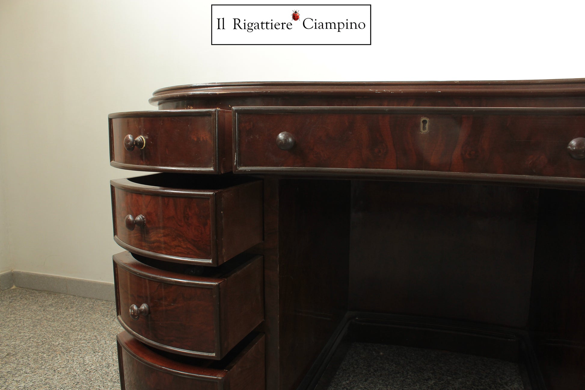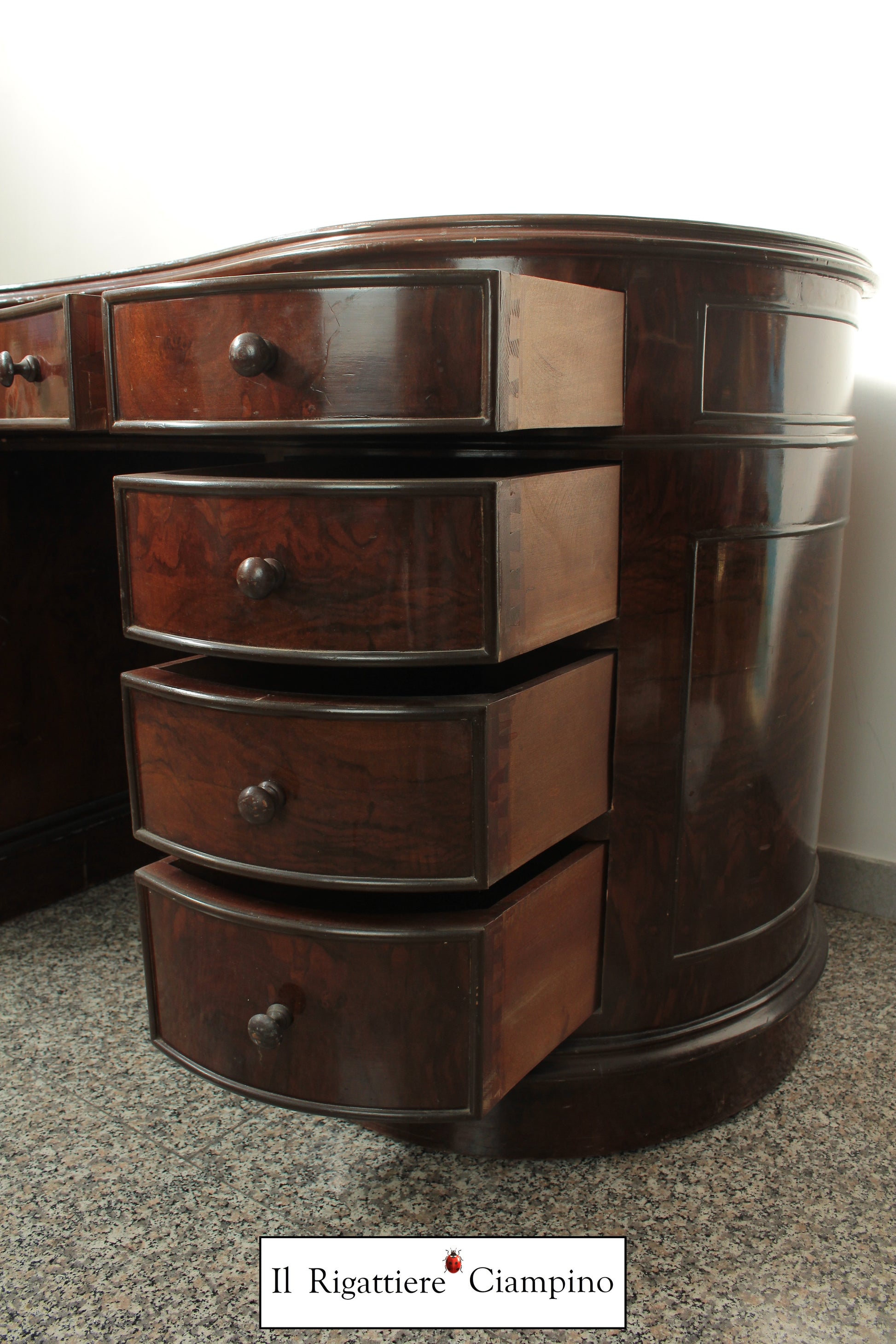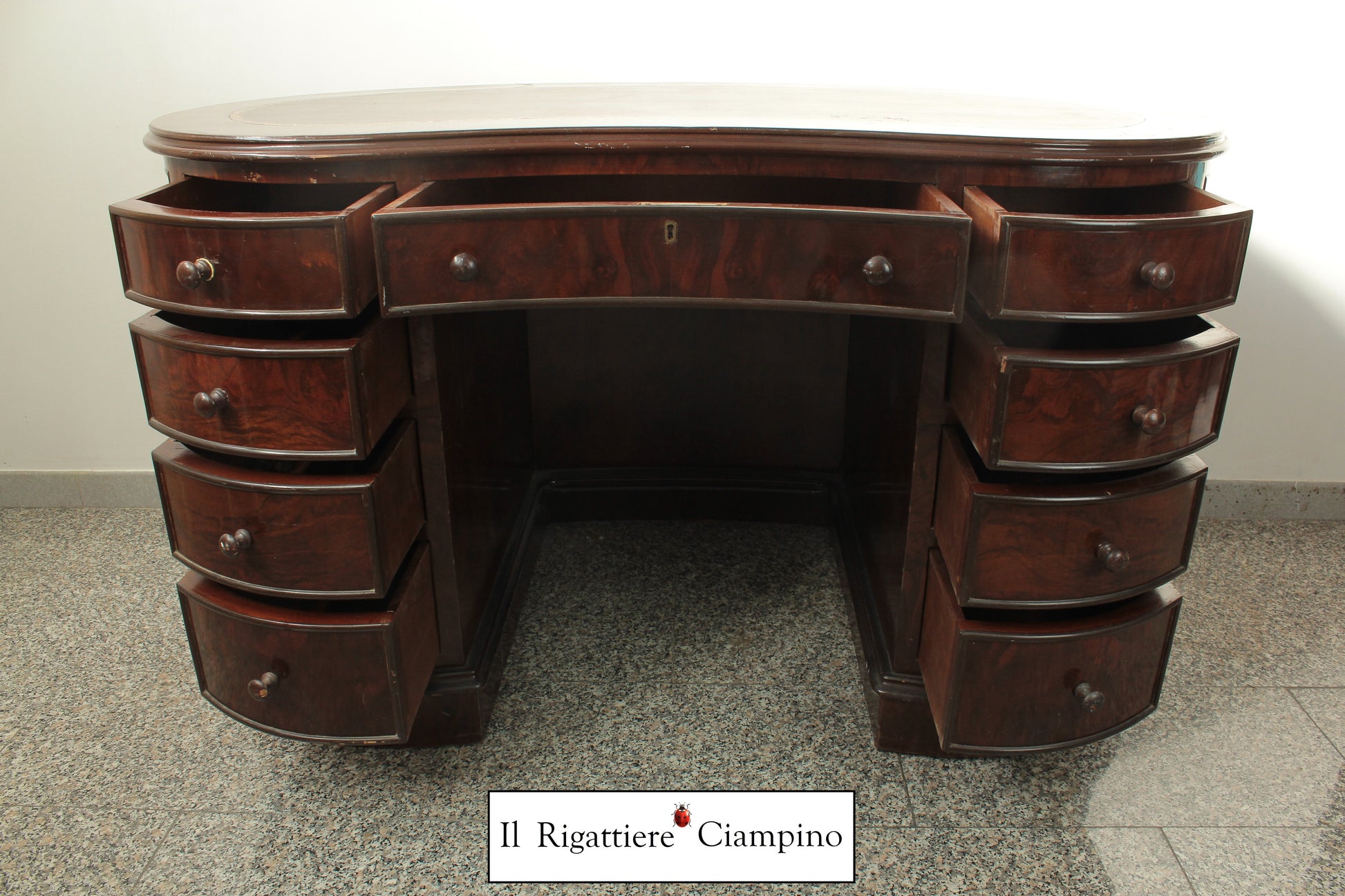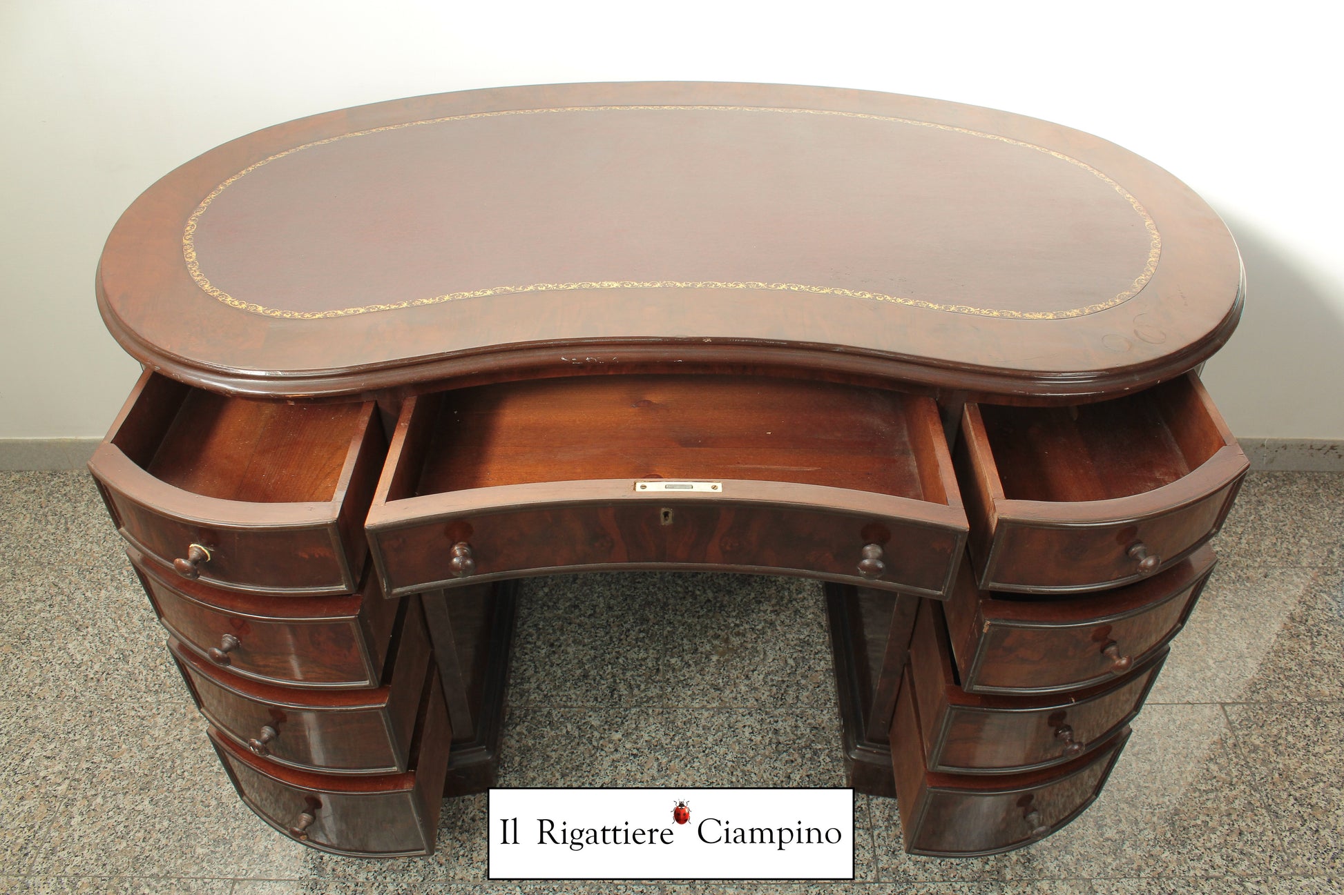 Il Rigattiere Ciampino propone un magnifica scrivania in radica nazionale, stondata a forma di fagiolo. Dotata di cassetti a sinistra e a destra, uno anche al centro, questa scrivania è perfetta per chi deve scrivere in un ambiente elegante e ordinato. Impreziosita da ecopelle sul piano di lavoro. Dona un tocco elegante al tuo studio con questo pezzo d'artigianato di qualità.