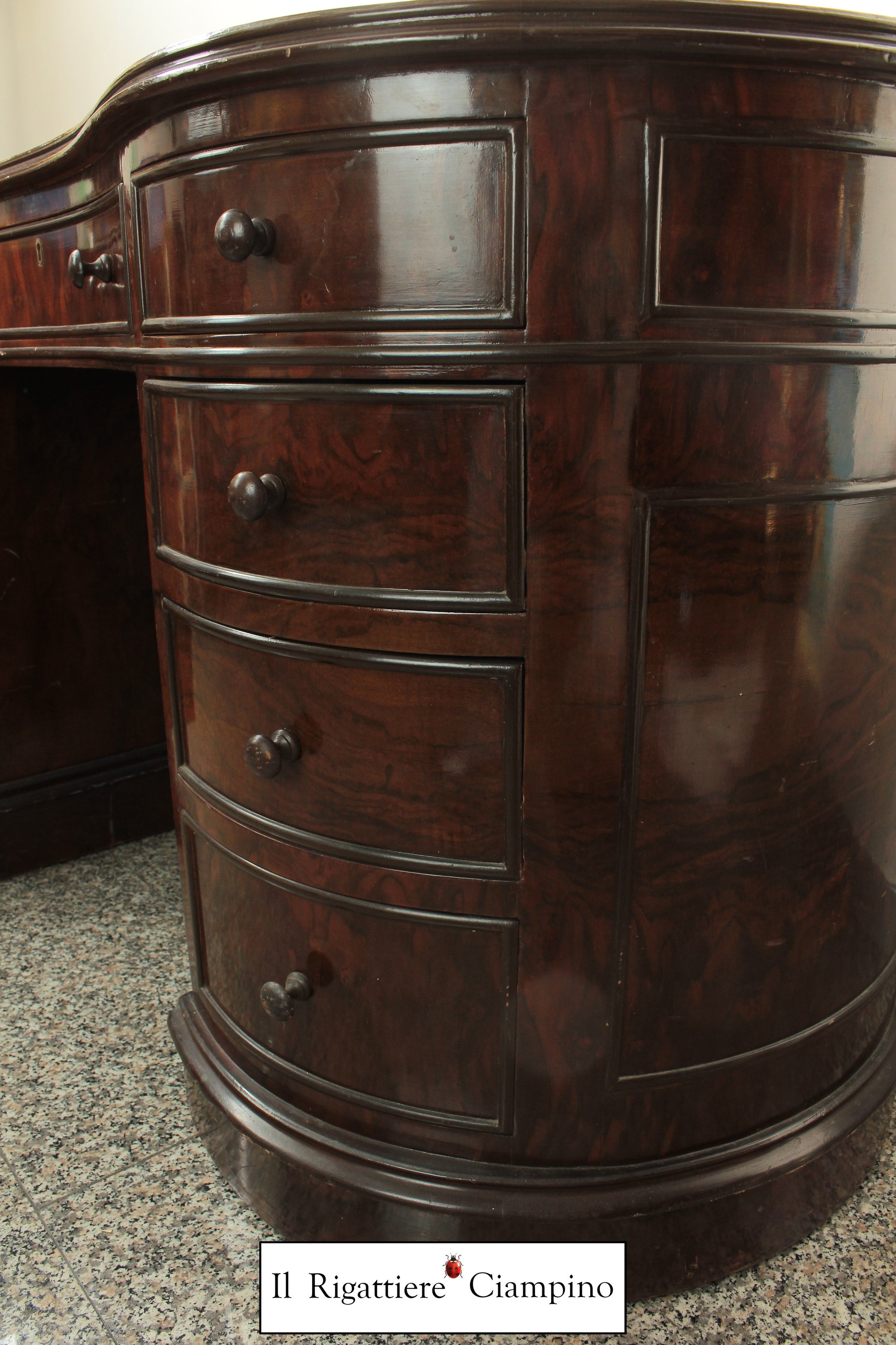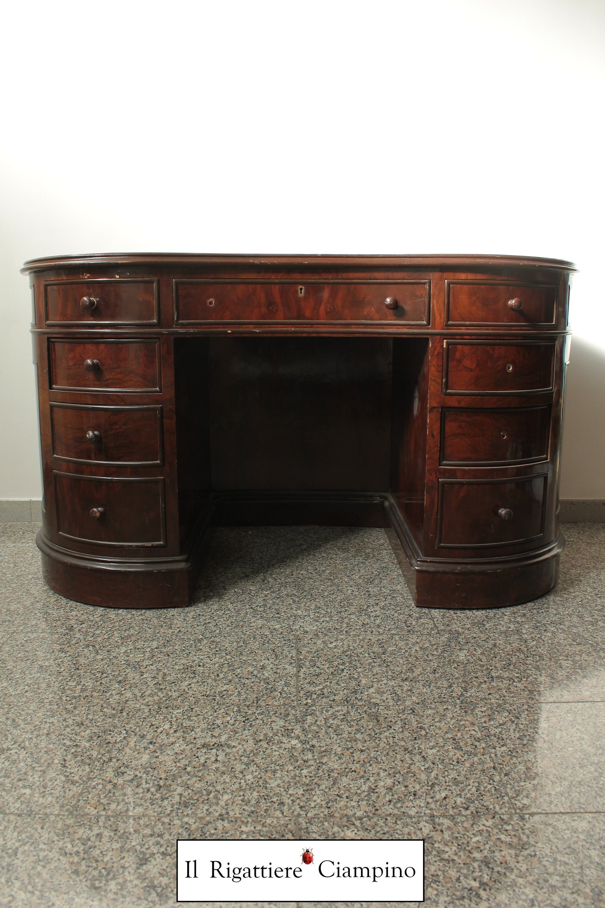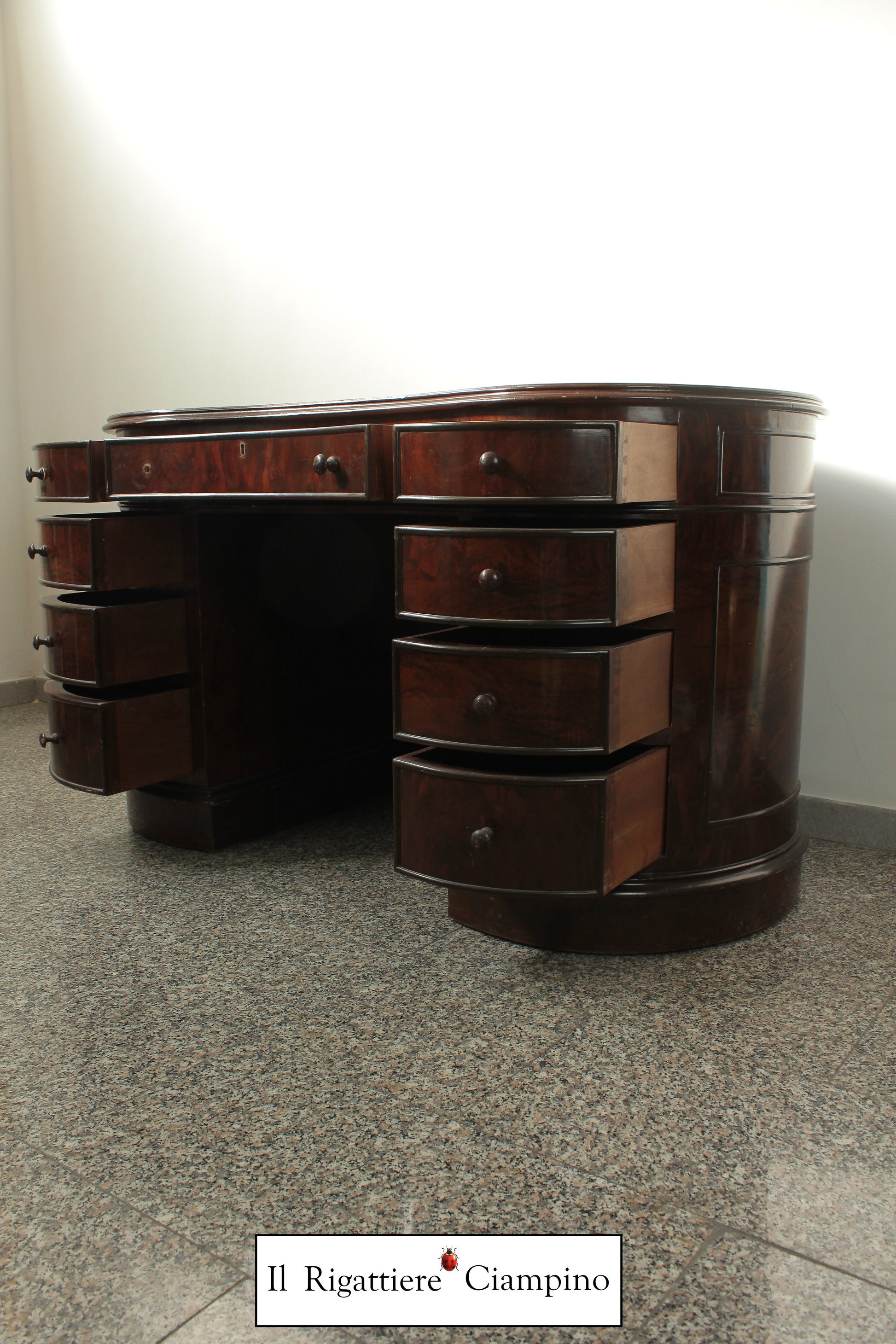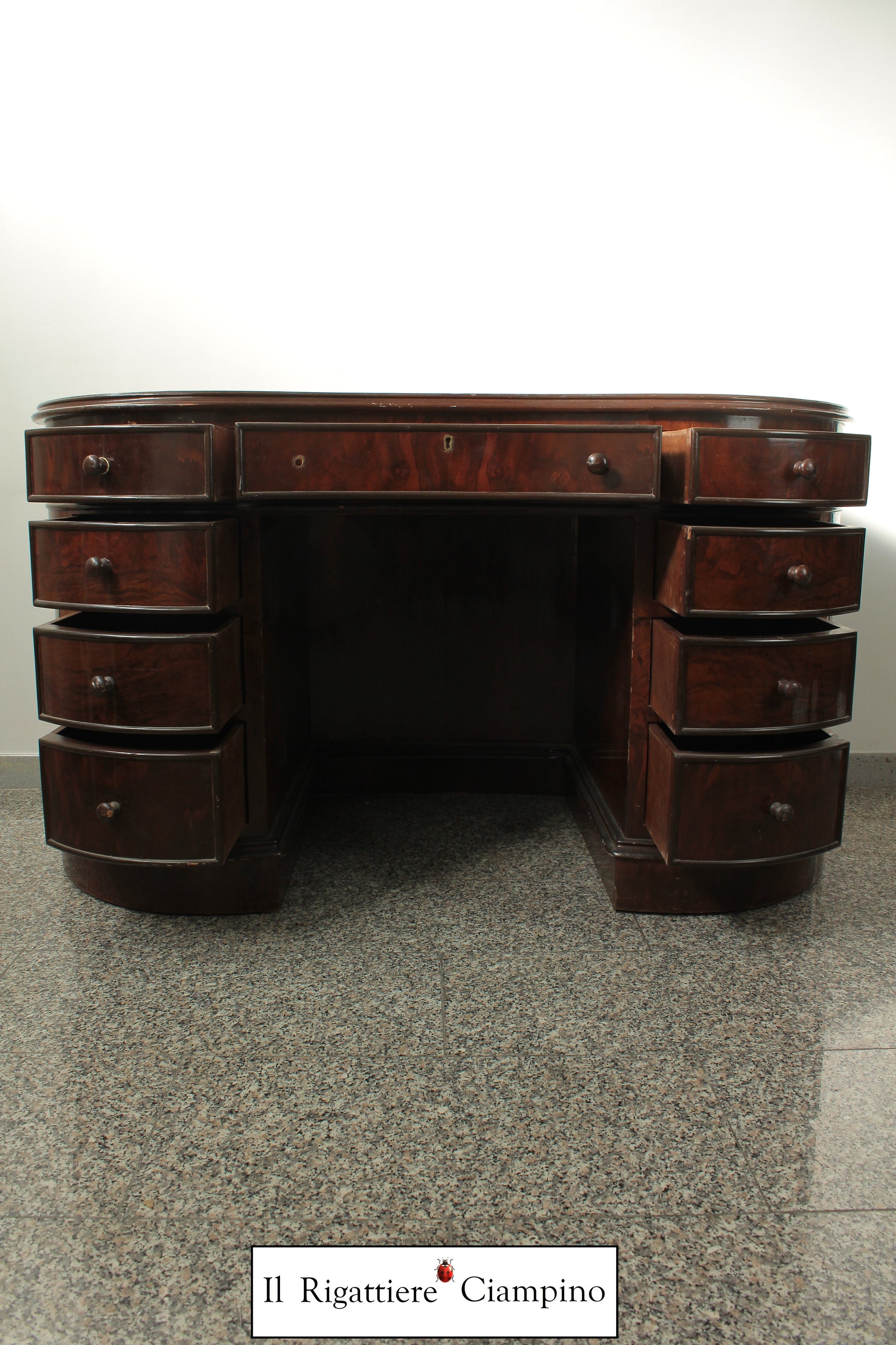 Il Rigattiere Ciampino propone un magnifica scrivania in radica nazionale, stondata a forma di fagiolo. Dotata di cassetti a sinistra e a destra, uno anche al centro, questa scrivania è perfetta per chi deve scrivere in un ambiente elegante e ordinato. Impreziosita da ecopelle sul piano di lavoro. Dona un tocco elegante al tuo studio con questo pezzo d'artigianato di qualità.