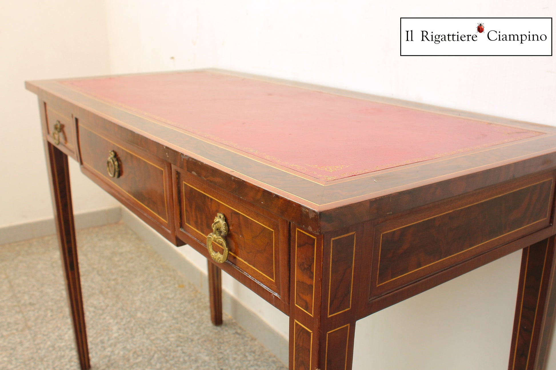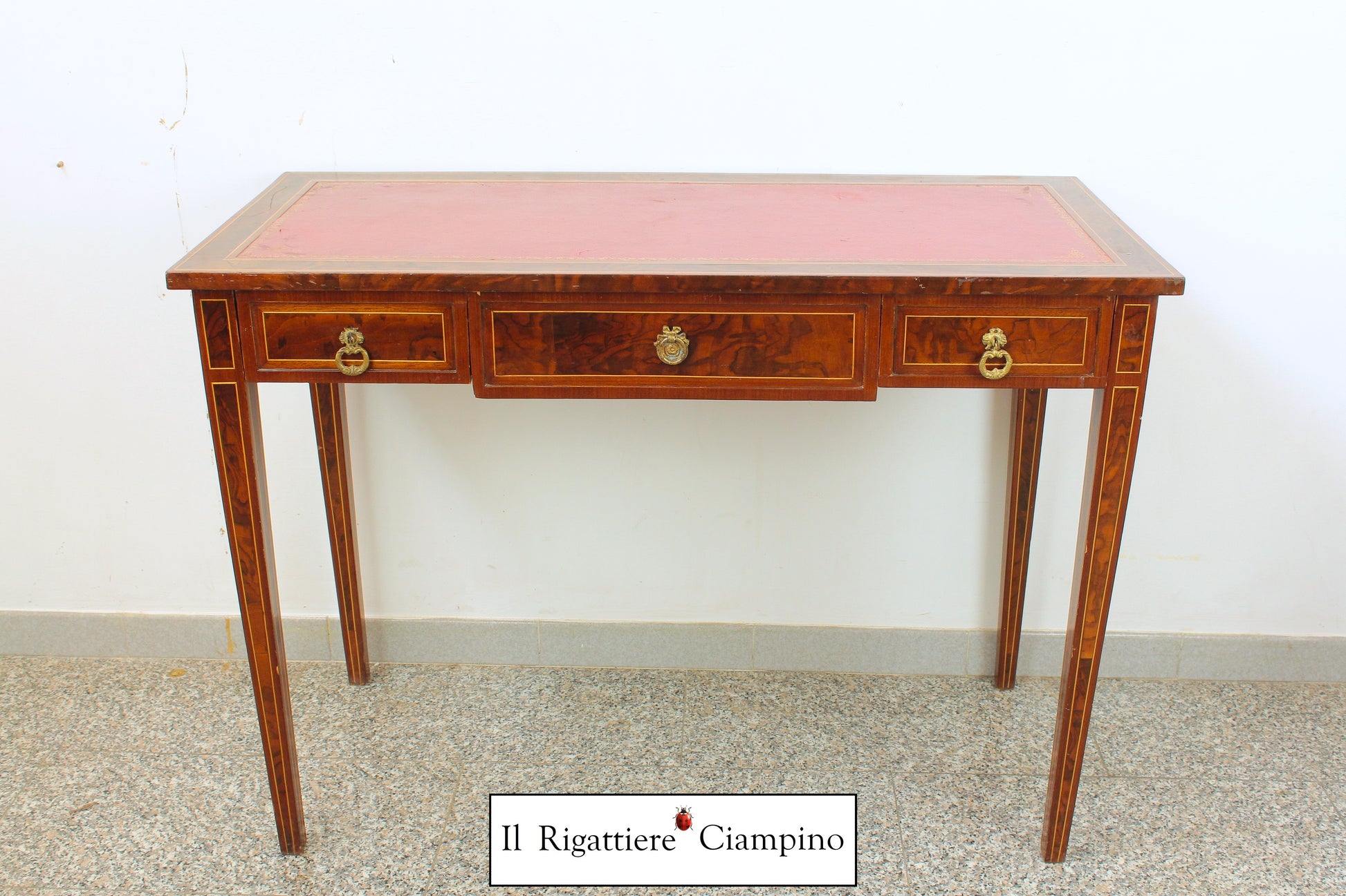 Il Rigattiere Ciampino propone uno splendido scrivania in radica di noce. Piano in ecopelle rosso bordeaux. Maniglie e rifiniture in ottone. Dotata di tre cassetti, questa scrivania è perfetta per chi vuole scrivere in un ambiente ricercato e ordinato. Dona un tocco elegante al tuo studio con questo pezzo d'artigianato di qualità.
