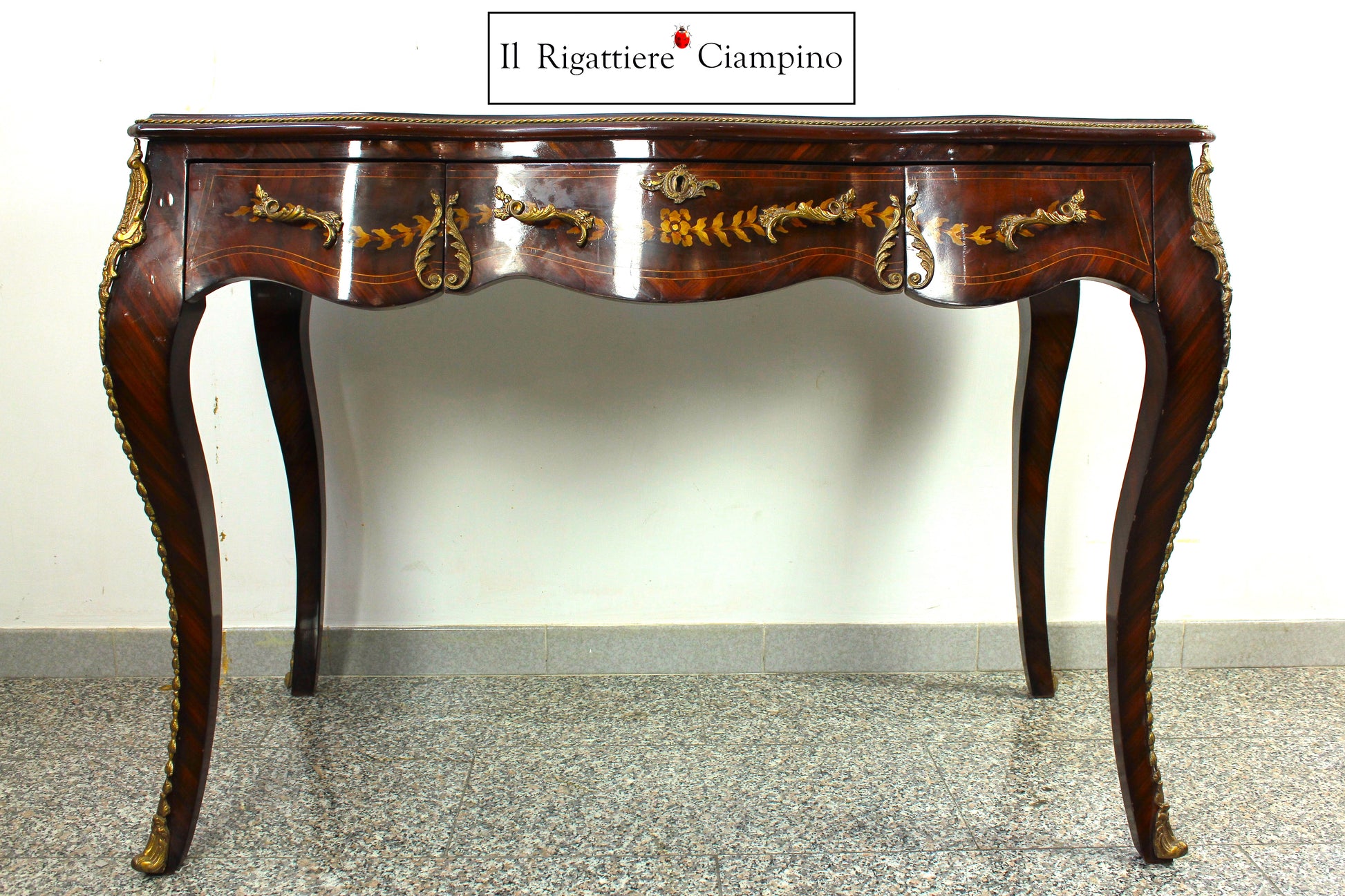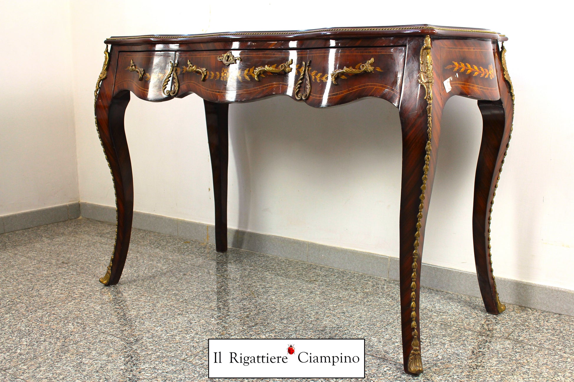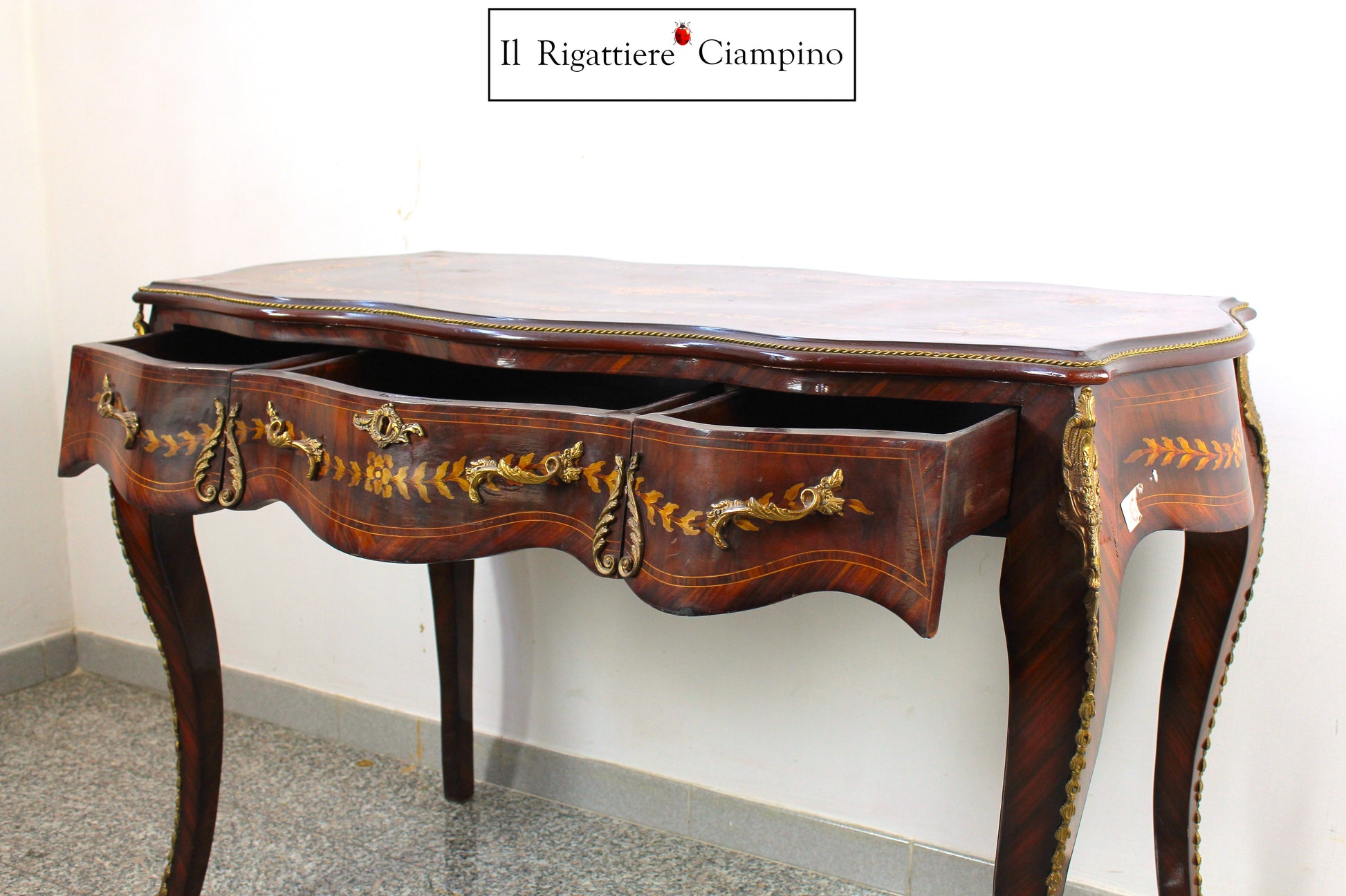 Il Rigattiere Ciampino propone uno splendido scrivania in radica di noce. Maniglie e rifiniture in ottone. Dotata di cassetti, questa scrivania è perfetta per chi vuole scrivere in un ambiente ricercato e ordinato. Dona un tocco elegante al tuo studio con questo pezzo d'artigianato di qualità.