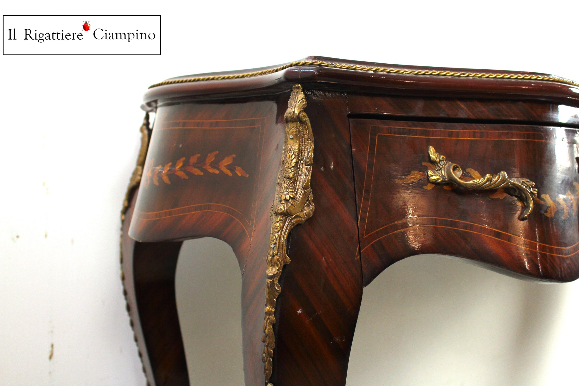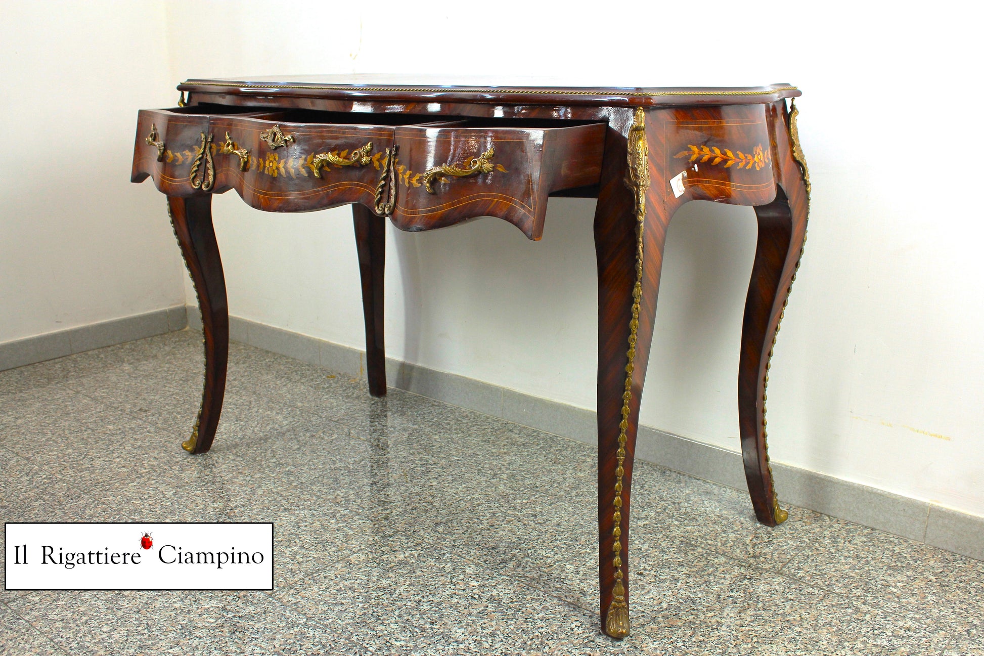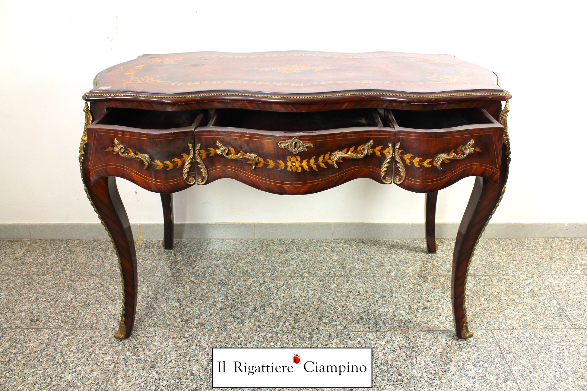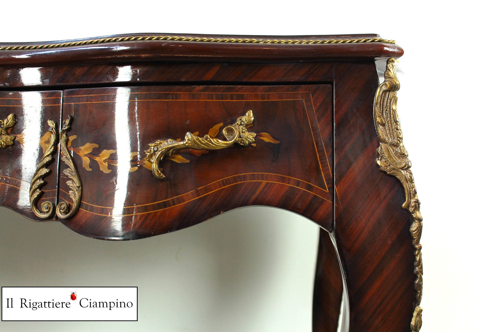 Il Rigattiere Ciampino propone uno splendido scrivania in radica di noce. Maniglie e rifiniture in ottone. Dotata di cassetti, questa scrivania è perfetta per chi vuole scrivere in un ambiente ricercato e ordinato. Dona un tocco elegante al tuo studio con questo pezzo d'artigianato di qualità.