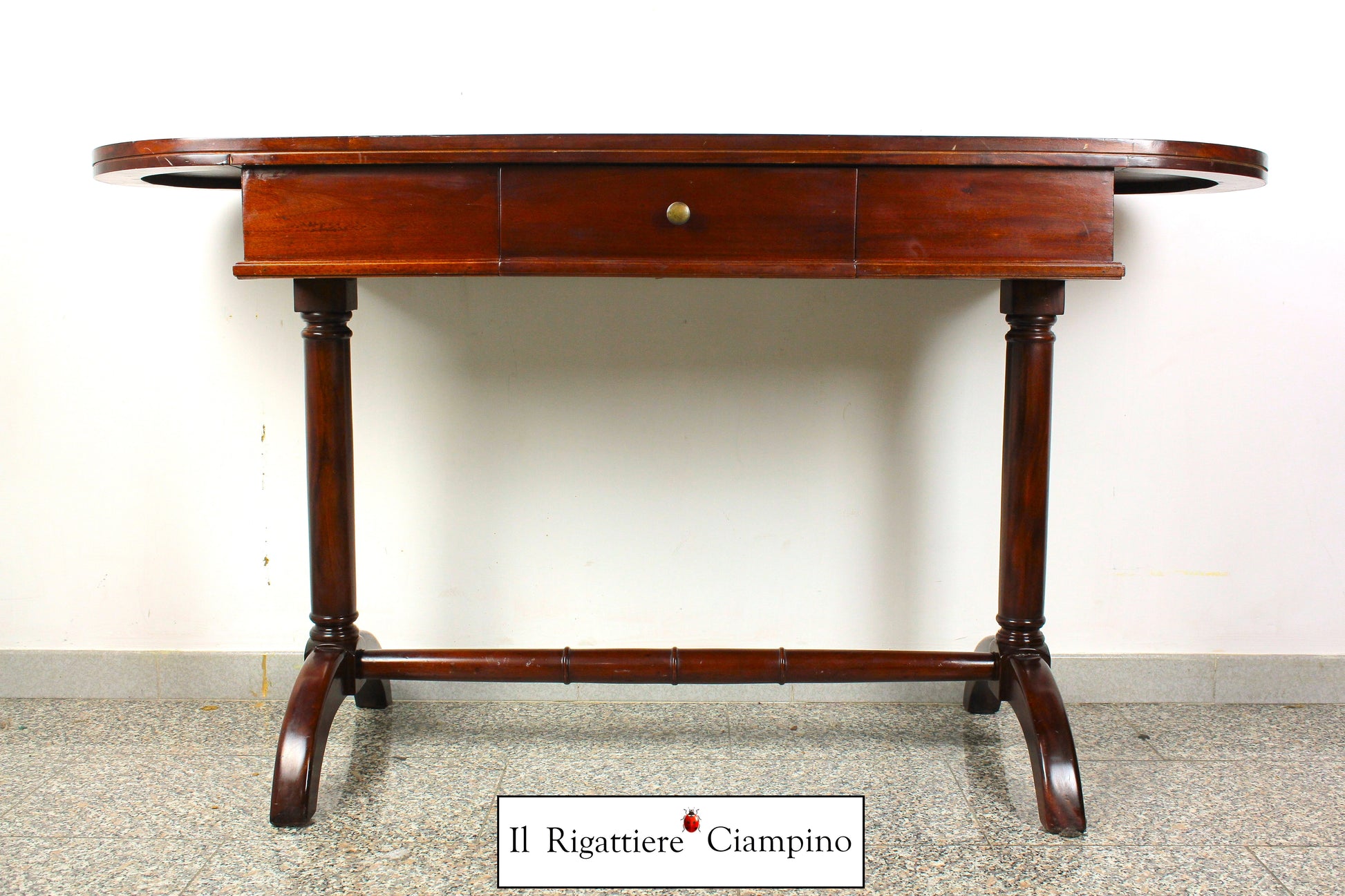 Il Rigattiere Ciampino propone una splendida scrivania in legno mogano massello. Dotata di un cassetto, questa scrivania è perfetta per chi deve scrivere o digitare in un ambiente largo e comodo. La qualità del legno mogano rende eleganza, durevolezza e un impatto visivo maggiore. Dona un tocco elegante al tuo studio con questo pezzo d'artigianato di qualità.