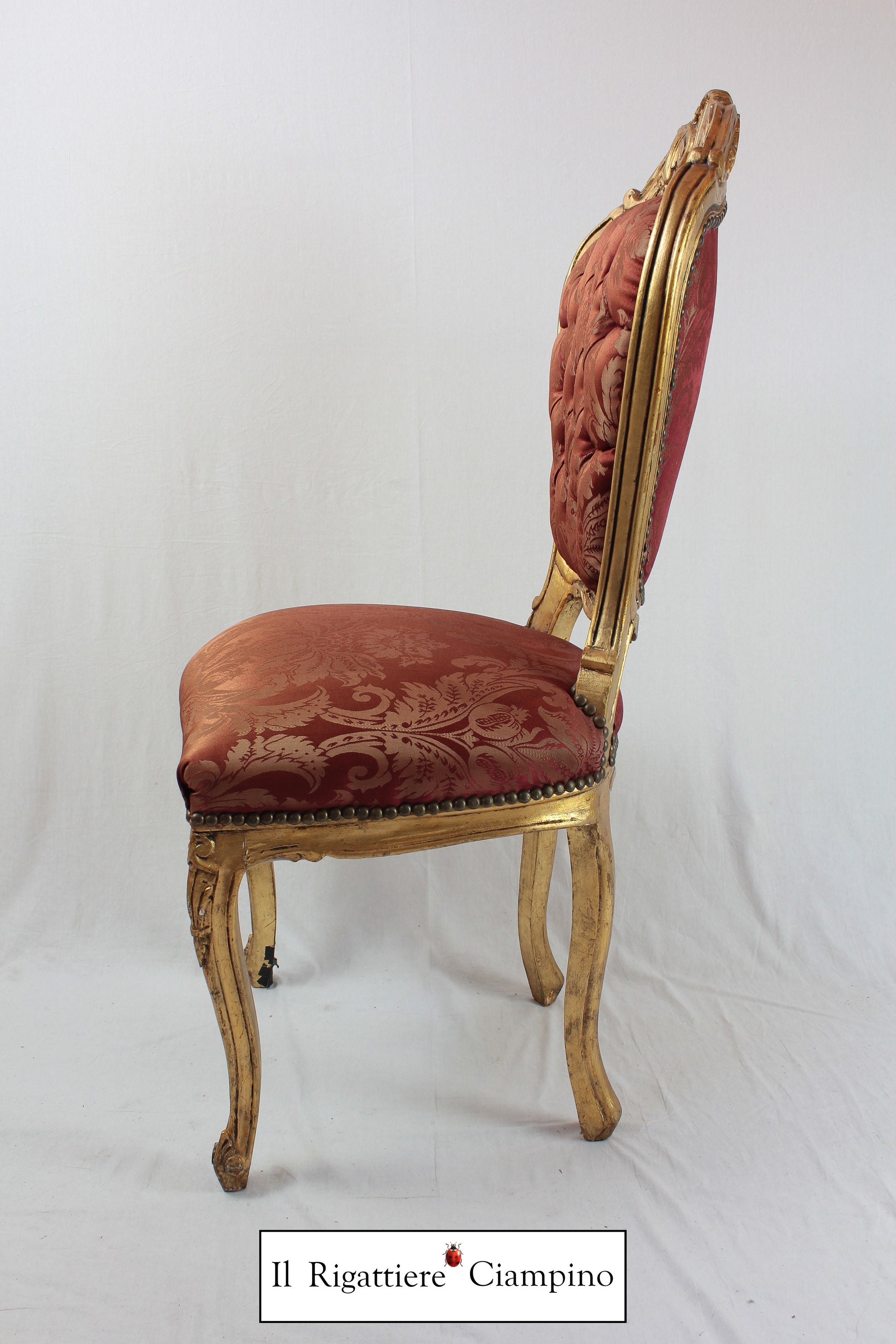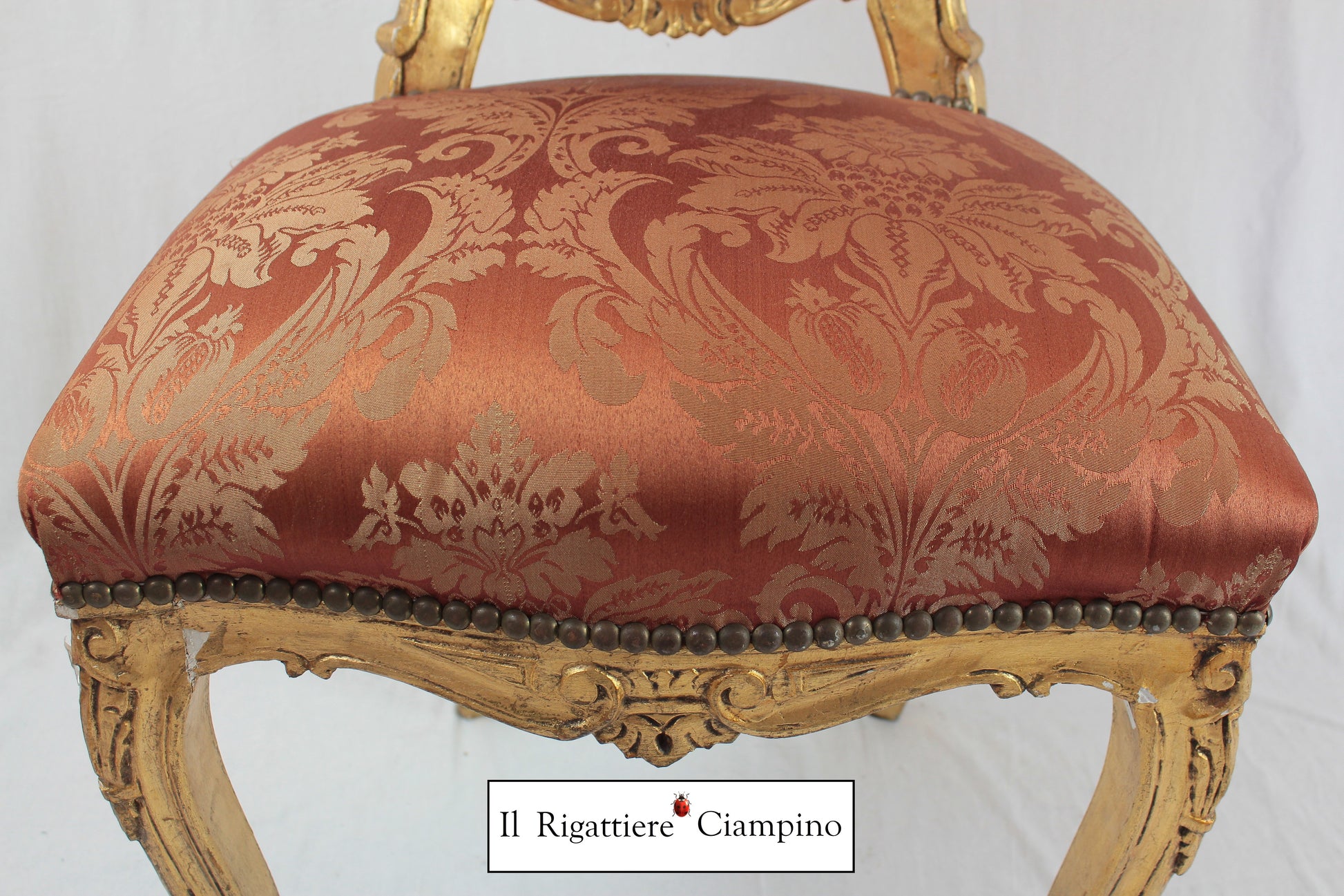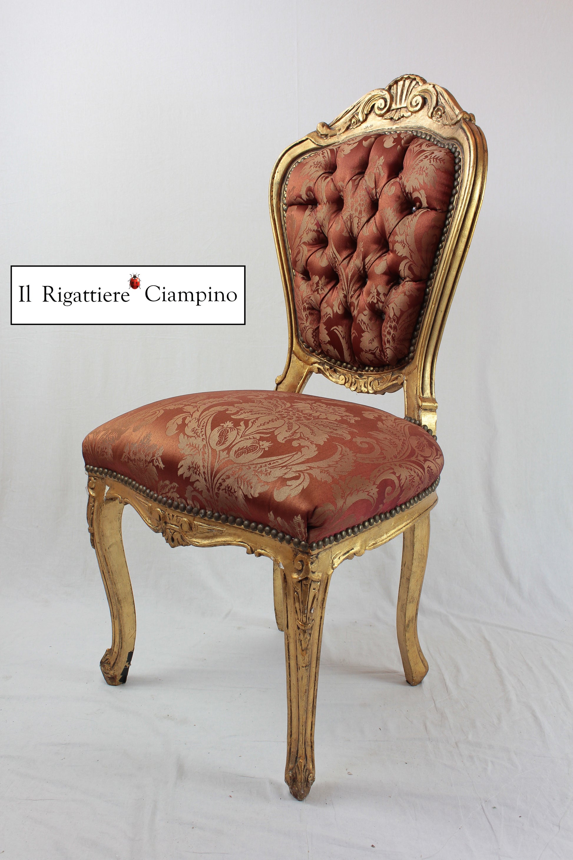 Il Rigattiere Ciampino propone una maestosa sedia in stile barocco, con struttura in legno massello coperto in foglia oro e rivestita con tessuto damascato. Ottima per dare al tuo studio un tocco vivace e d'impatto.