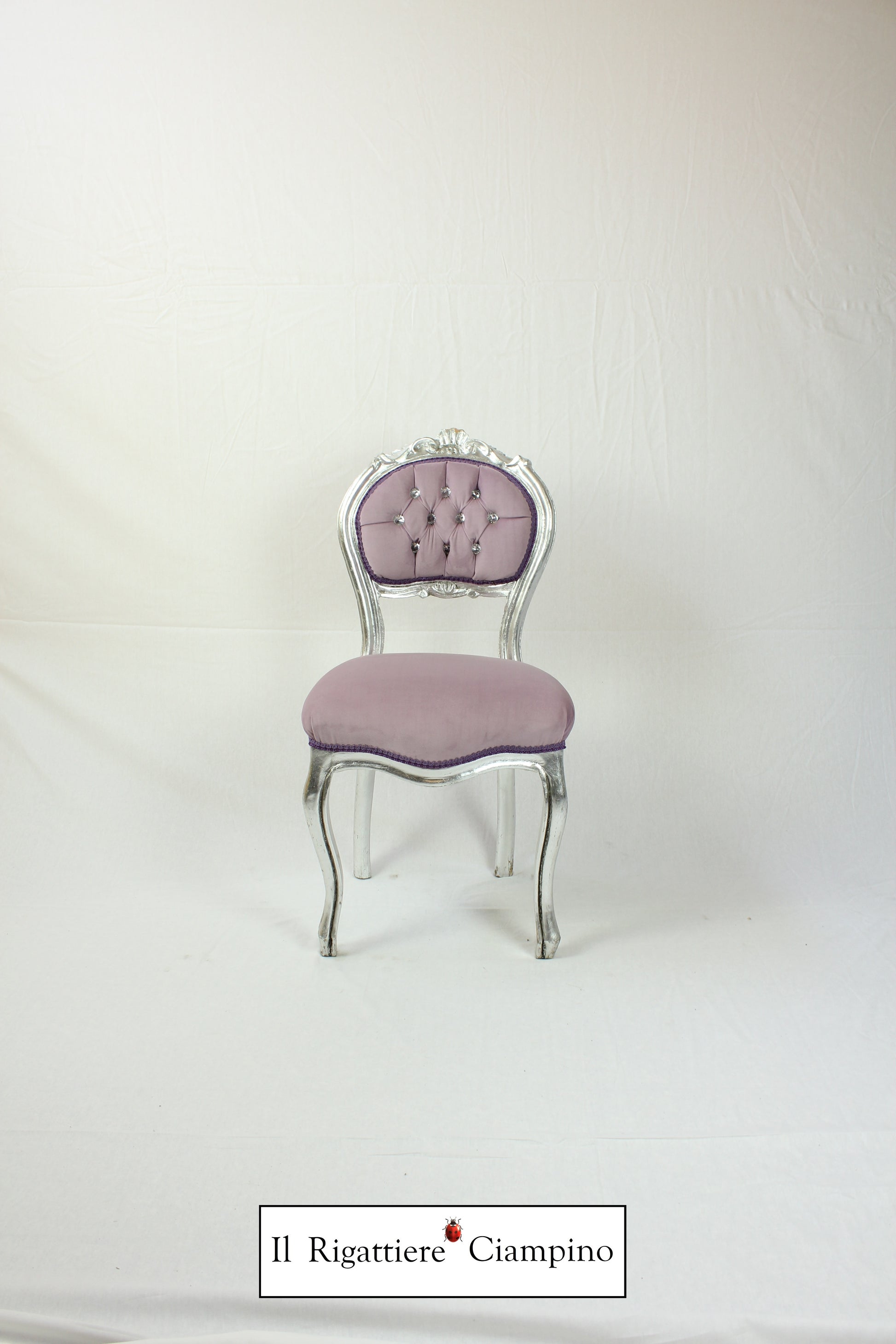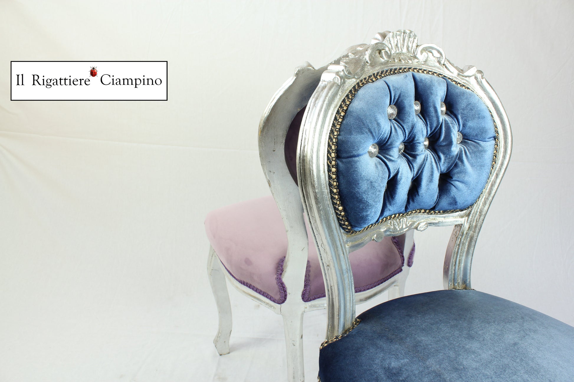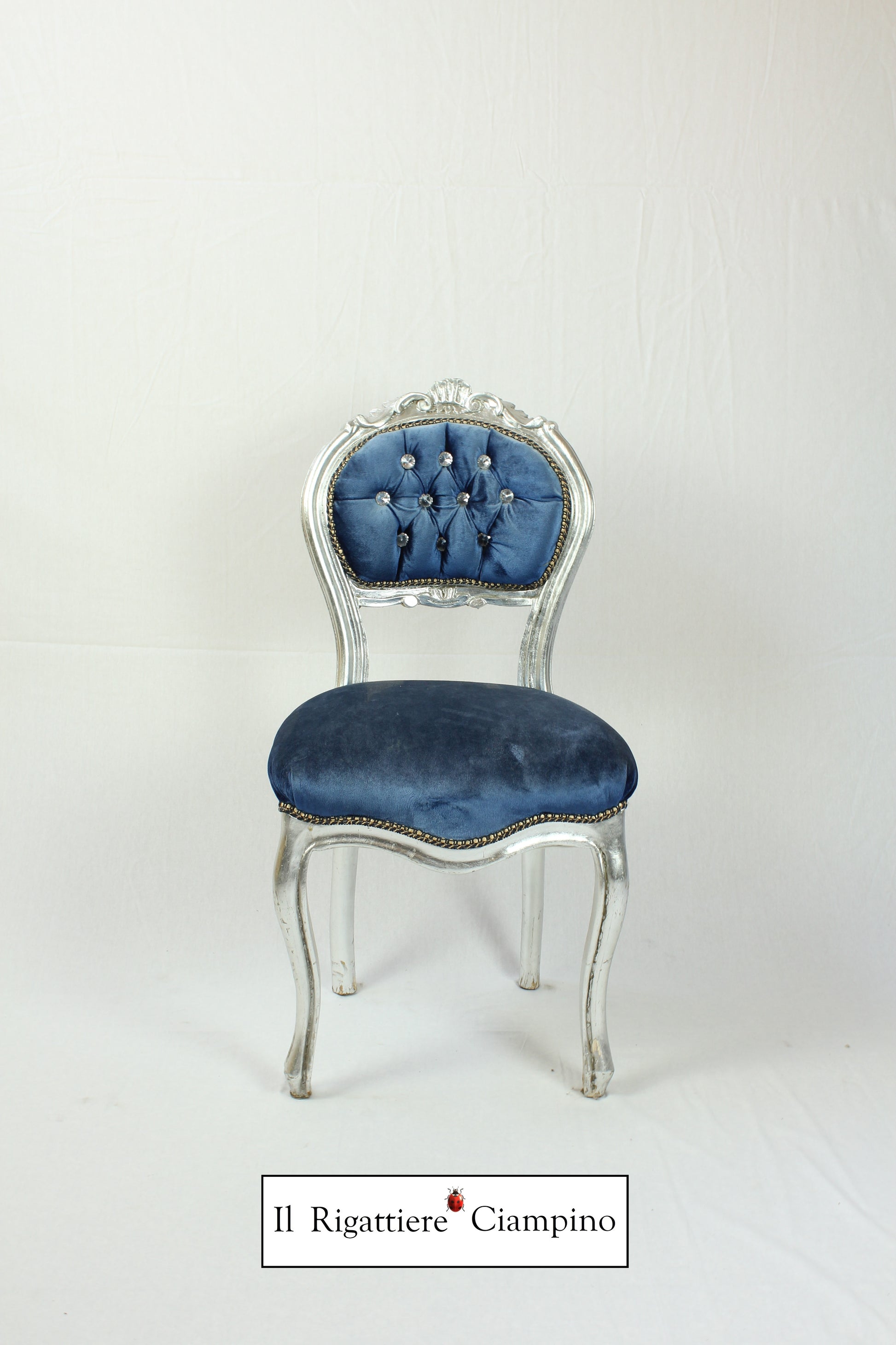 Il Rigattiere Ciampino propone una graziosa sedia di piccole dimensioni in stile barocco, con rivestimenti vari, anche personalizzabili. Adornate con lavorazione Capitonné e bottoni Swarovski, queste sedie sono ideali per chi vuole rendere l'ambiente più gioioso, colorato e luxury.
