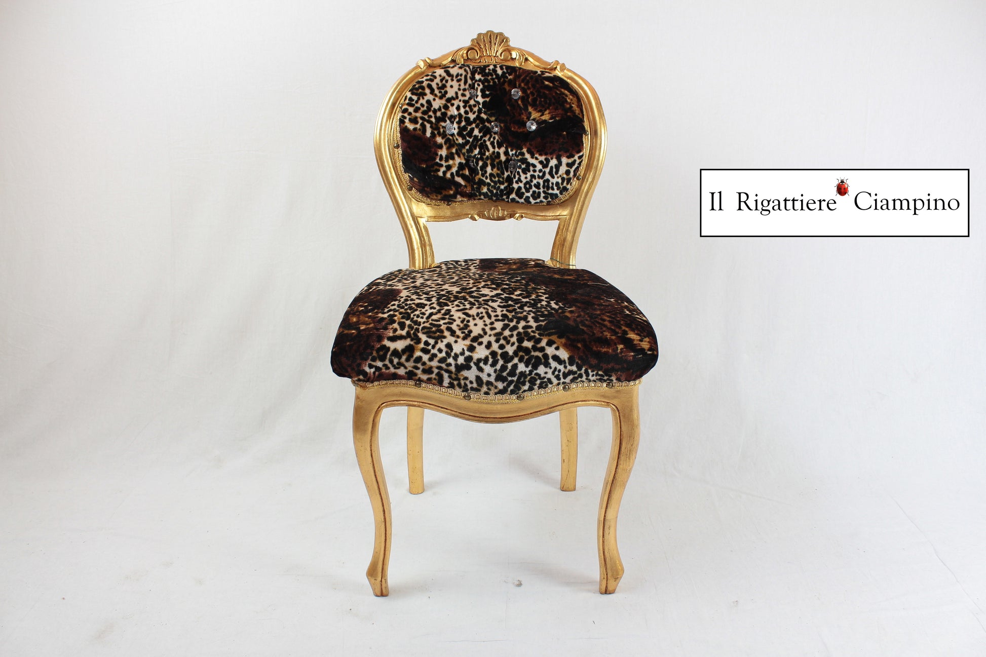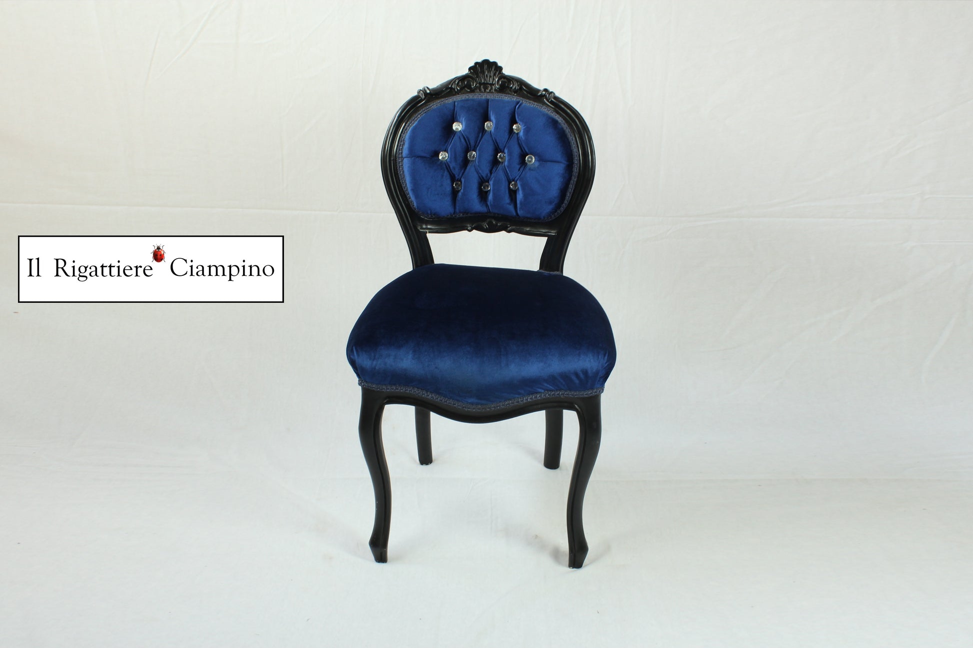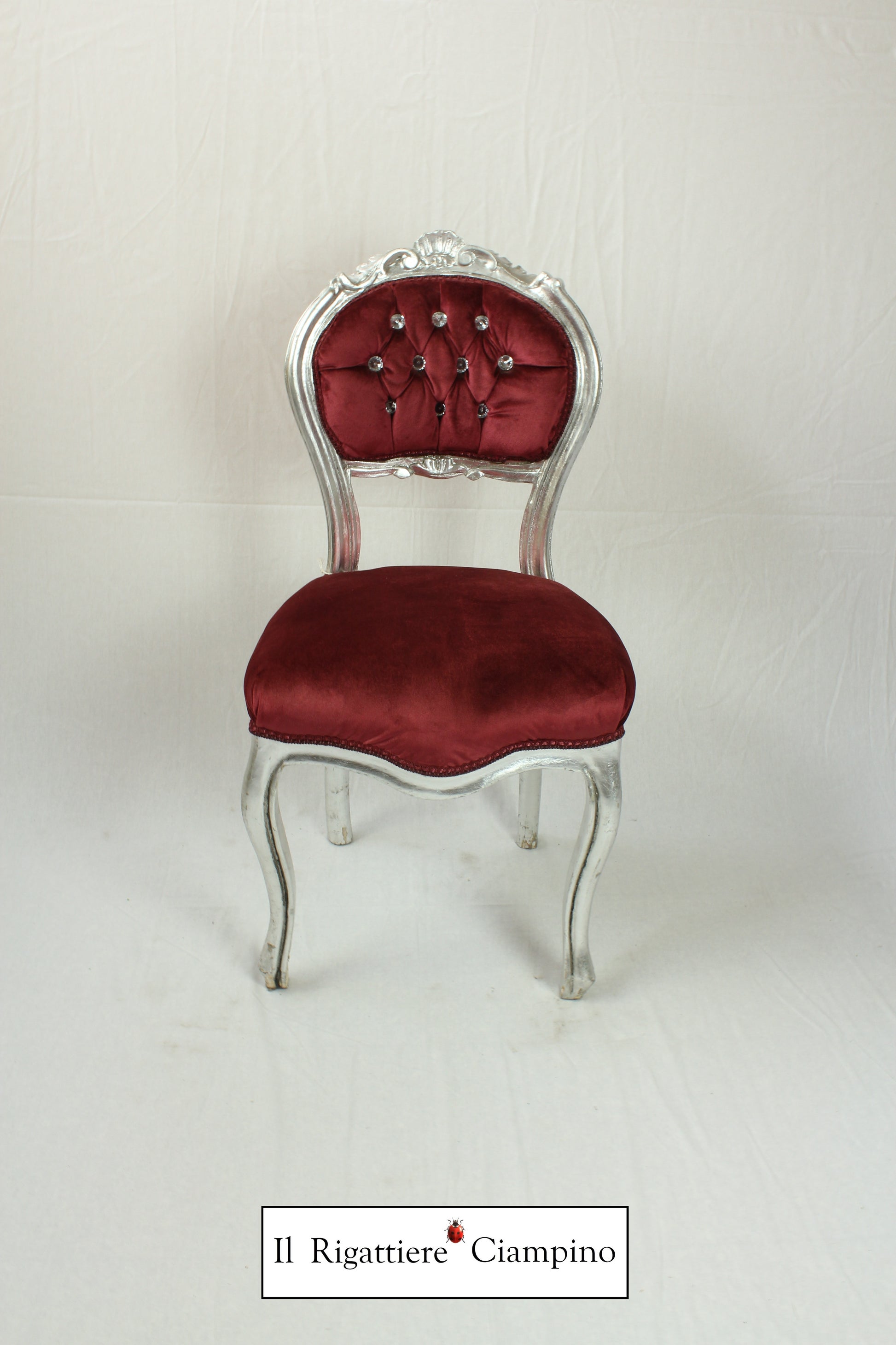 Il Rigattiere Ciampino propone una graziosa sedia di piccole dimensioni in stile barocco, con rivestimenti vari, anche personalizzabili. Adornate con lavorazione Capitonné e bottoni Swarovski, queste sedie sono ideali per chi vuole rendere l'ambiente più gioioso, colorato e luxury.