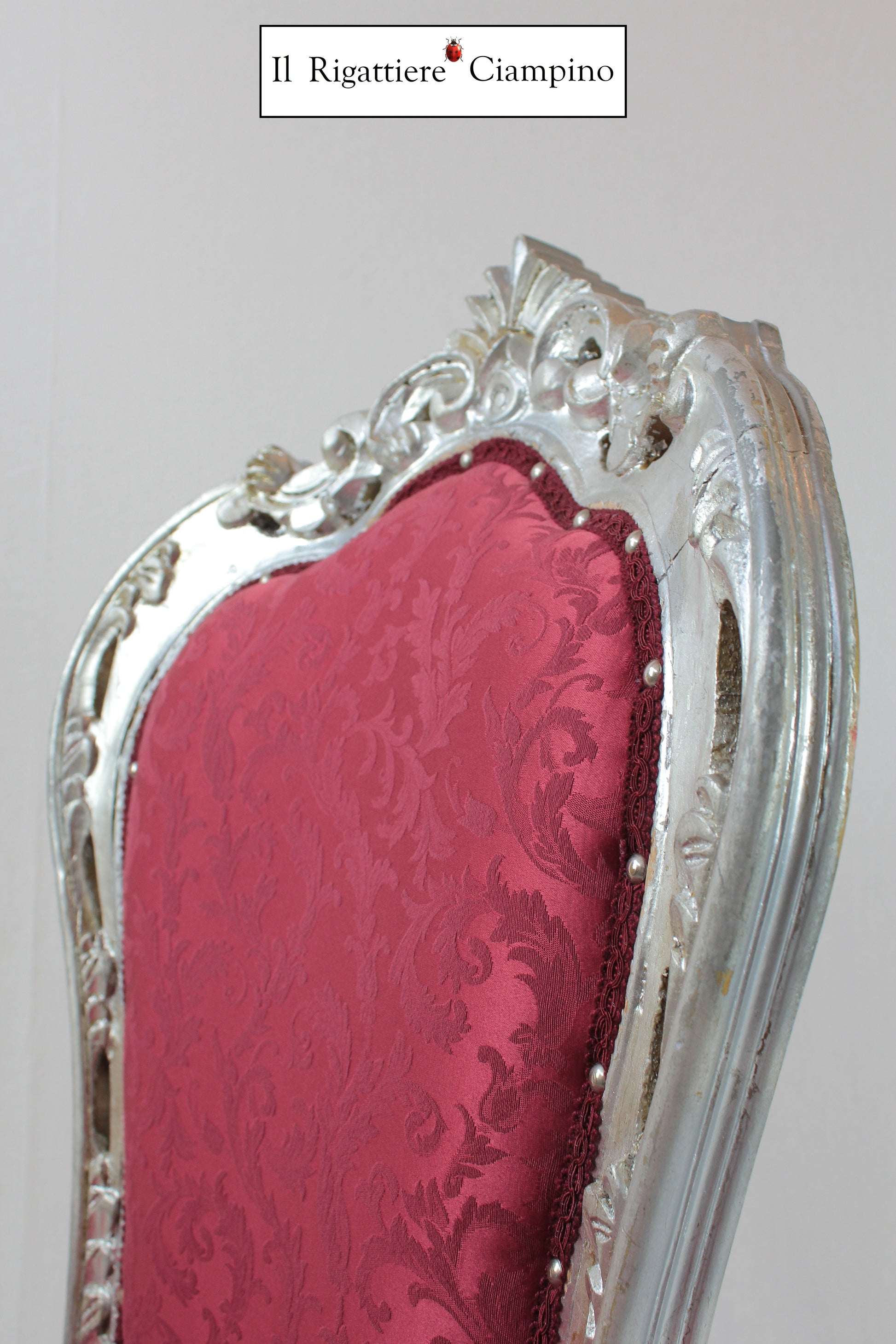 Il Rigattiere Ciampino propone una sedia modello Giorgia, con struttura in foglia argento, rivestita con tessuto damascato di colore bordeaux. Tutti i colori disponibili, anche scelti da Voi! Per donare armonia e luminosità al tuo salotto.