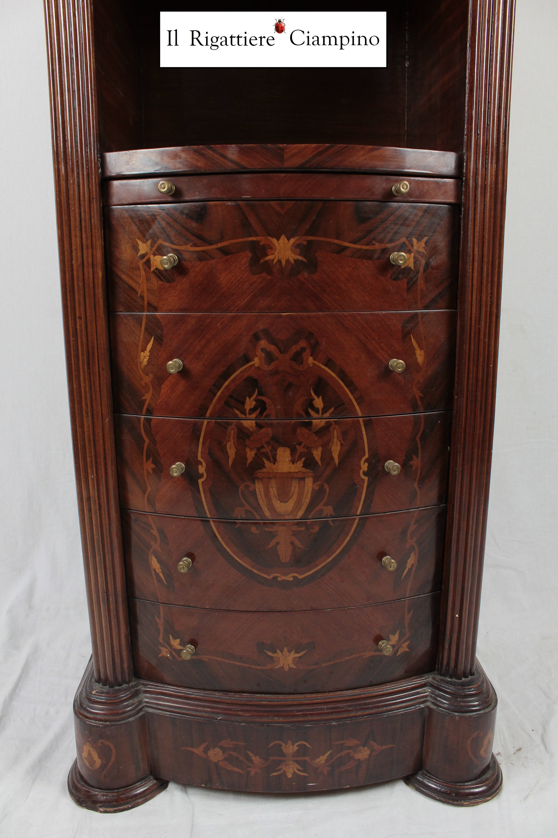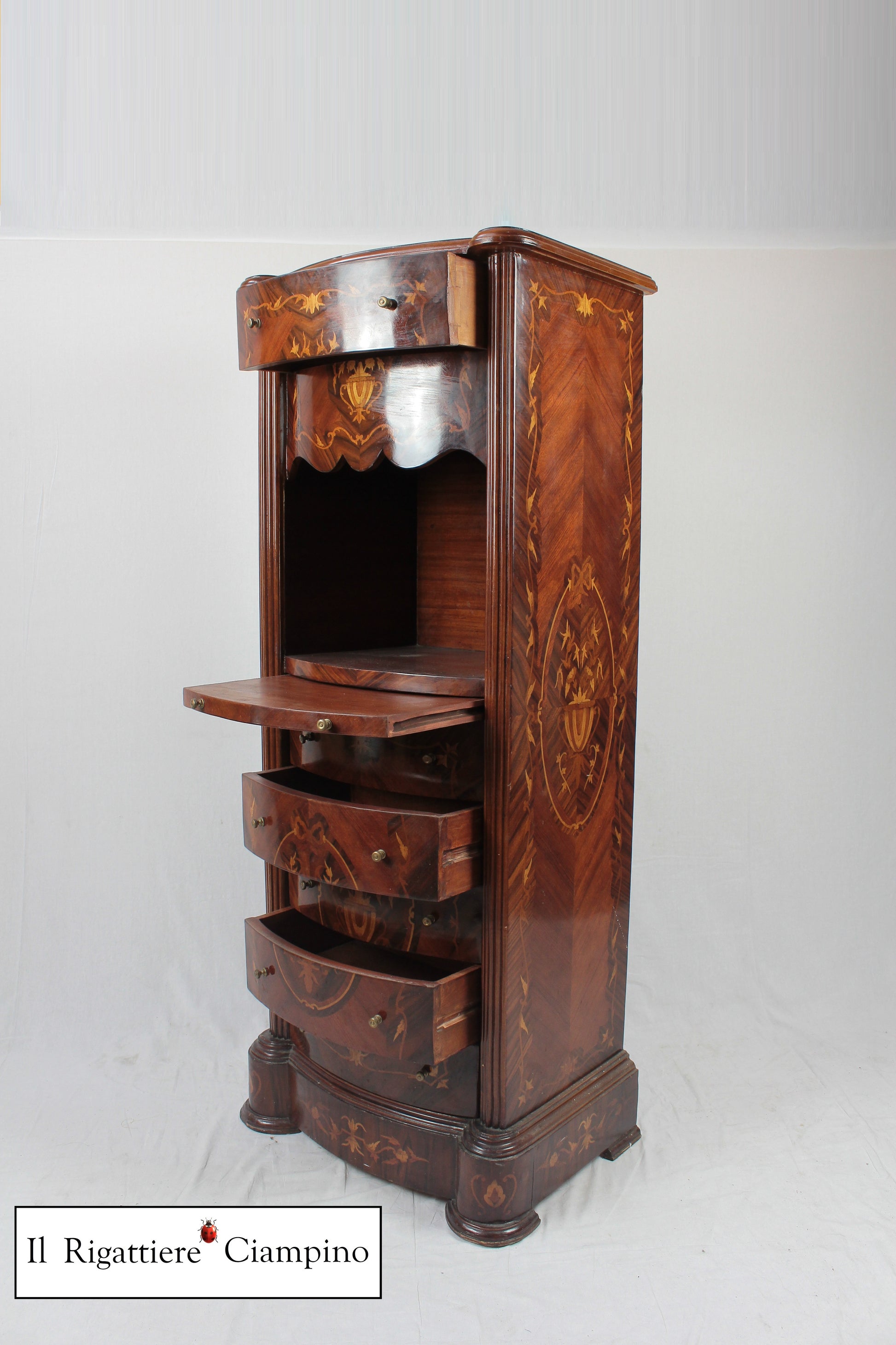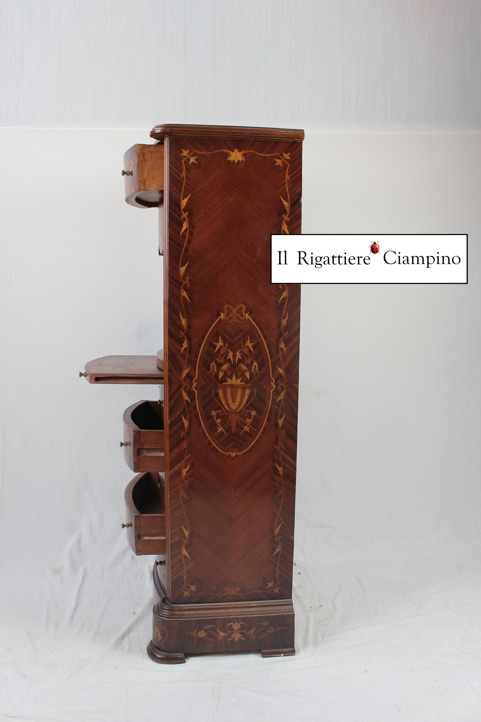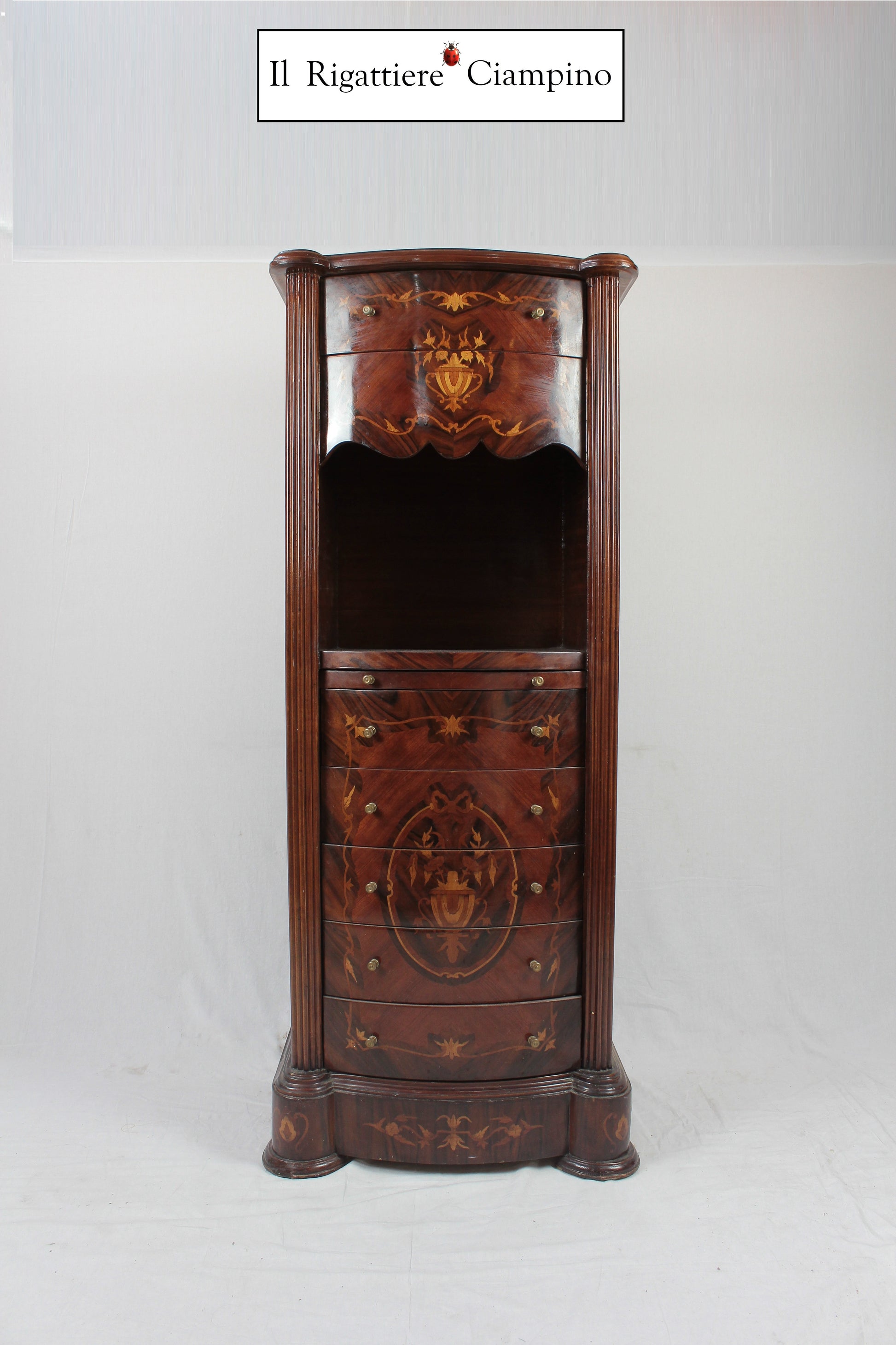 Il Rigattiere Ciampino propone un settimino in stile francese, in radica, dotato di 6 cassetti, con vano a mezza altezza e piano estraibile. Alto e comodo per riporre gli oggetti da non tenere in vista, con scrivania. Pomelli in ottone.