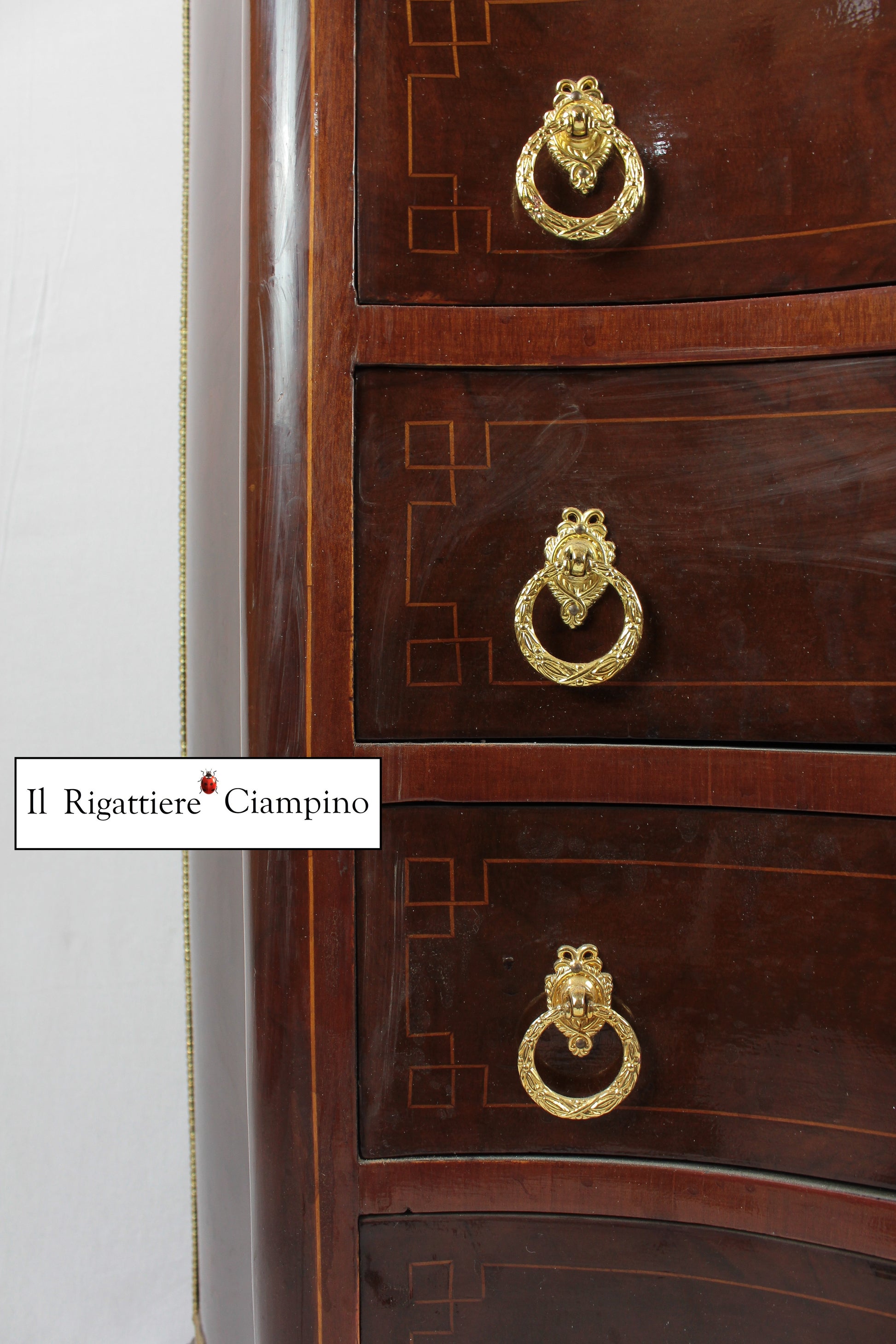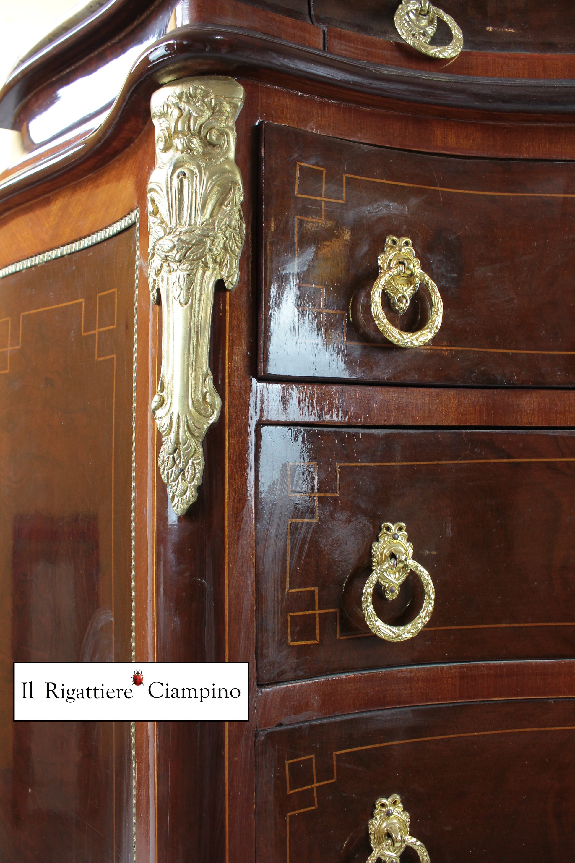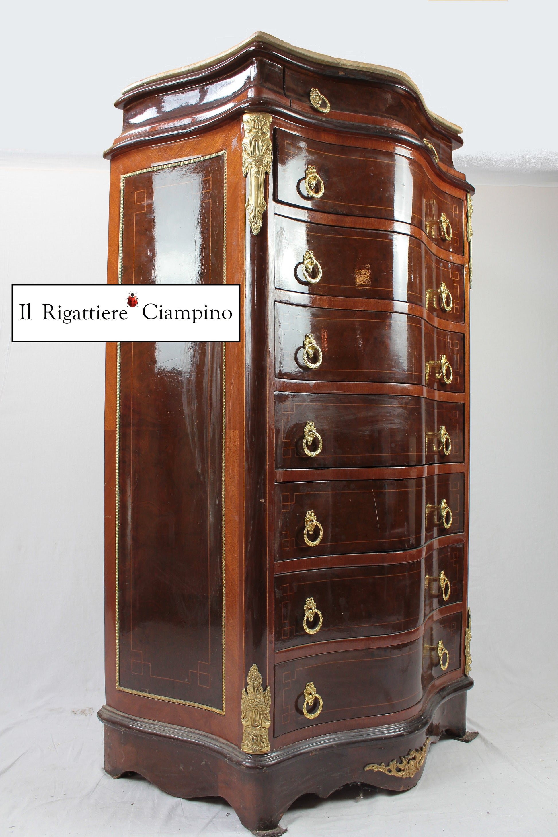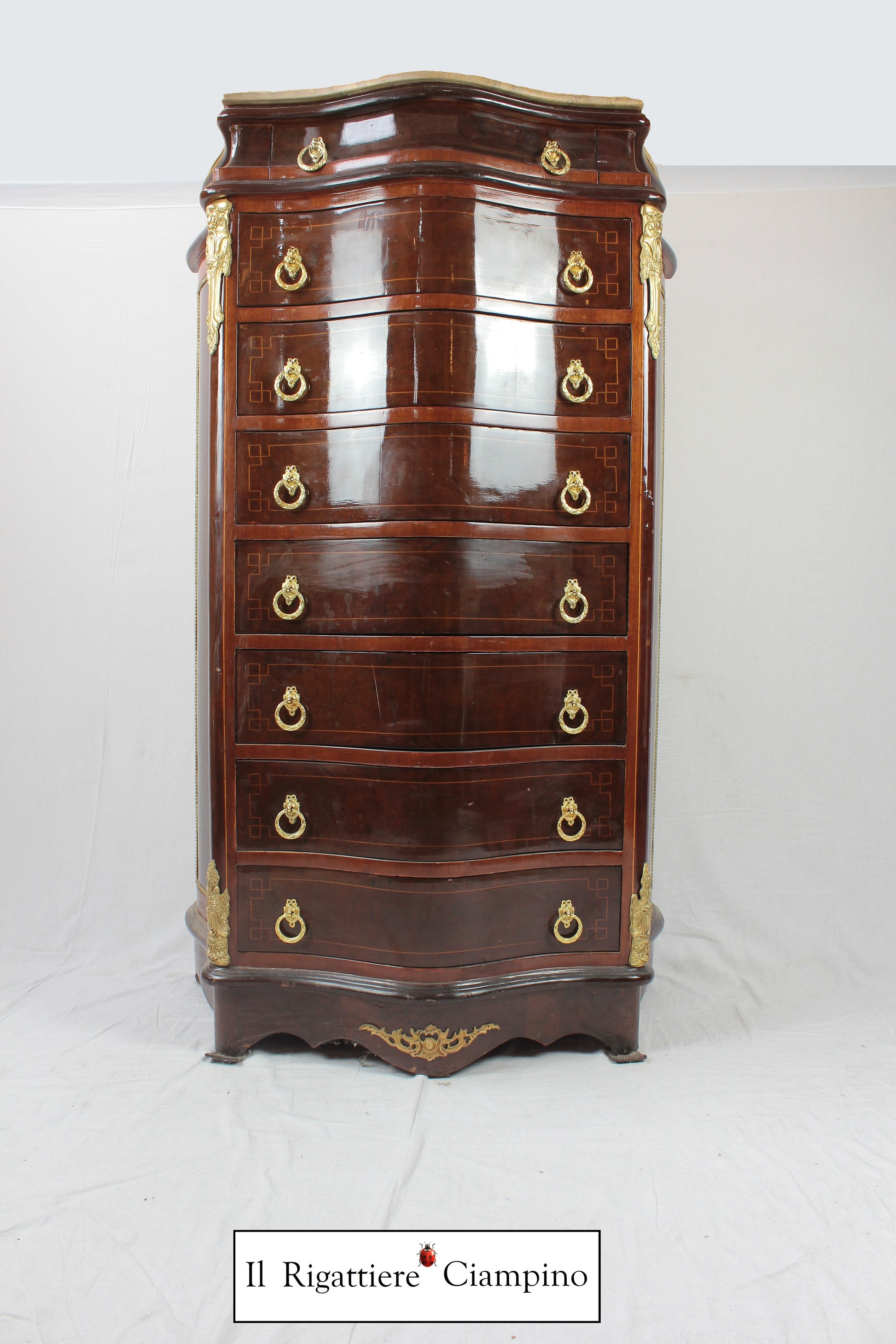 Il Rigattiere Ciampino propone un settimino in stile francese, in radica di noce. Dotato di 7 cassetti e un cassettino superiore, questo mobile è alto e comodo per riporre gli oggetti da non tenere in vista. Piano in marmo. Pomelli in ottone, due per cassetto.