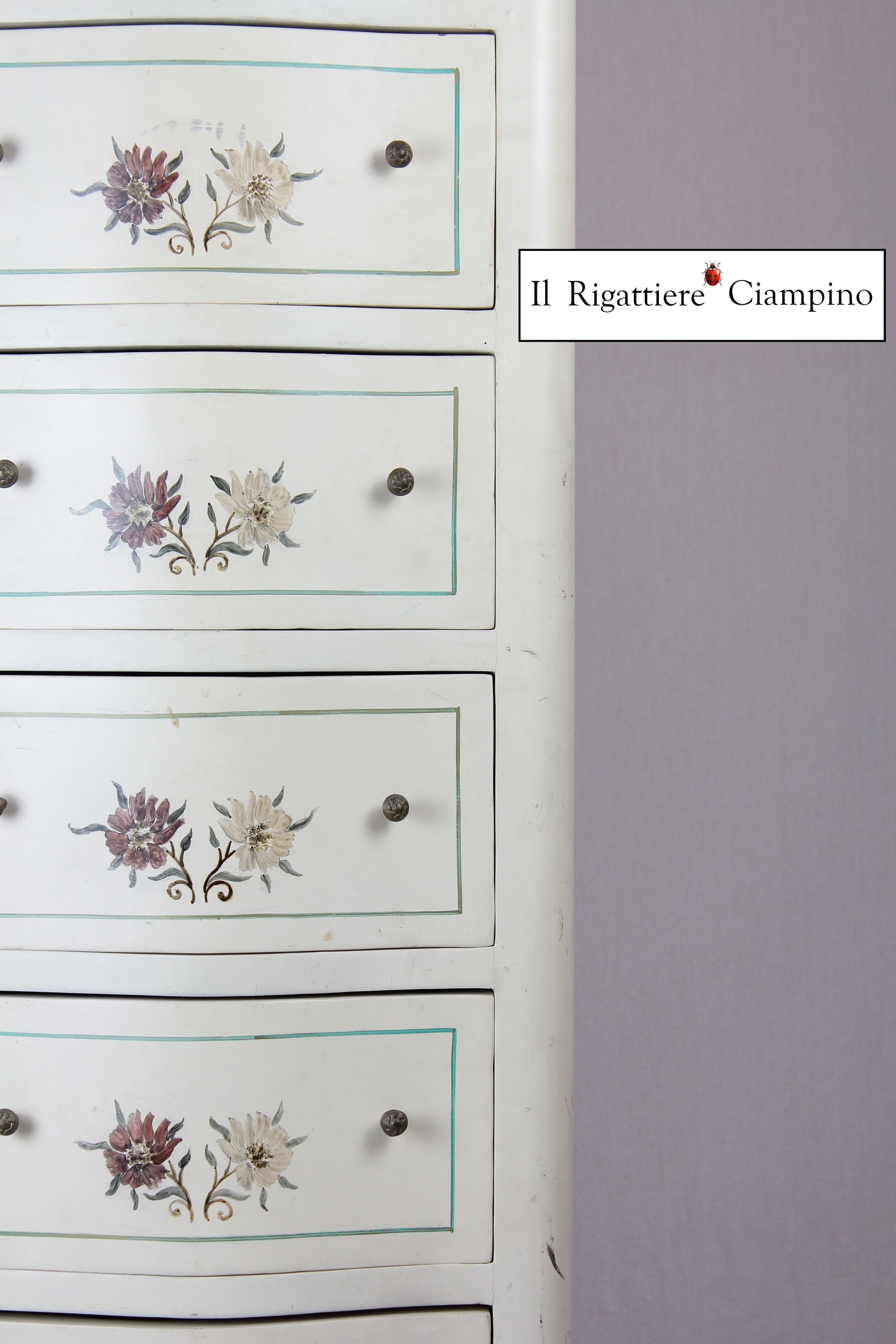 Il Rigattiere Ciampino propone un settimino in stile provenzale, di colore avorio con decorazioni floreali dipinte a mano. Dotato di 7 cassetti, alto e comodo per riporre gli oggetti da non tenere in vista. Pomelli in ottone, due per cassetto.