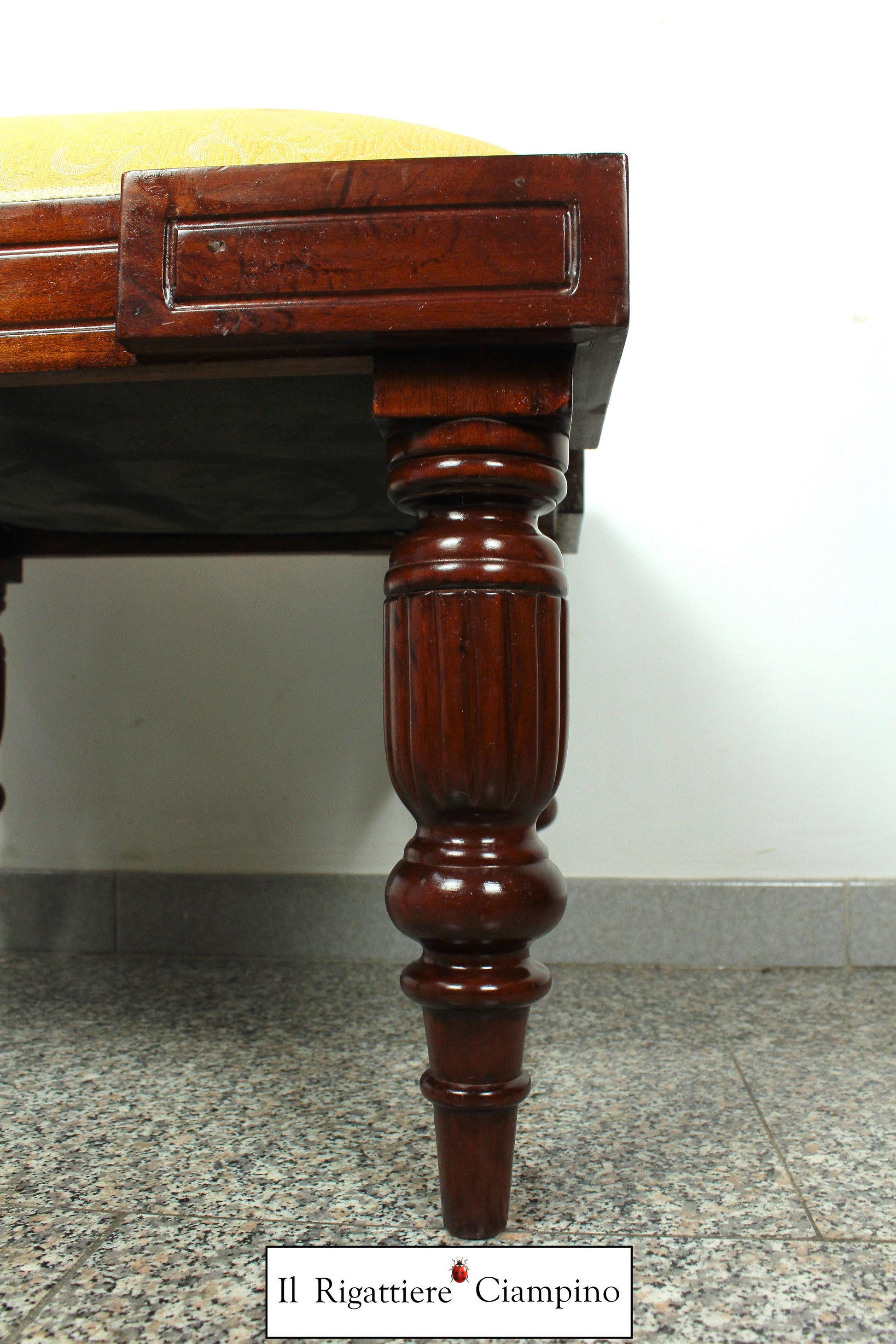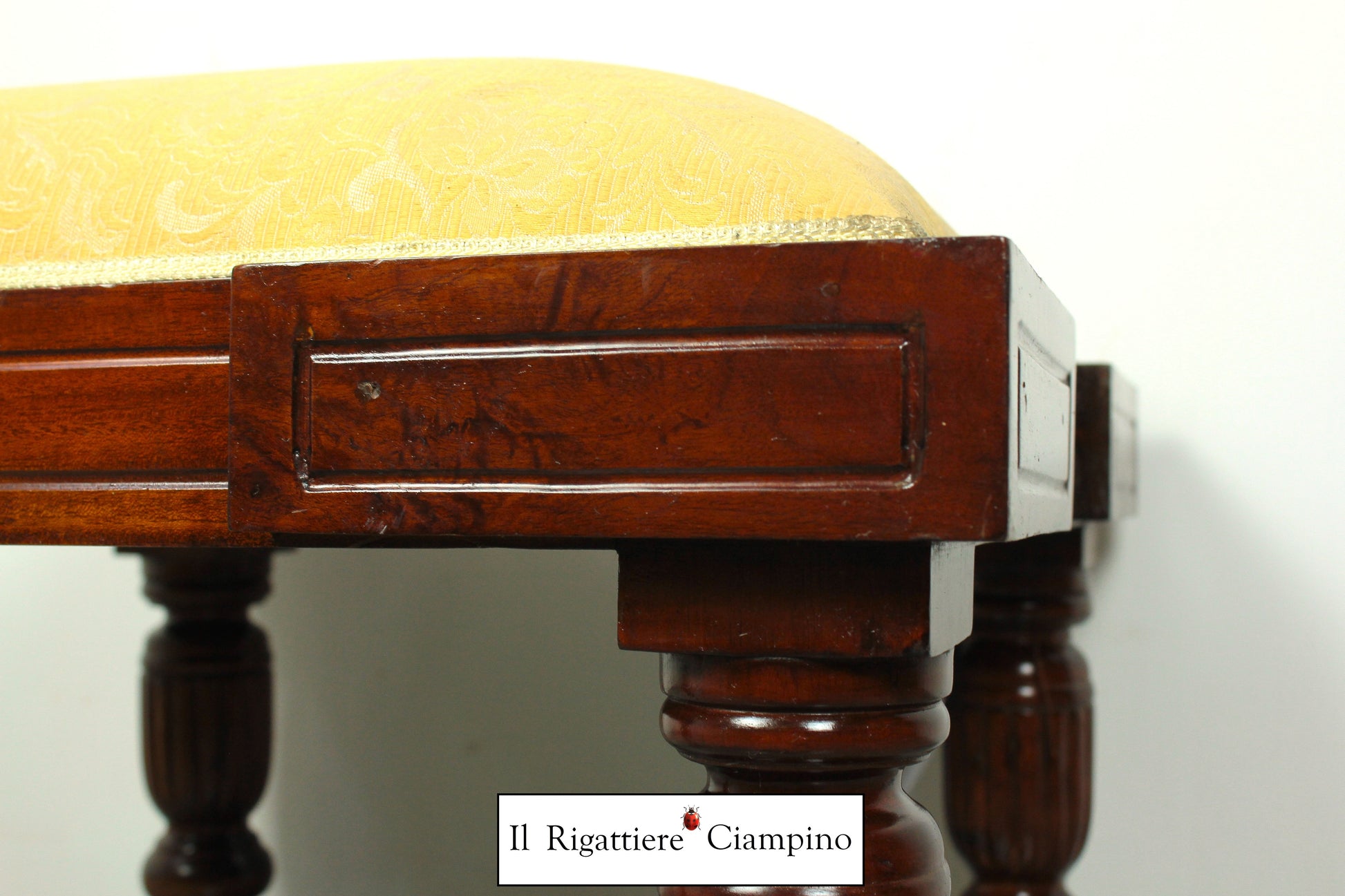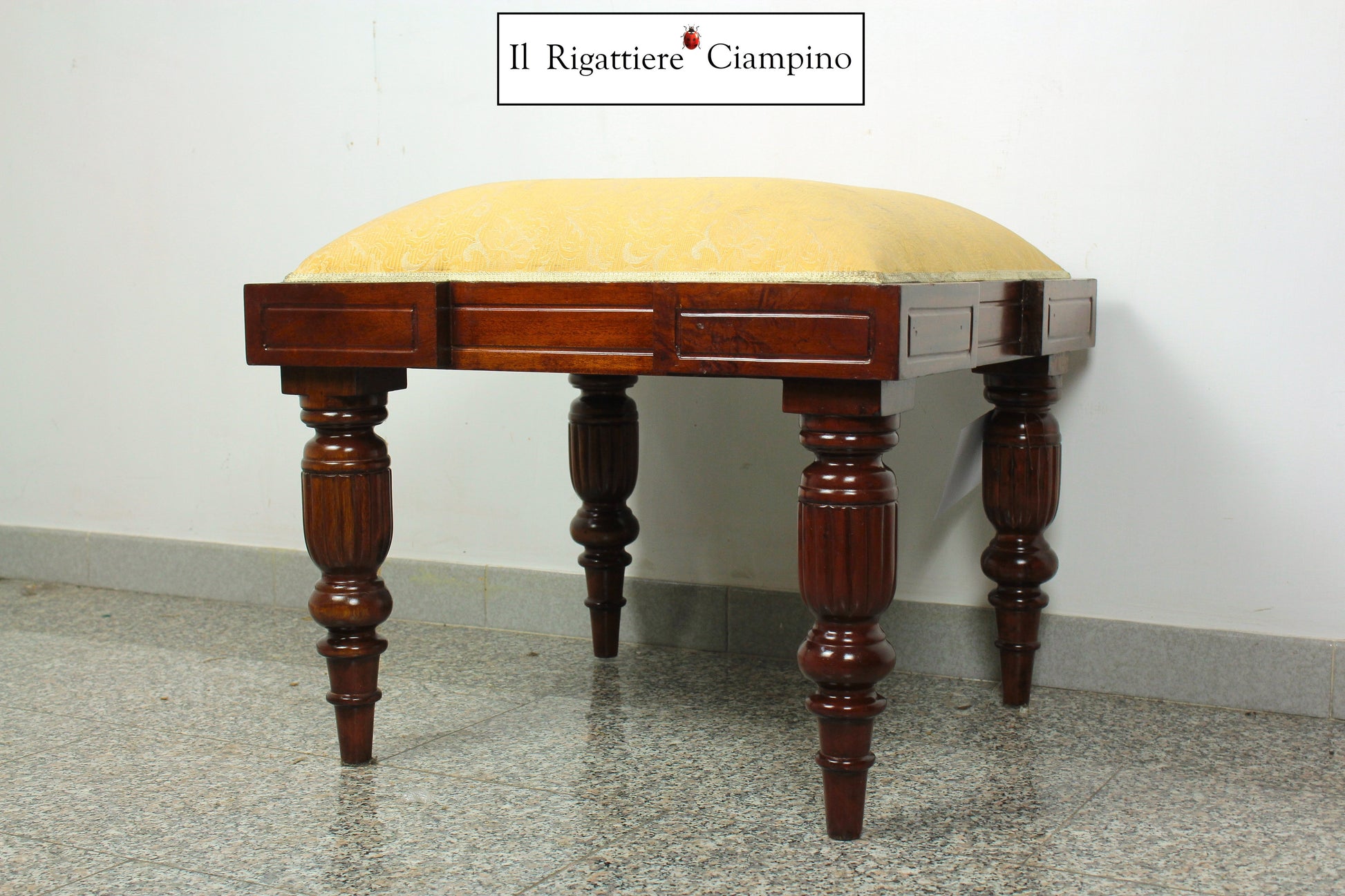 Sgabello in mogano con stoffa damasco ocra / avorio