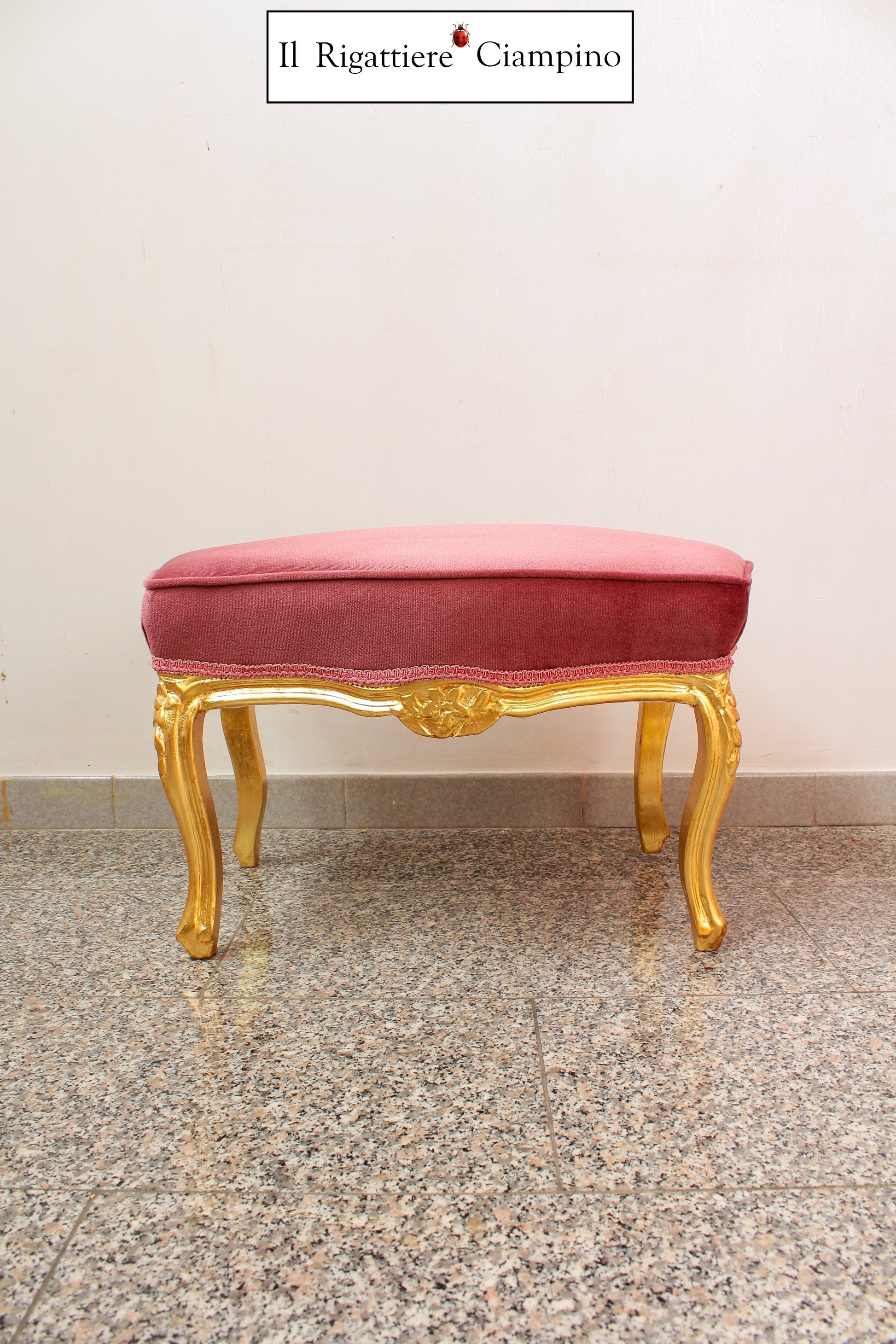 Il Rigattiere Ciampino propone un bellissimo sgabello poggiapiedi per poltrona, imbottito e rivestito con velluto rosa. Gambe in legno, coperte in foglia oro, per dare brillantezza e luminosità alla poltrona, raggiunte anche grazie al velluto.
