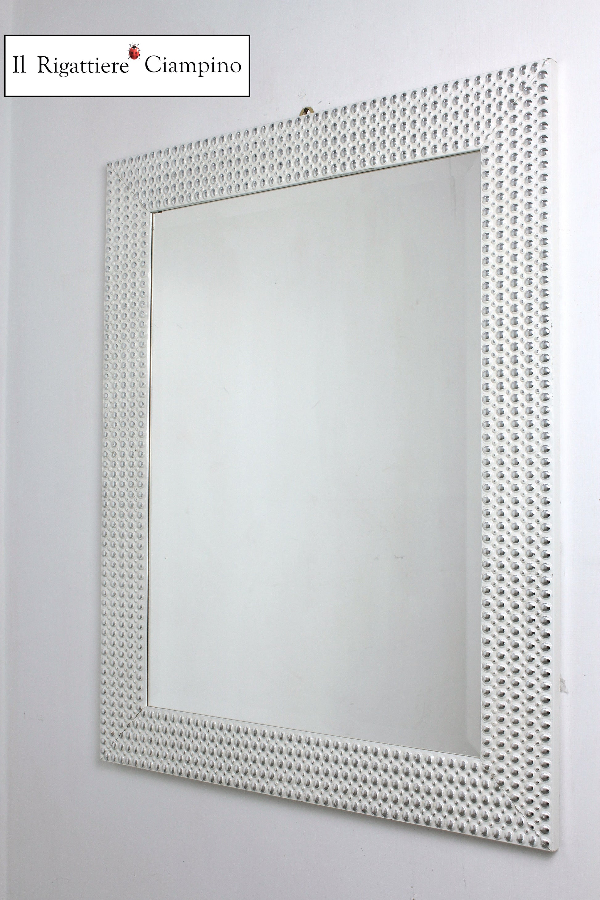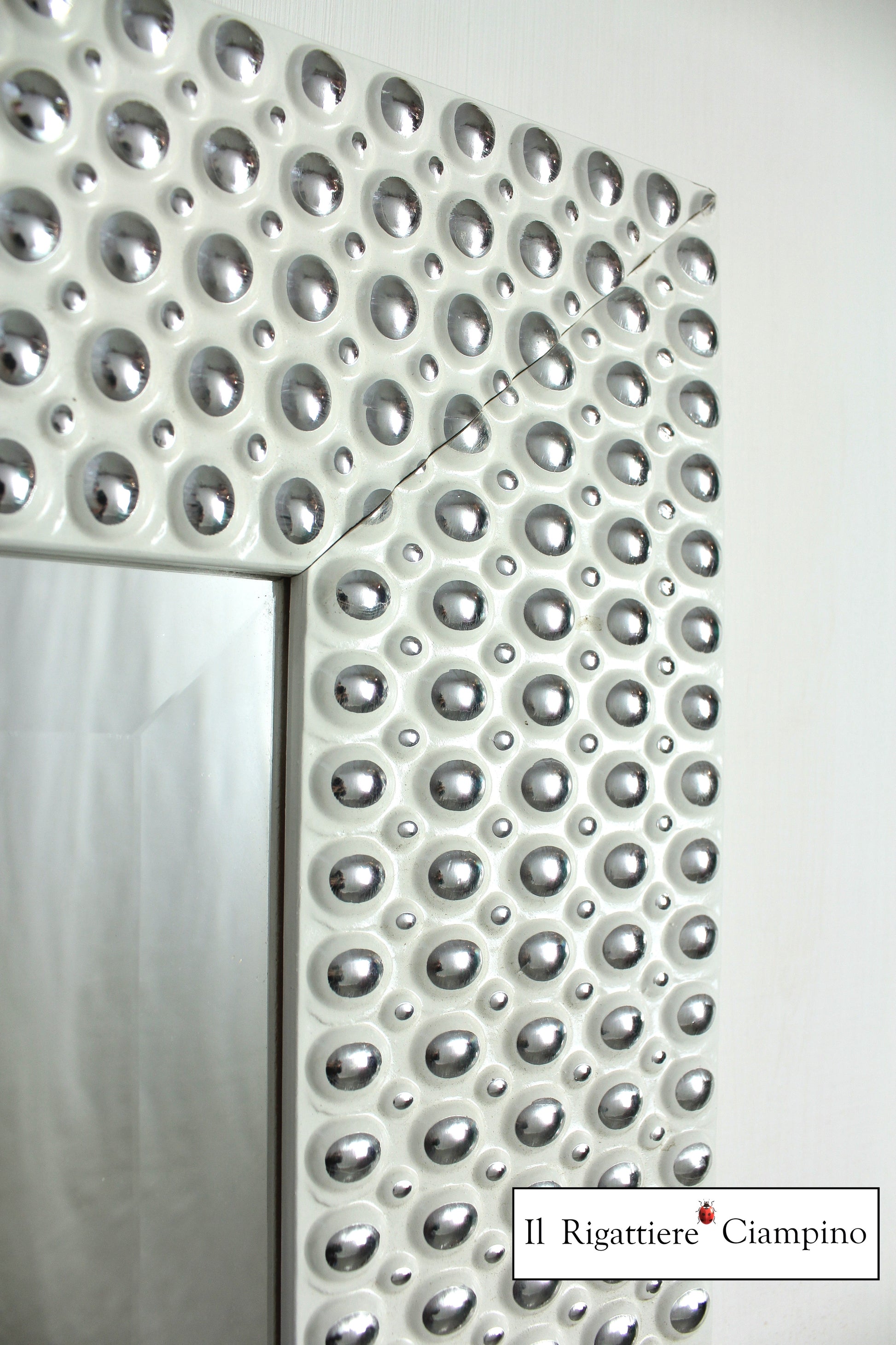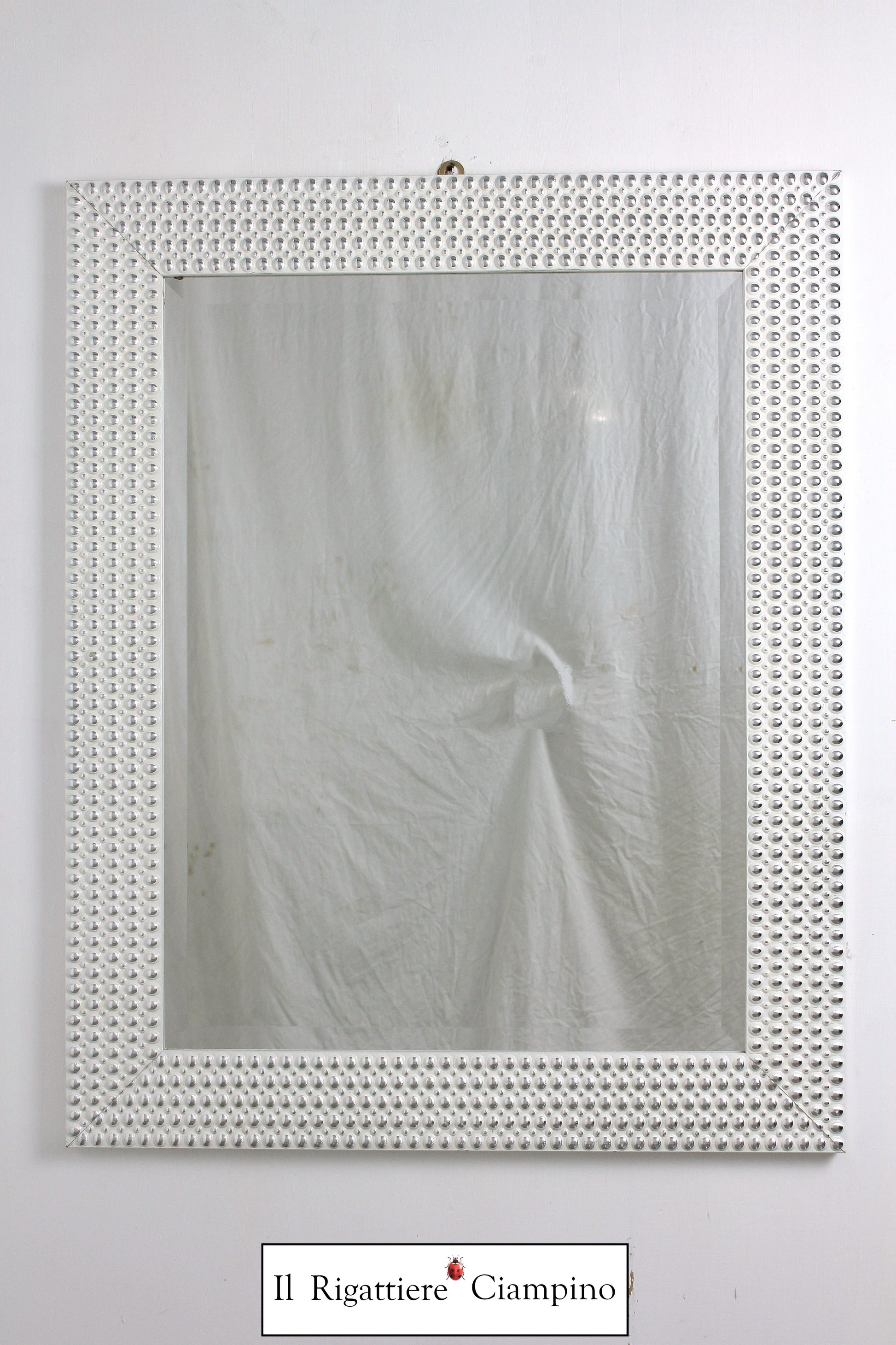 Il Rigattiere Ciampino propone un bellissimo specchio molato, avvolto da una cornice in stile moderno di colore bianco con motivo a pois specchiato.