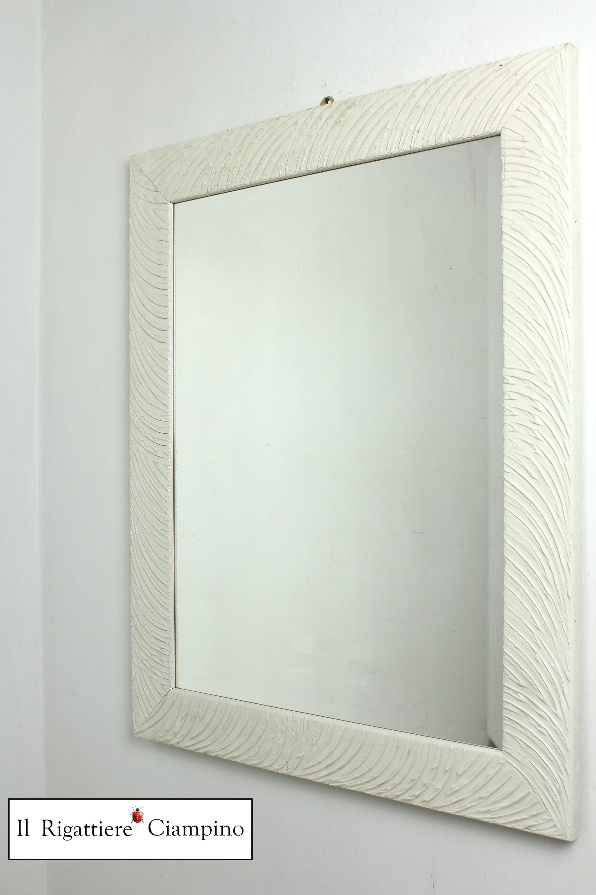Il Rigattiere Ciampino propone un bellissimo specchio molato, avvolto da una cornice con trama moderna, di colore avorio.