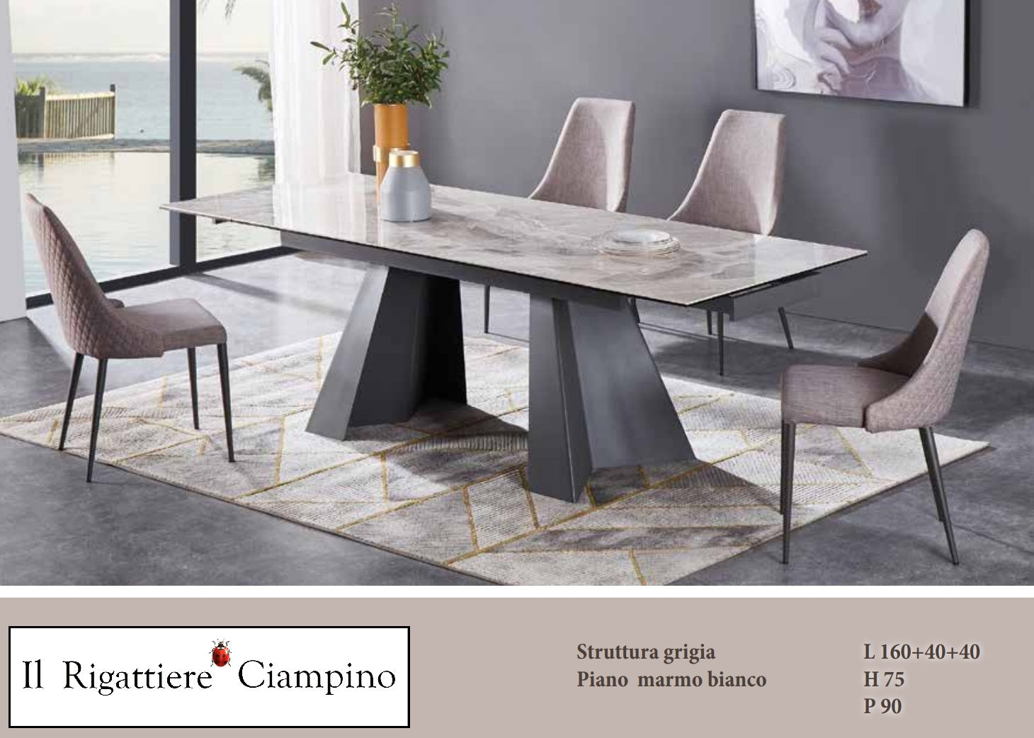 Il Rigattiere Ciampino propone un tavolo bicolore, allungabile di 80 cm totali, 40 per lato, con struttura di colore grigo e piano in marmo bianco.