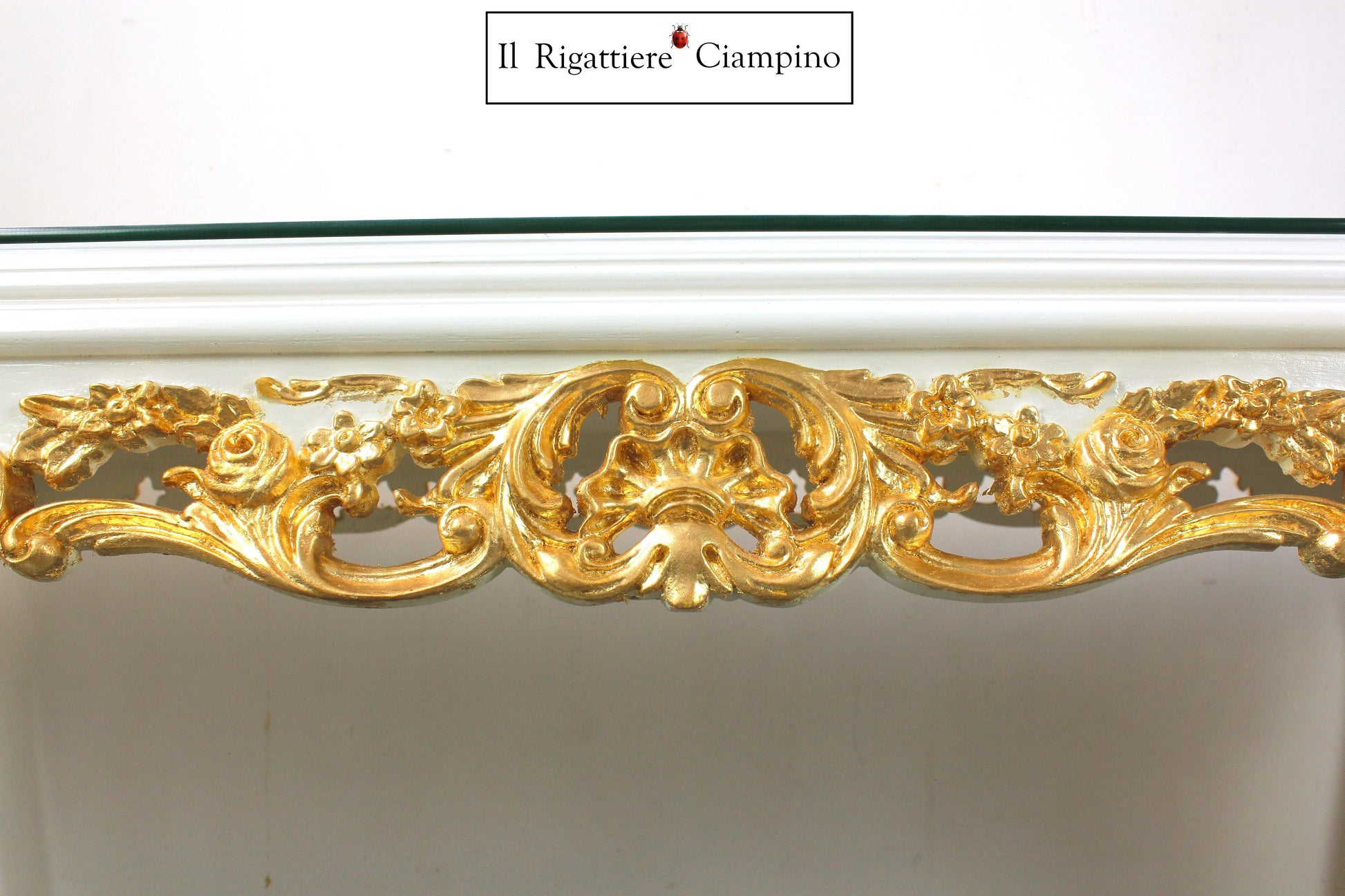 Tavolo in stile barocco intagliato con piano in vetro, bianco con rifiniture oro
