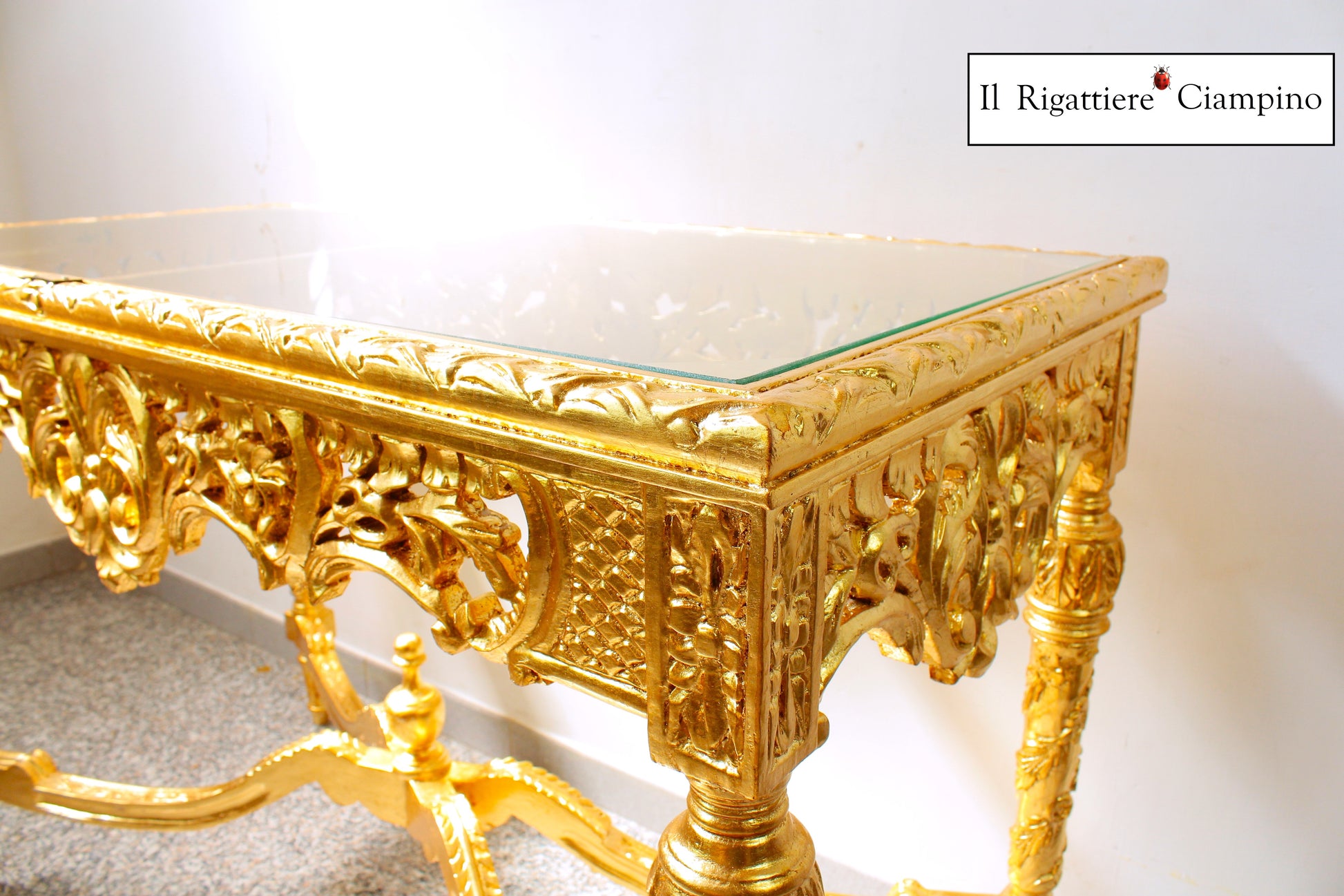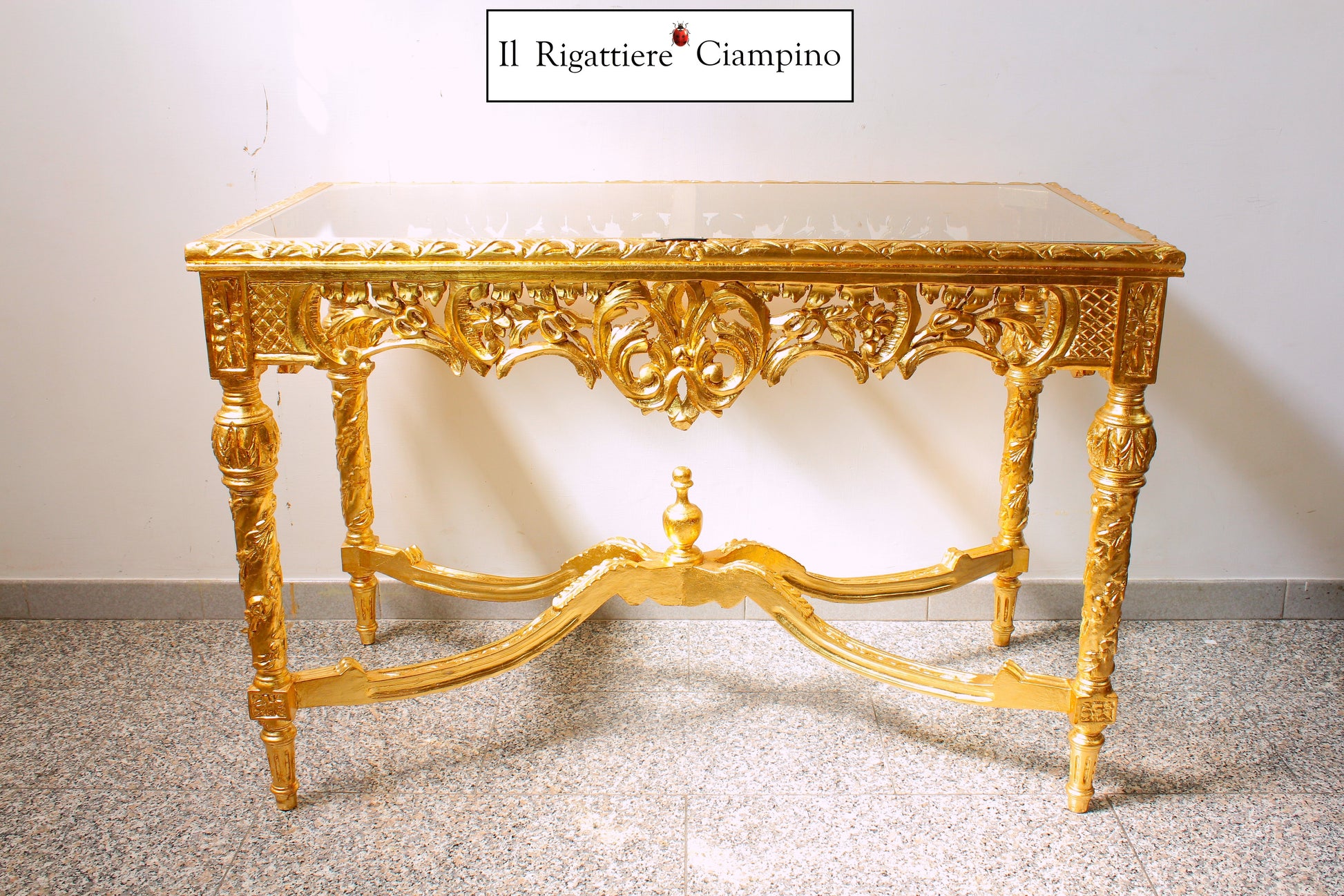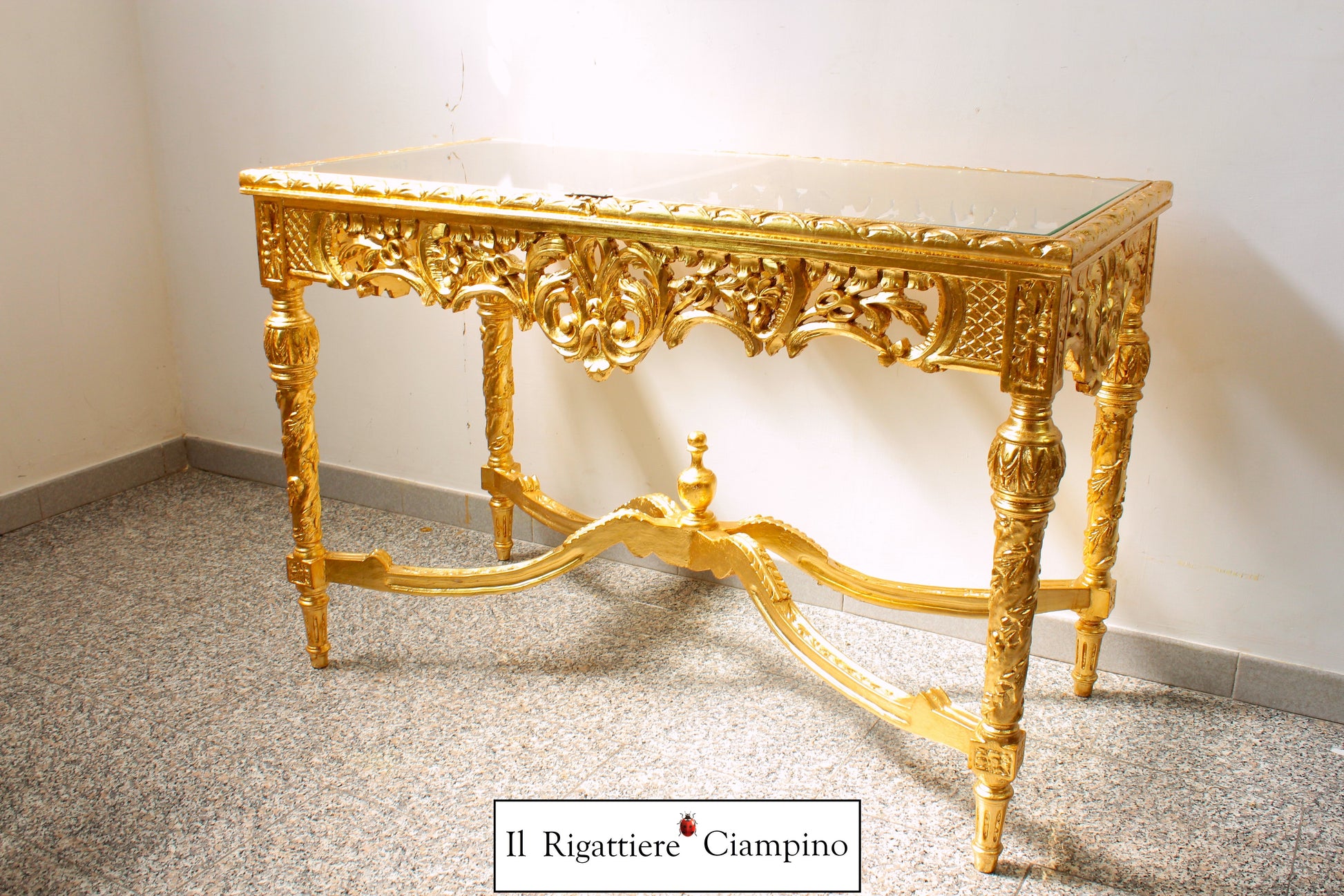 Il Rigattiere Ciampino propone una bellissima postazione manicure in stile barocco con piano in vetro. Un tavolo per chi vuole un centro estetico senza compromessi! Questo tavolo manicure farà brillare il tuo negozio, grazie alla sua struttura in foglia oro!