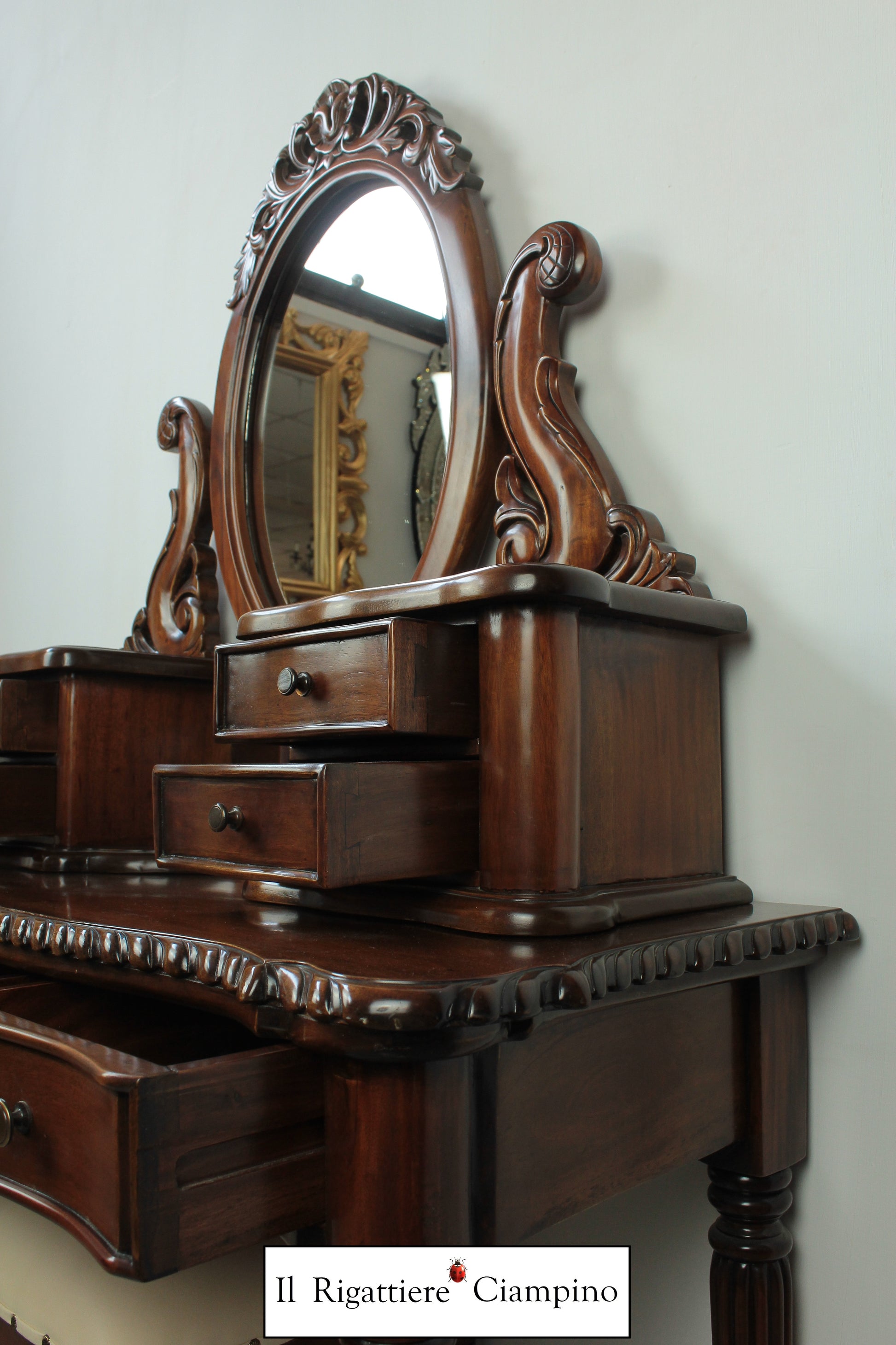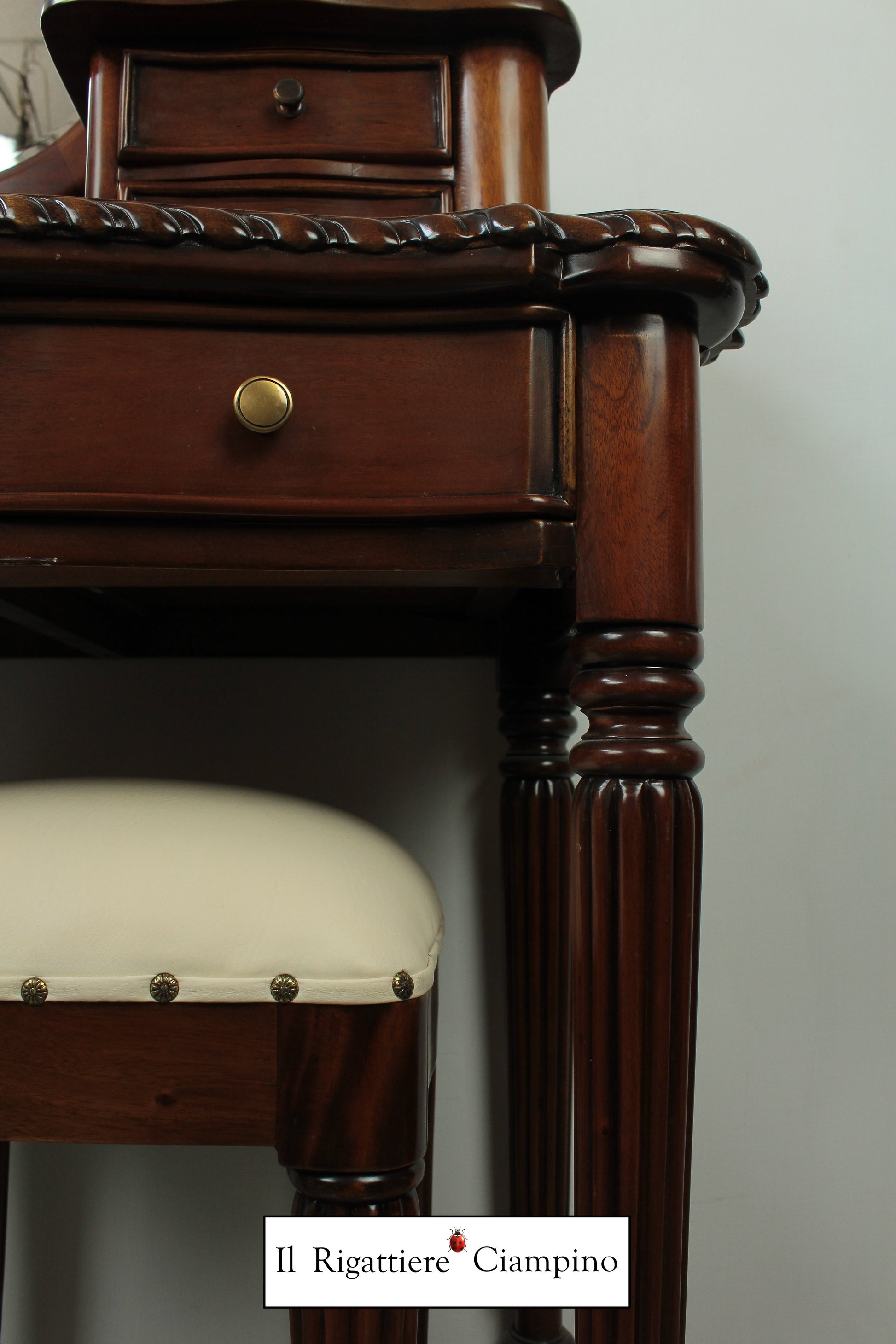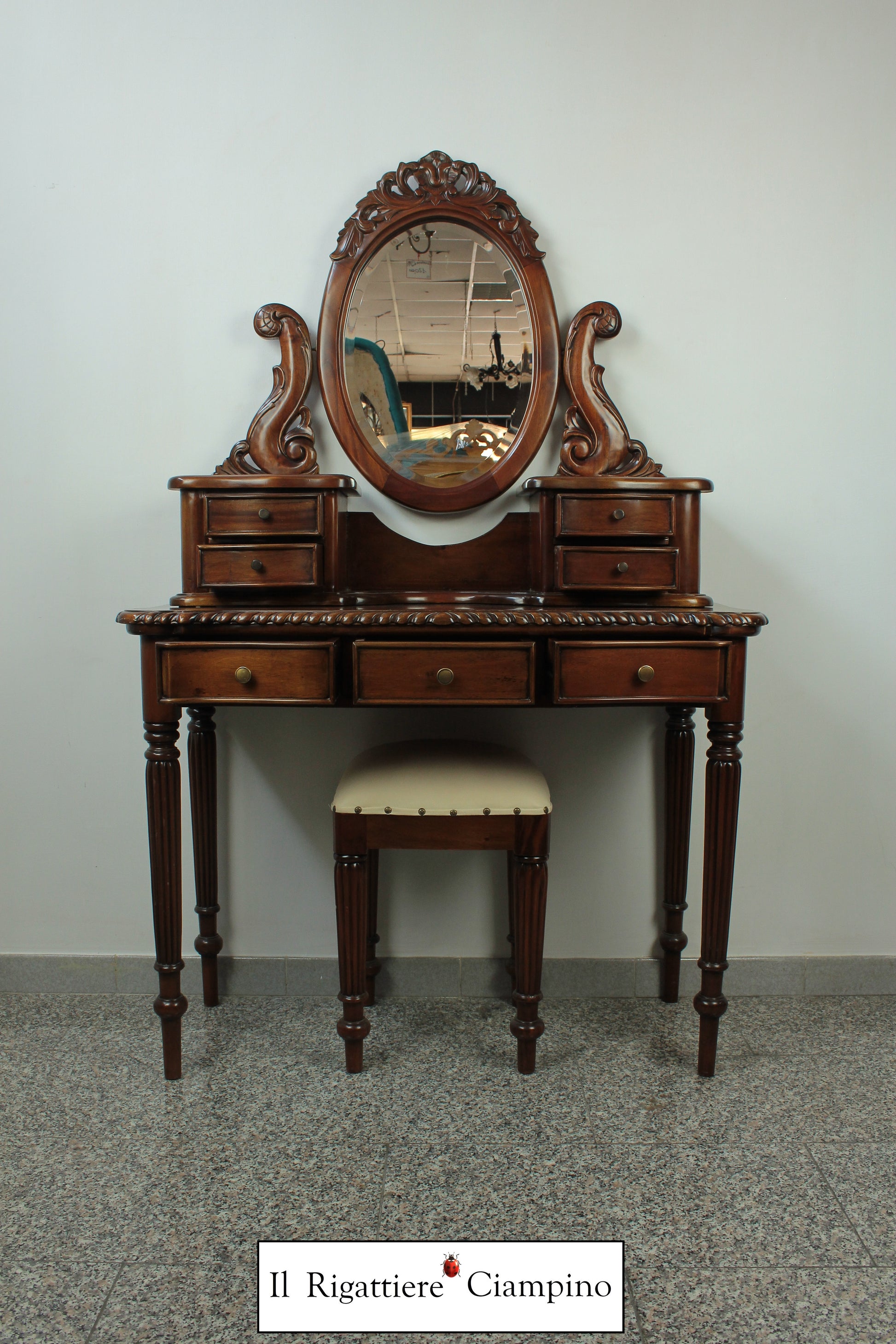 Il Rigattiere Ciampino propone una splendida toletta con sgabello, in legno mogano massello. Comoda per riporre gli effetti personali nei sette cassetti, e dotata di specchio, questa toletta è perfetta come postazione da trucco, nella propria abitazione o nel proprio centro estetico.