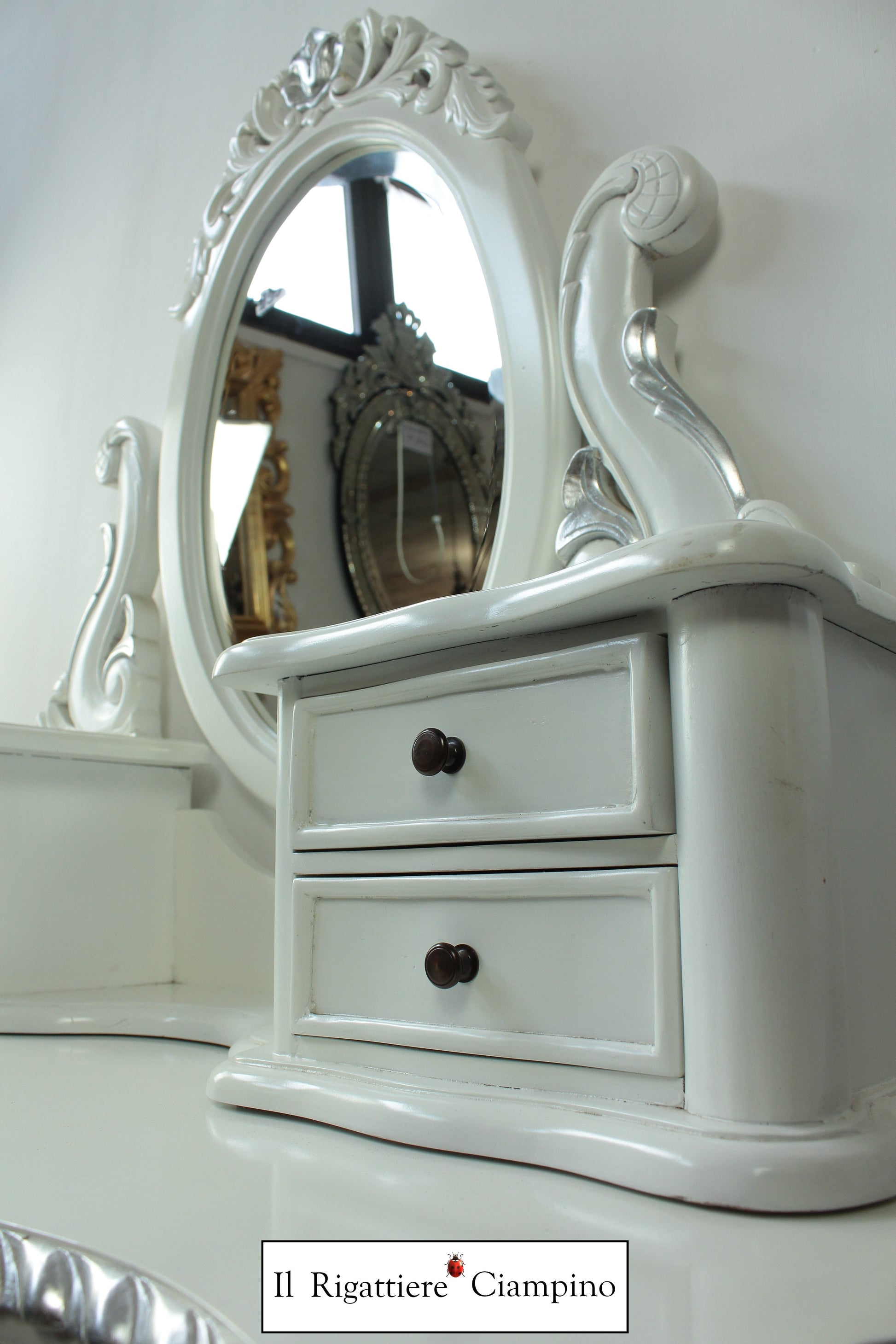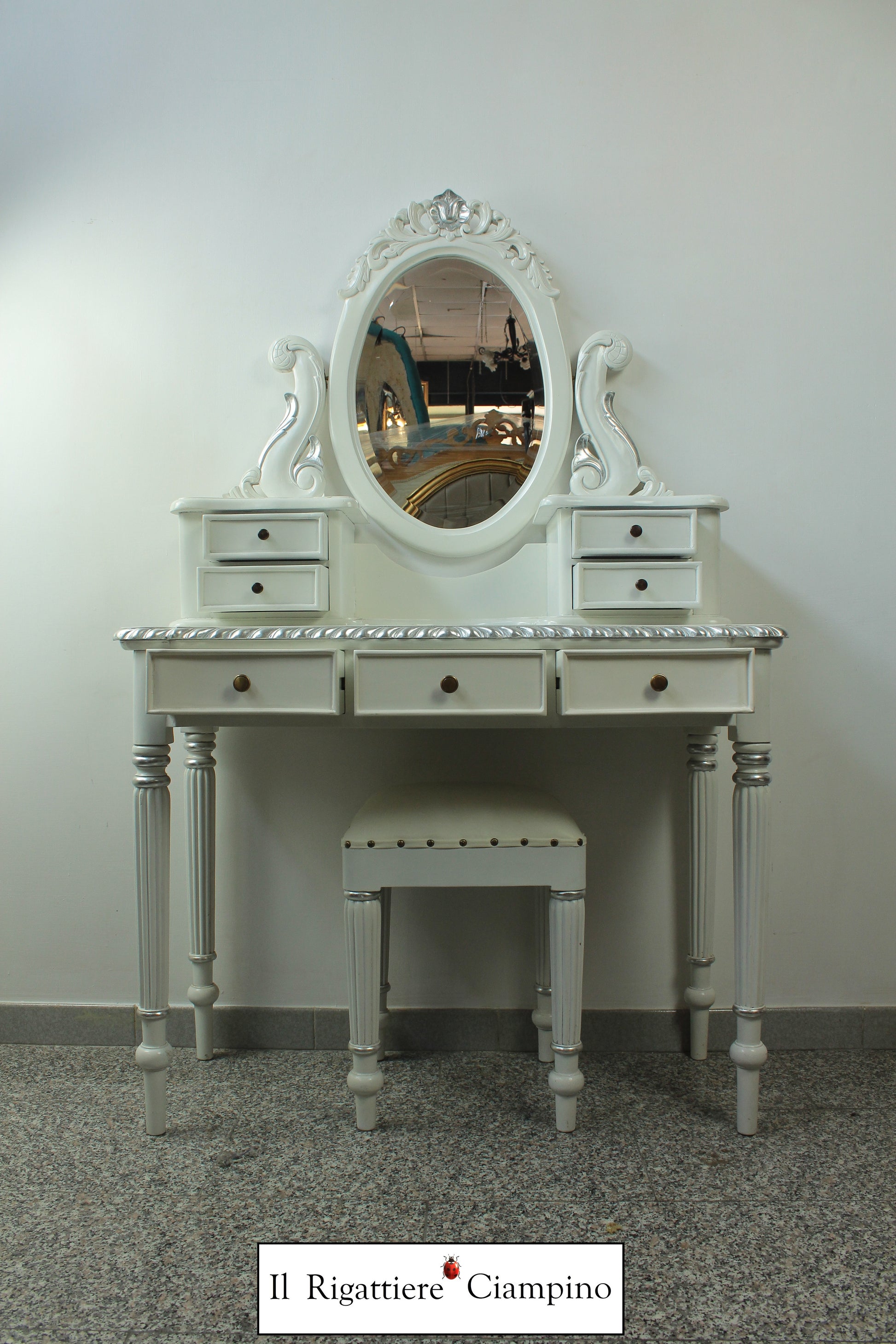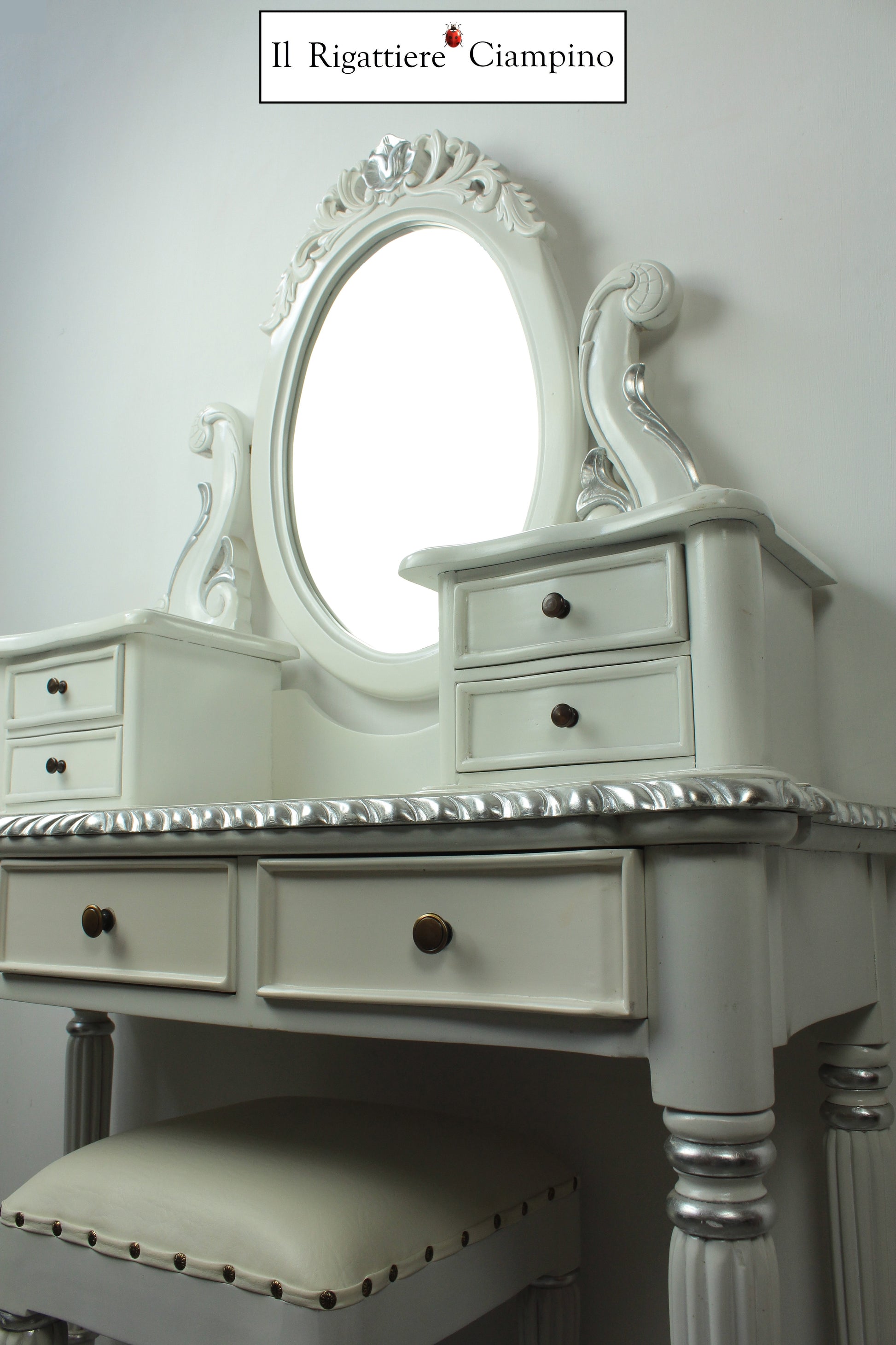 Il Rigattiere Ciampino propone una splendida toletta con sgabello, in legno mogano massello. Comoda per riporre gli effetti personali nei sette cassetti, e dotata di specchio, questa toletta è perfetta come postazione da trucco, nella propria abitazione o nel proprio centro estetico.