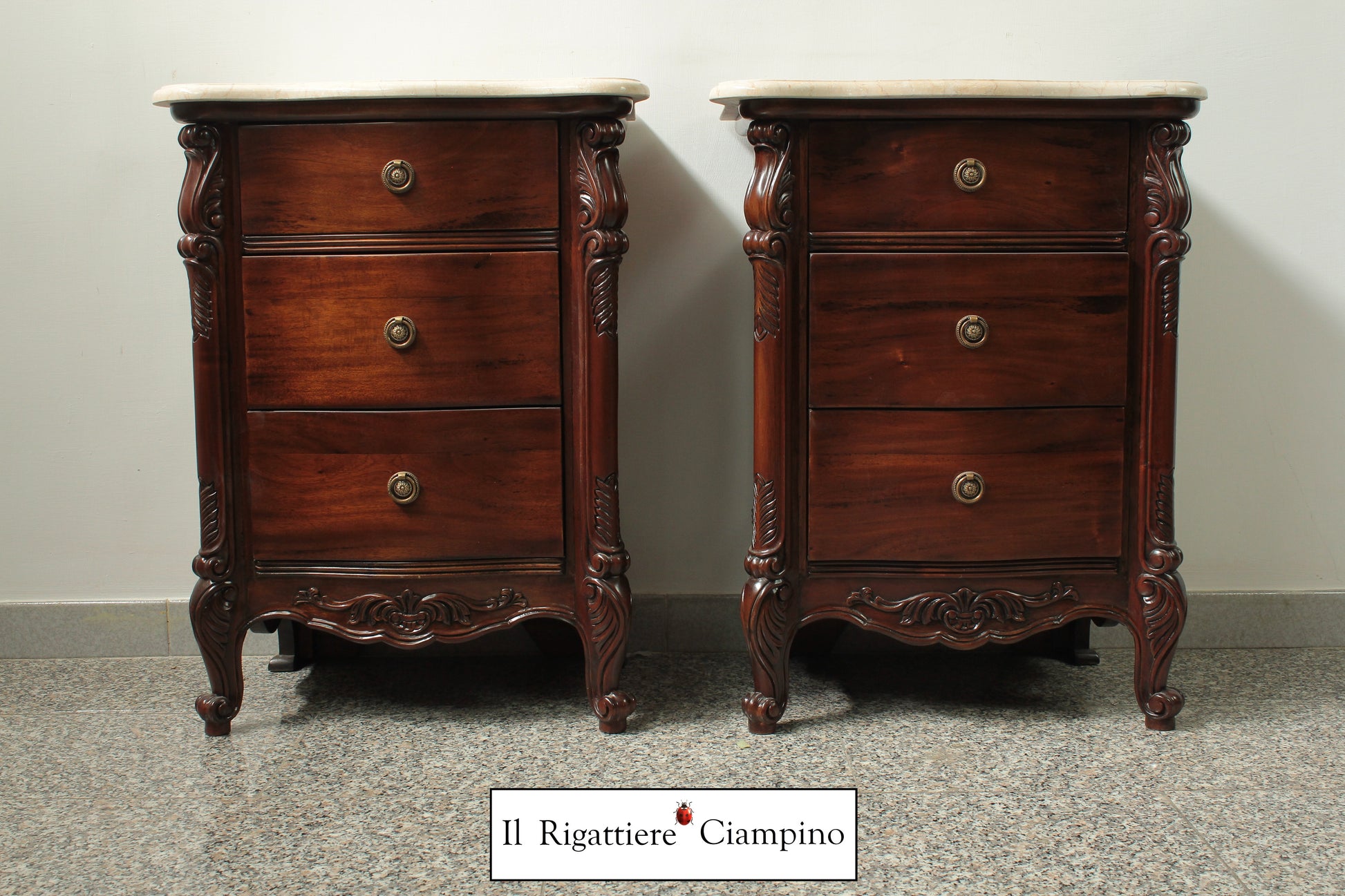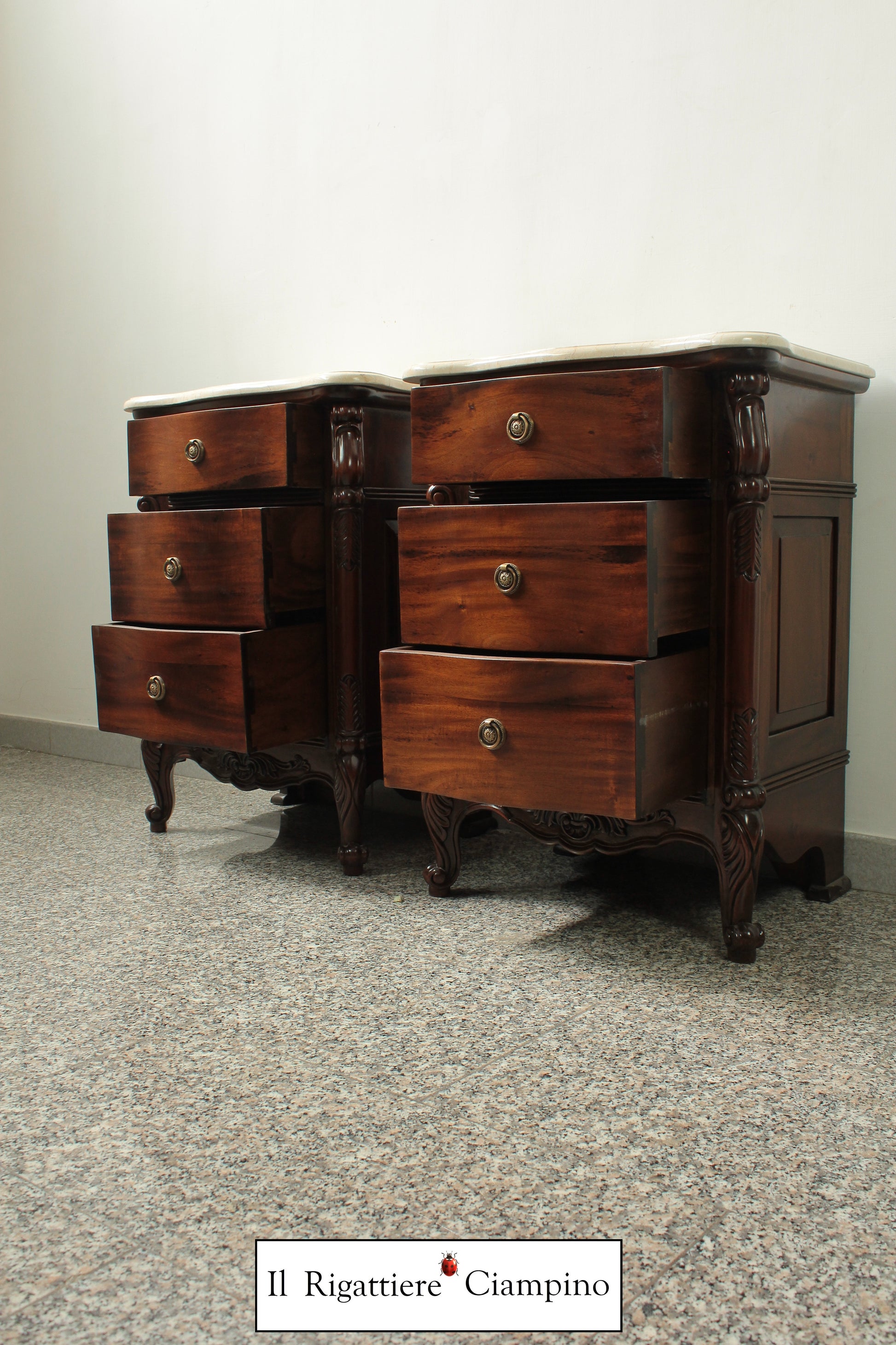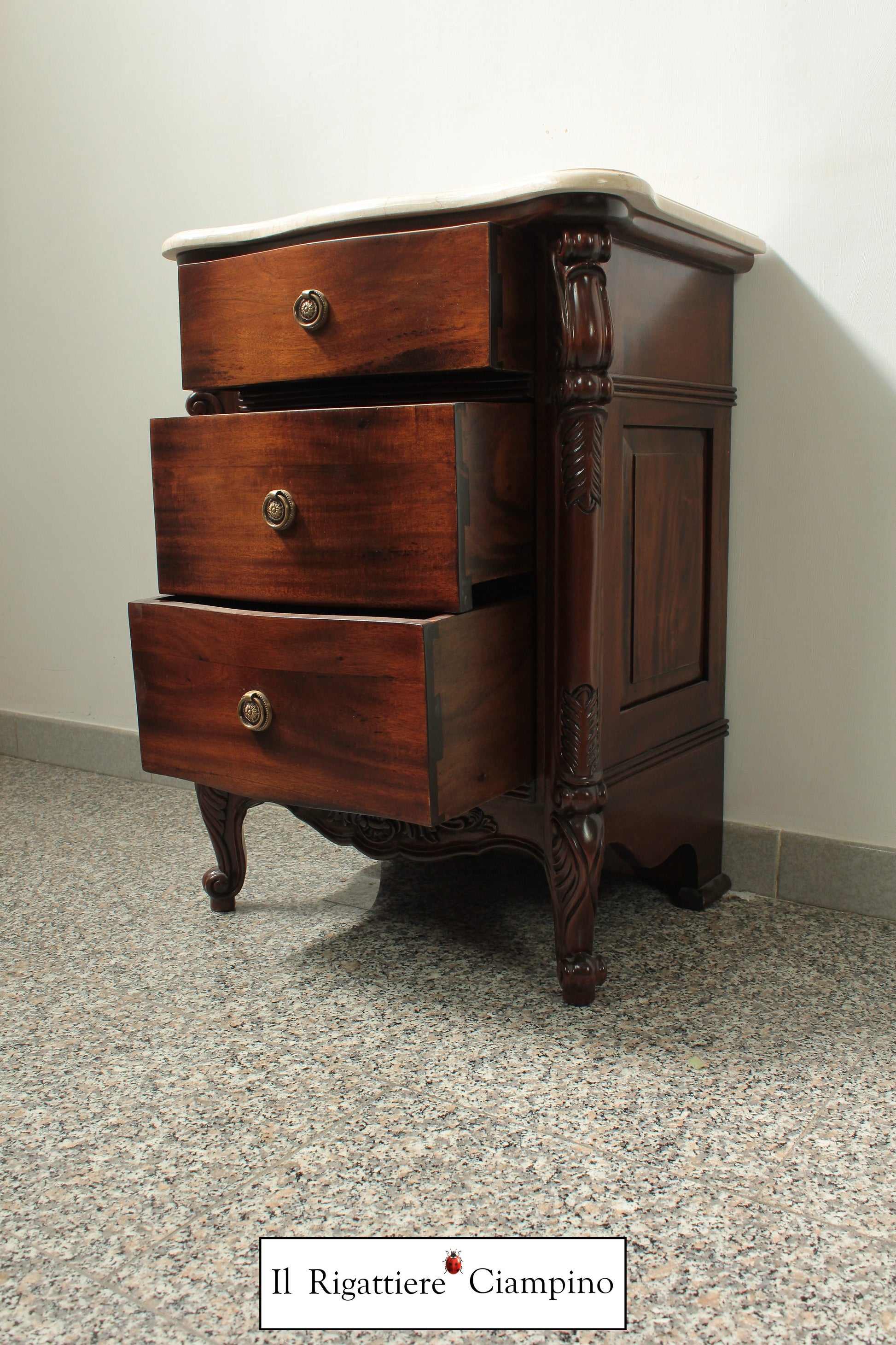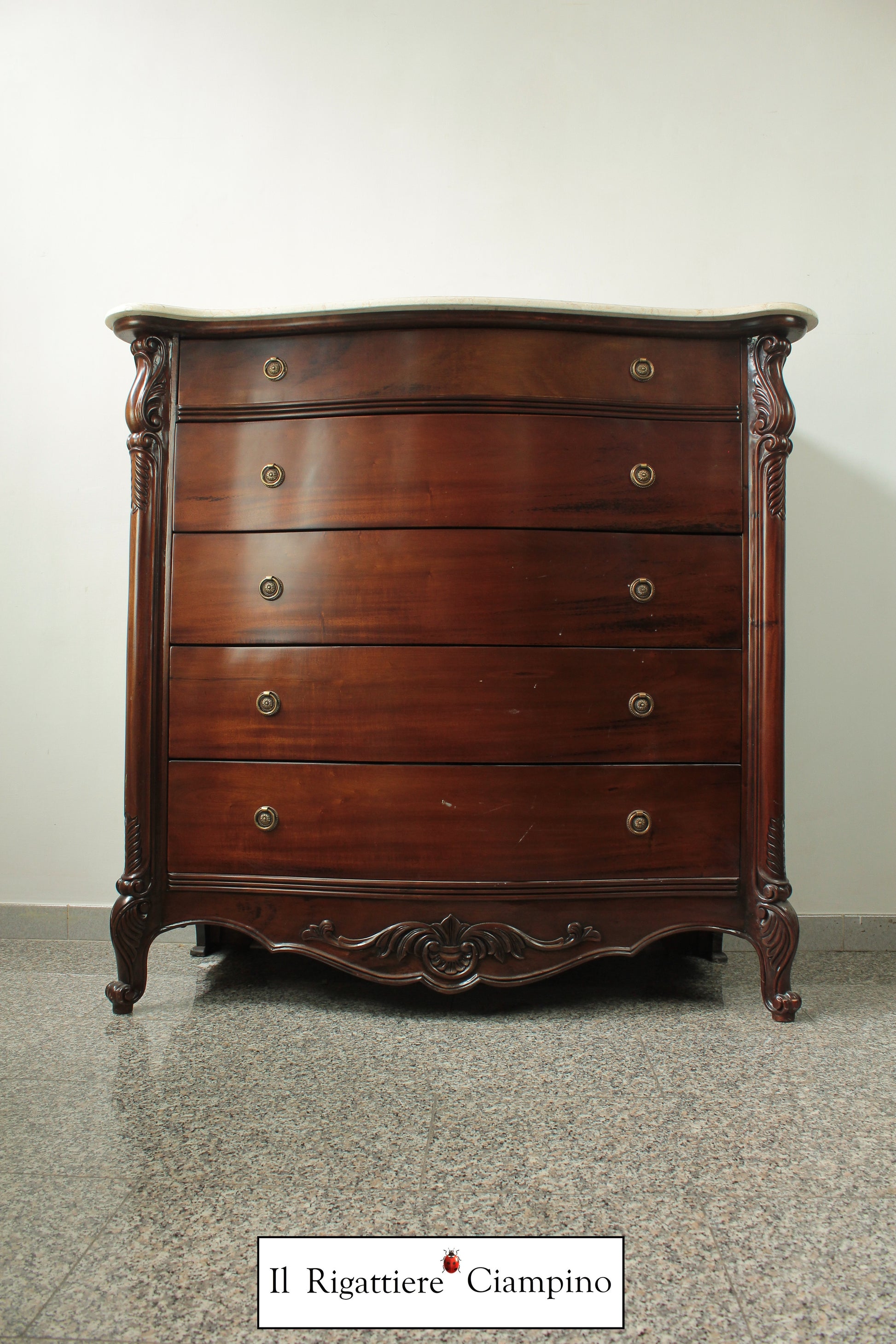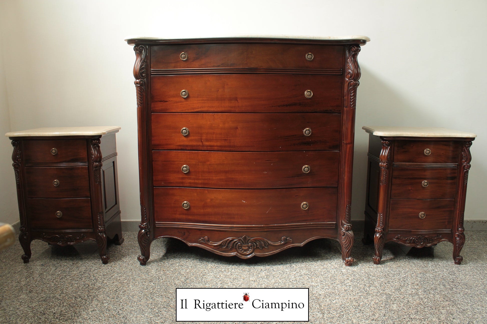 Il Rigattiere Ciampino propone un magnifico trittico in legno mogano massello, composto da: n°1 comò a 5 cassettoni, n°2 comodini da 3 cassetti. Tutti i mobili hanno un piano in marmo avorio. I pomelli dei cassetti sono di ottone.