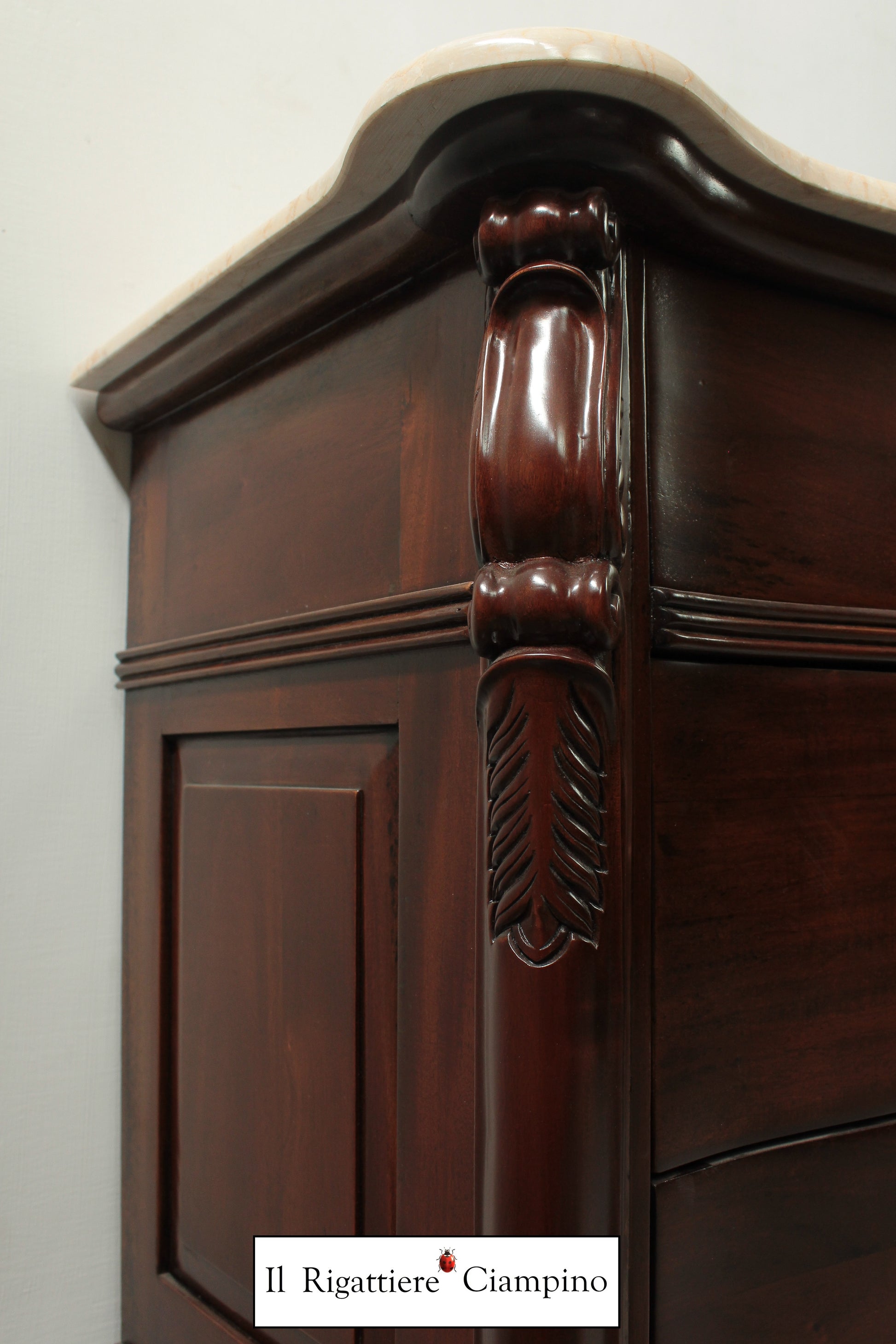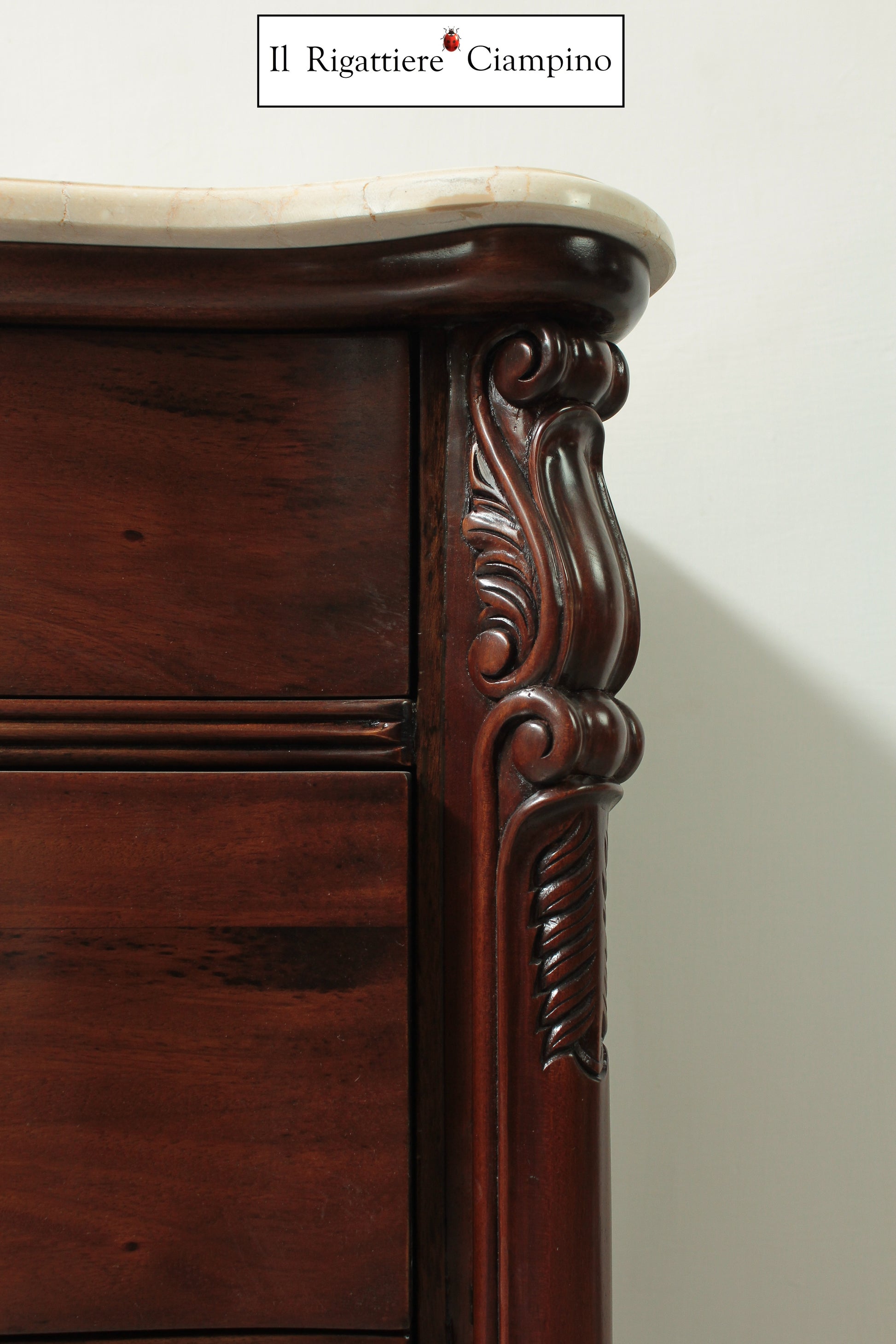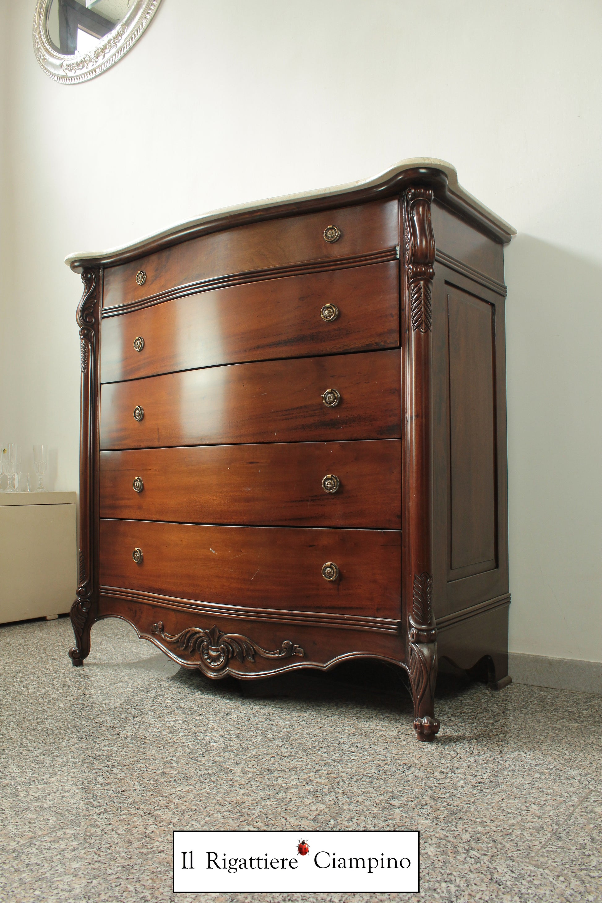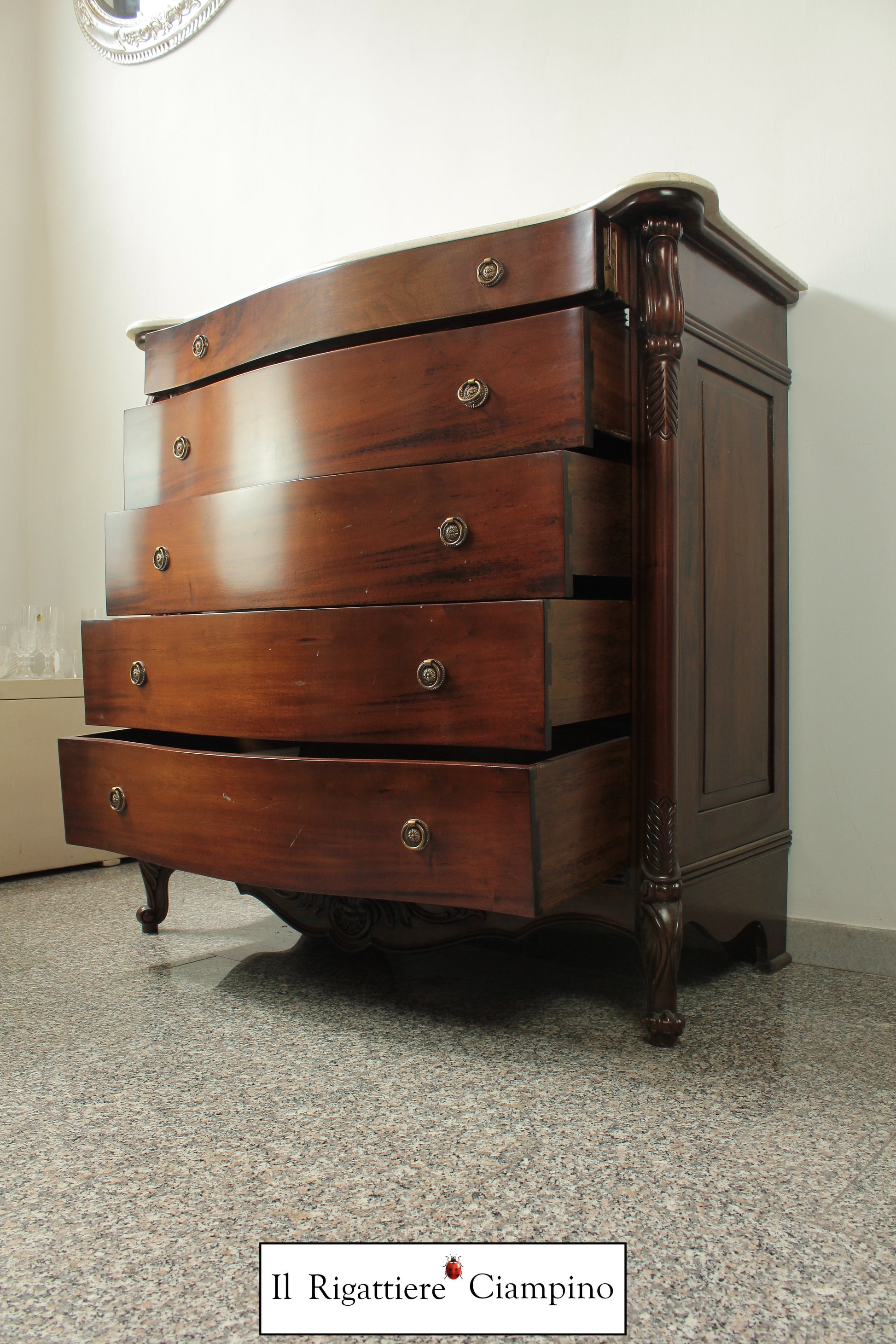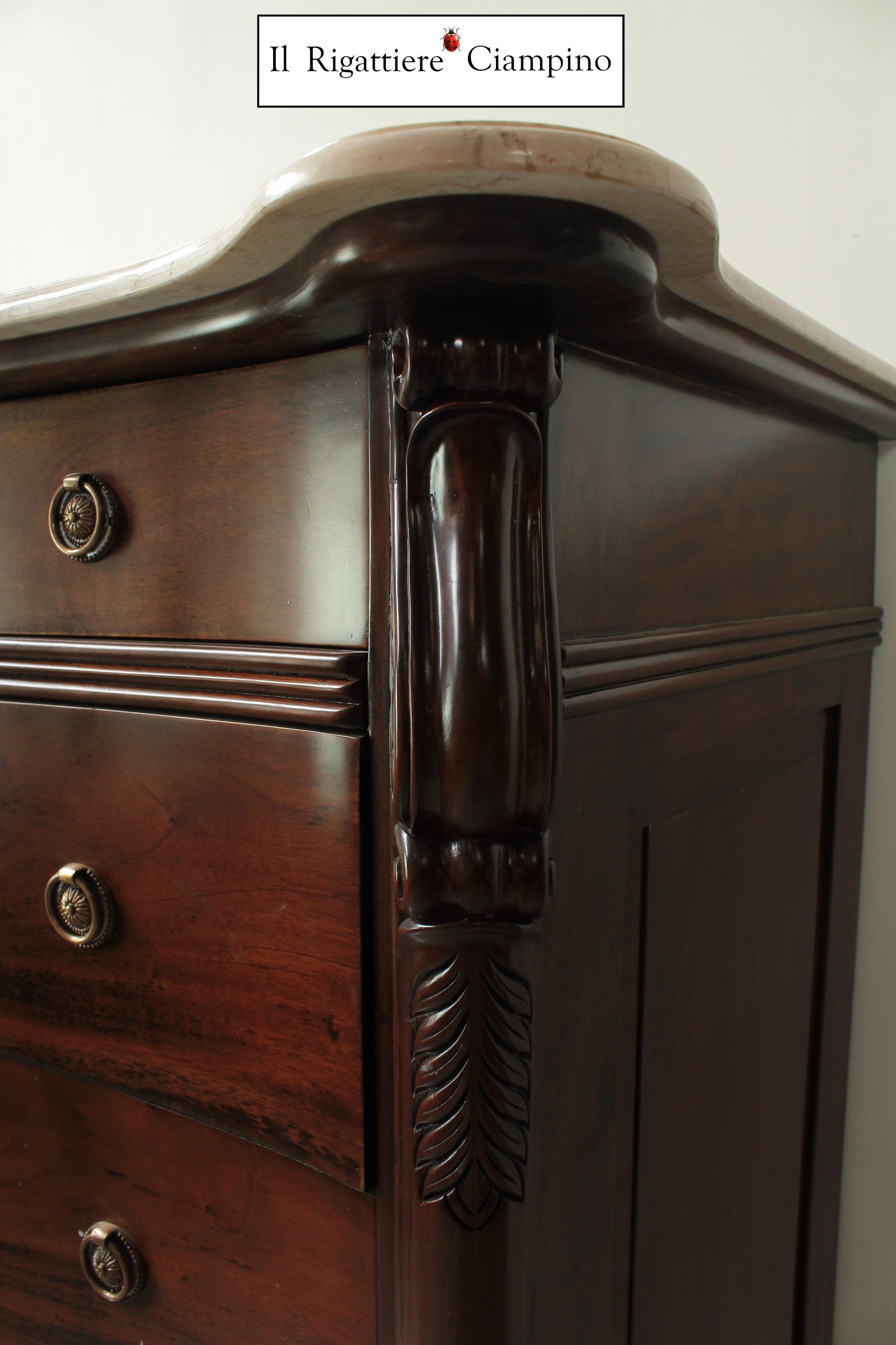 Il Rigattiere Ciampino propone un magnifico trittico in legno mogano massello, composto da: n°1 comò a 5 cassettoni, n°2 comodini da 3 cassetti. Tutti i mobili hanno un piano in marmo avorio. I pomelli dei cassetti sono di ottone.