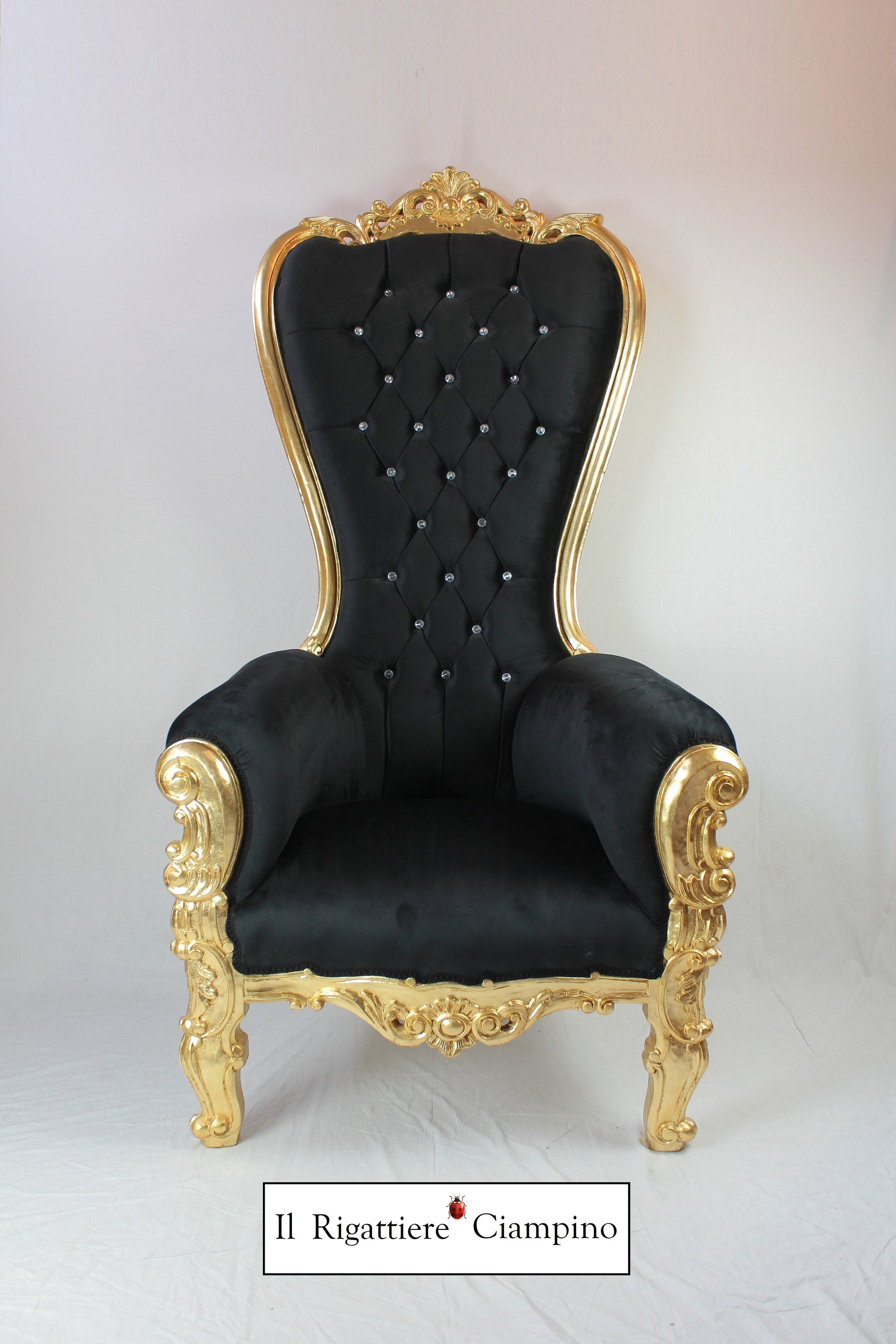 Il Rigattiere Ciampino propone una magnifico trono modello Jasmine con struttura oro e rivestimento in velluto nero, trapuntata con lavorazione Capitonné. Per donare regalità e importanza al tuo salotto o al tuo negozio. Questo trono è una testimonianza della vostra raffinatezza e della vostra passione per l'arte e la bellezza. Prendetelo, sedetevi e regalatevi un'esperienza davvero regale.