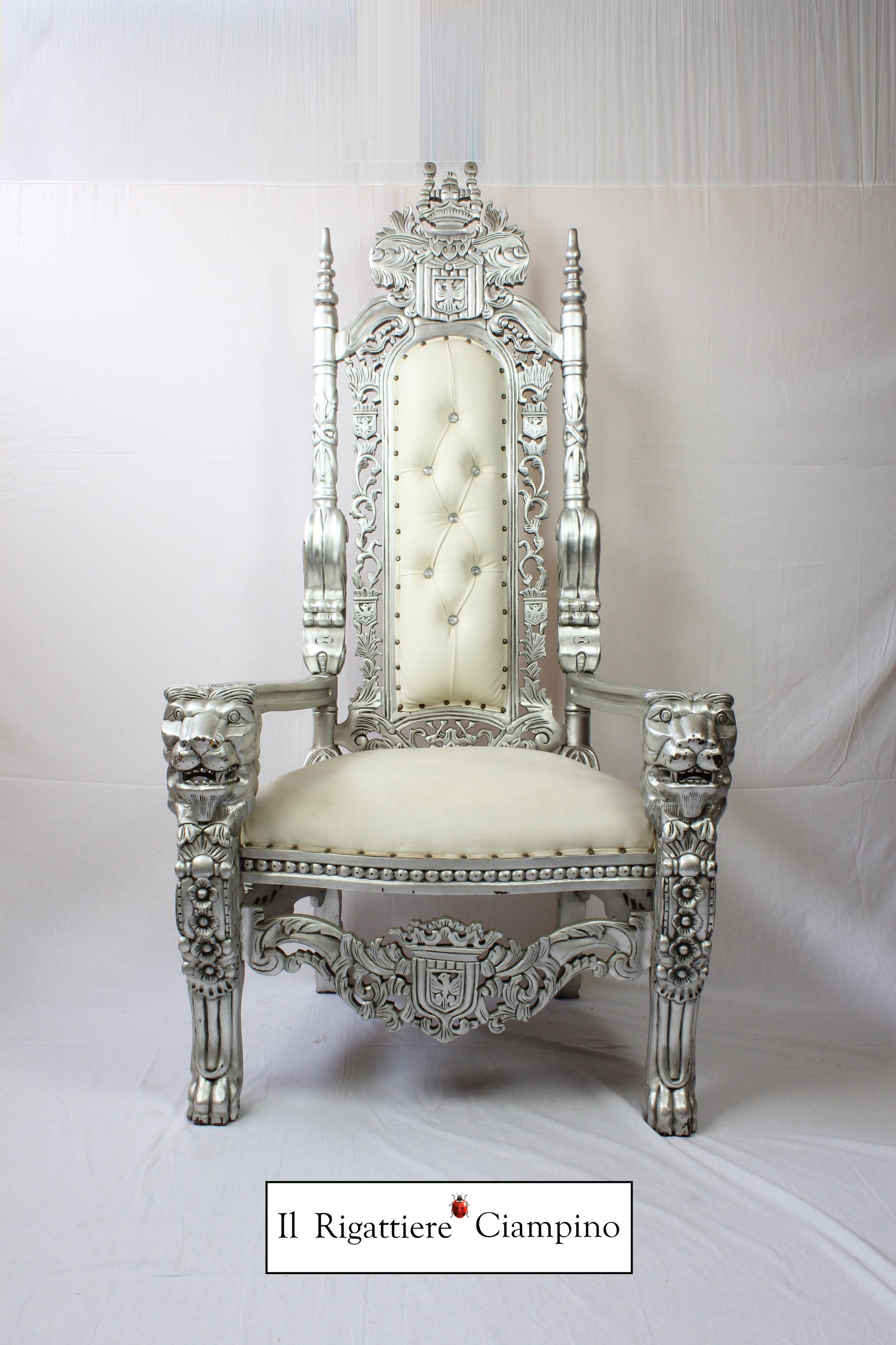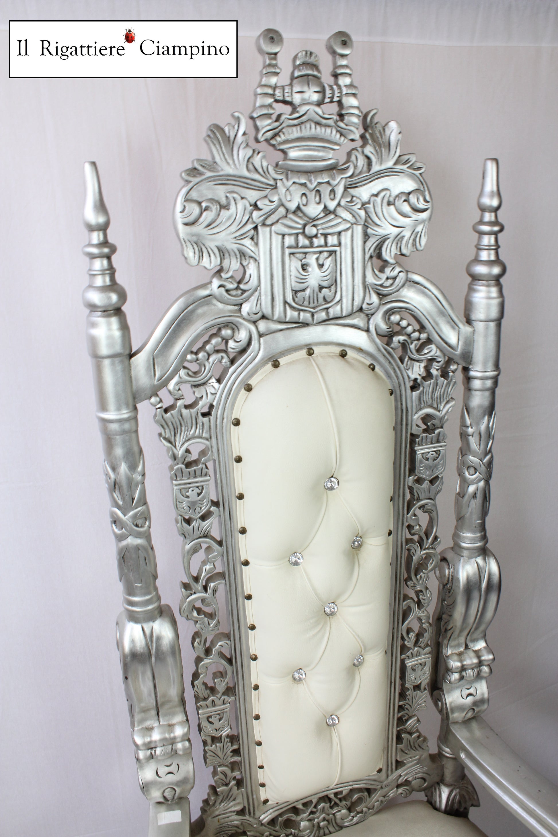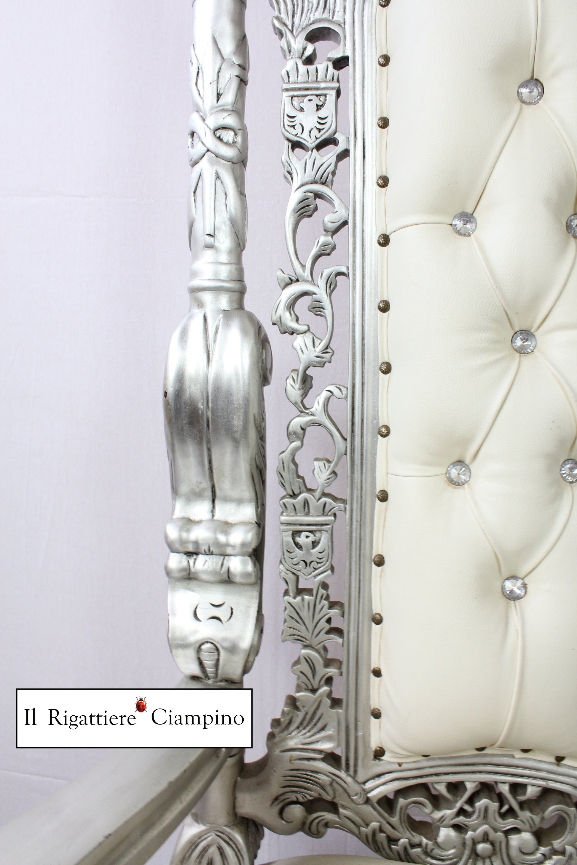 Il Rigattiere Ciampino propone uno splendido trono in stile barocco con struttura di colore argento. Rivestimento in ecopelle bianca trapuntata con tecnica capitonné e bottoni Swarovski. Braccioli con teste di leone. Per donare un'atmosfera regale e ricercata al vostro salone o negozio. Questo trono è una testimonianza della vostra raffinatezza e della vostra passione per l'arte e la bellezza. Prendetelo, sedetevi e regalatevi un'esperienza davvero regale.