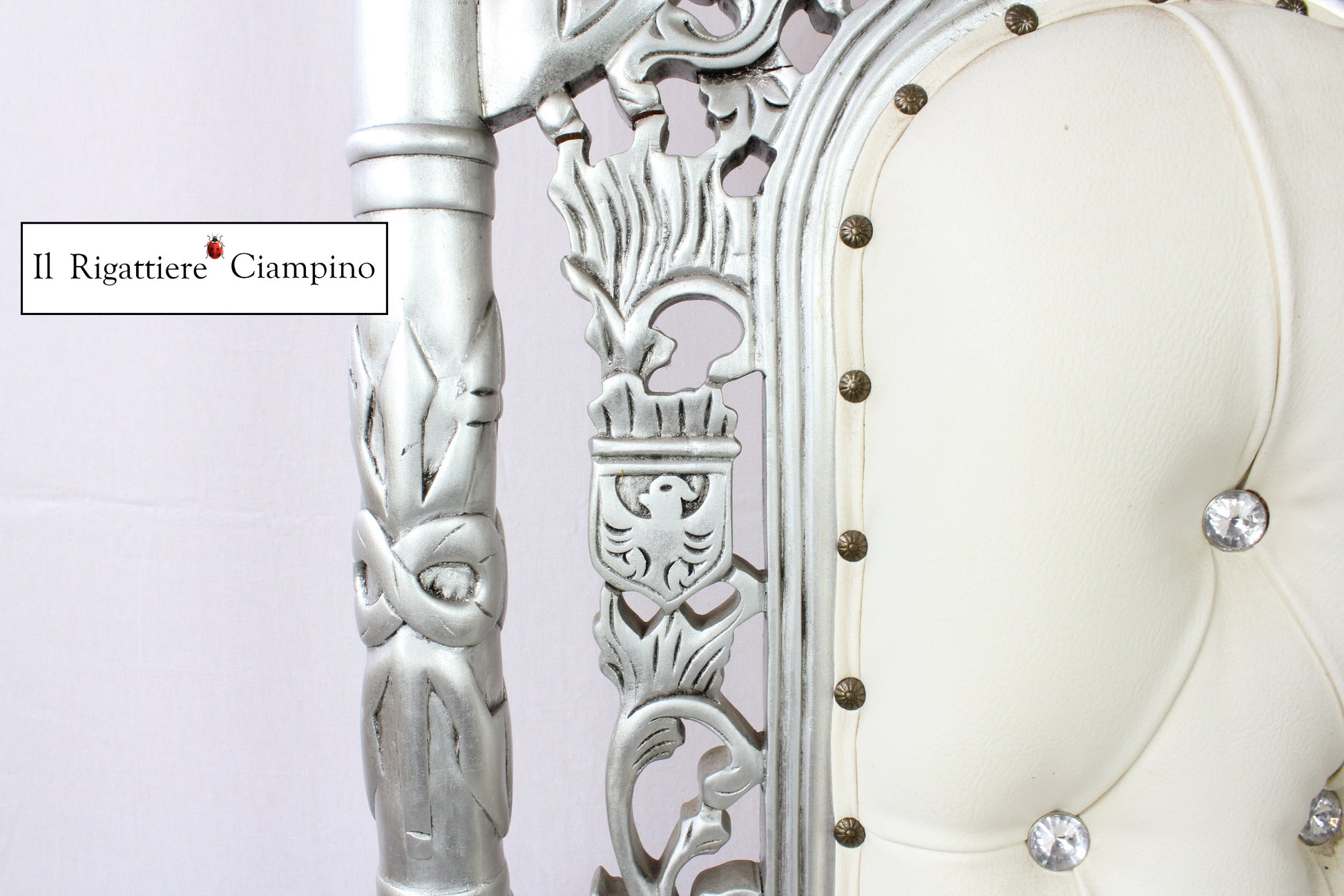 Trono Leone in stile barocco, foglia argento ed ecopelle bianca