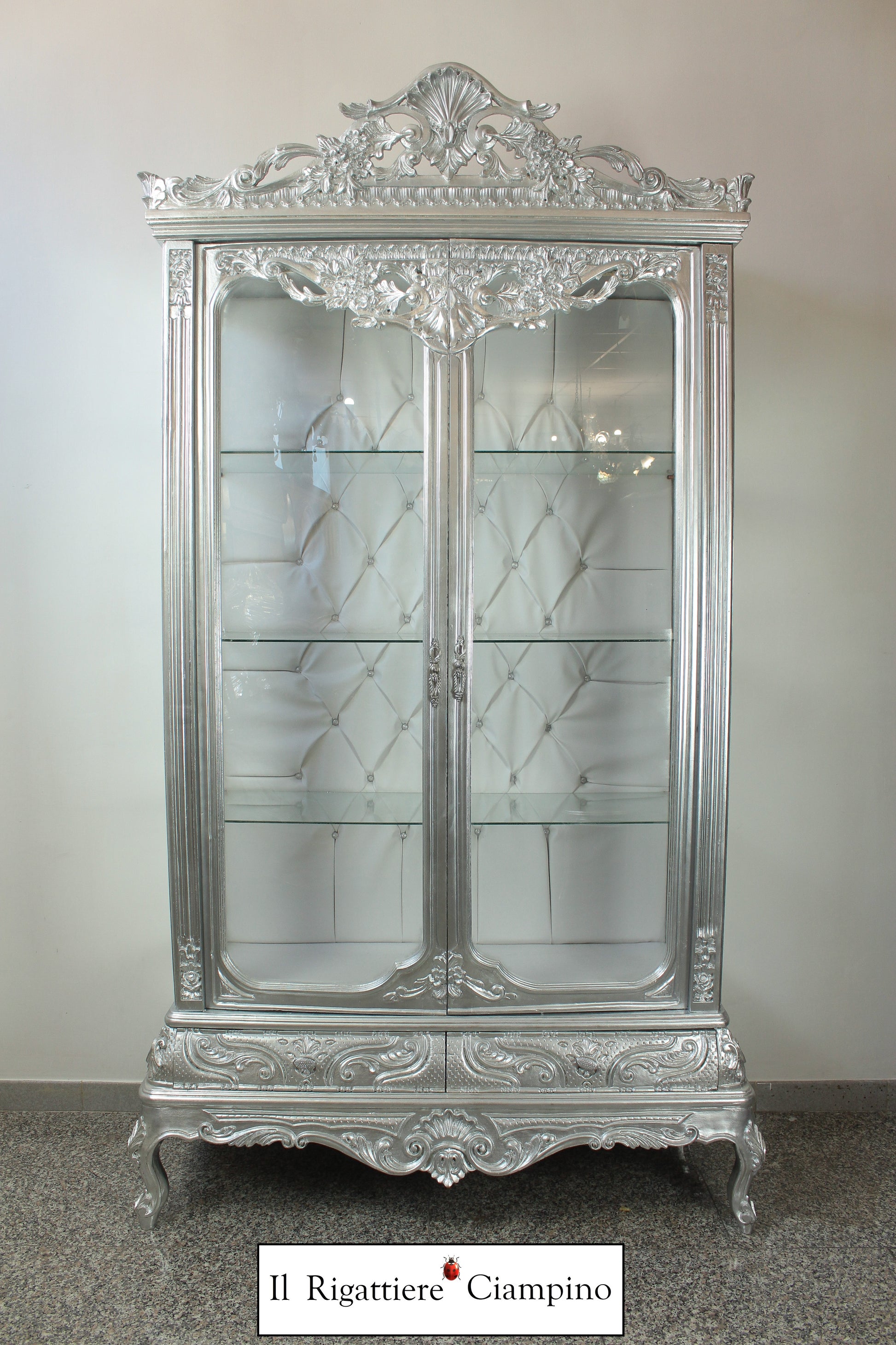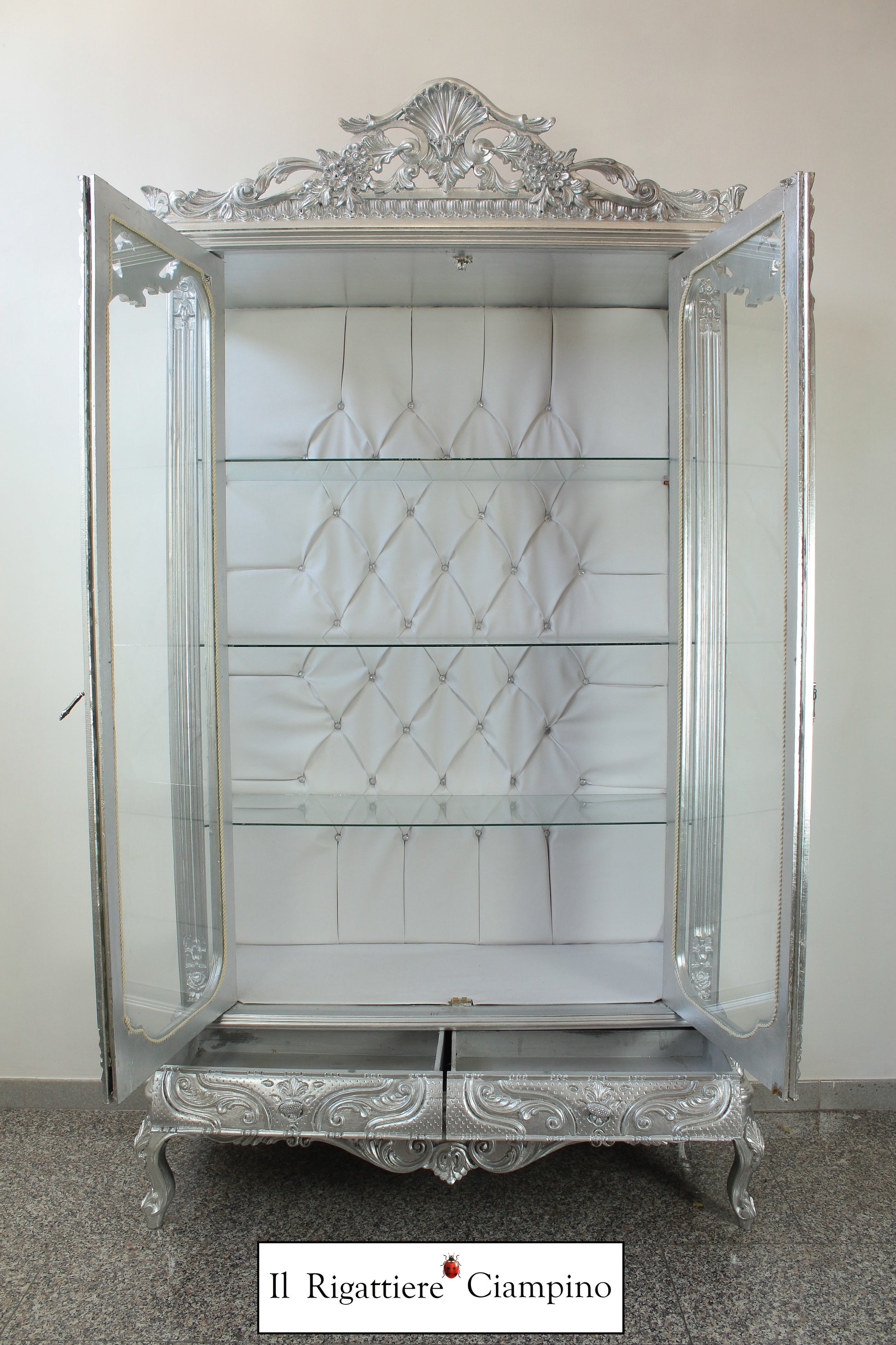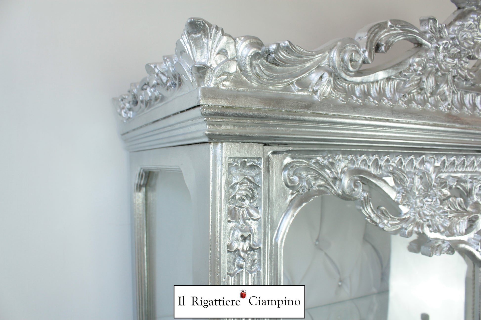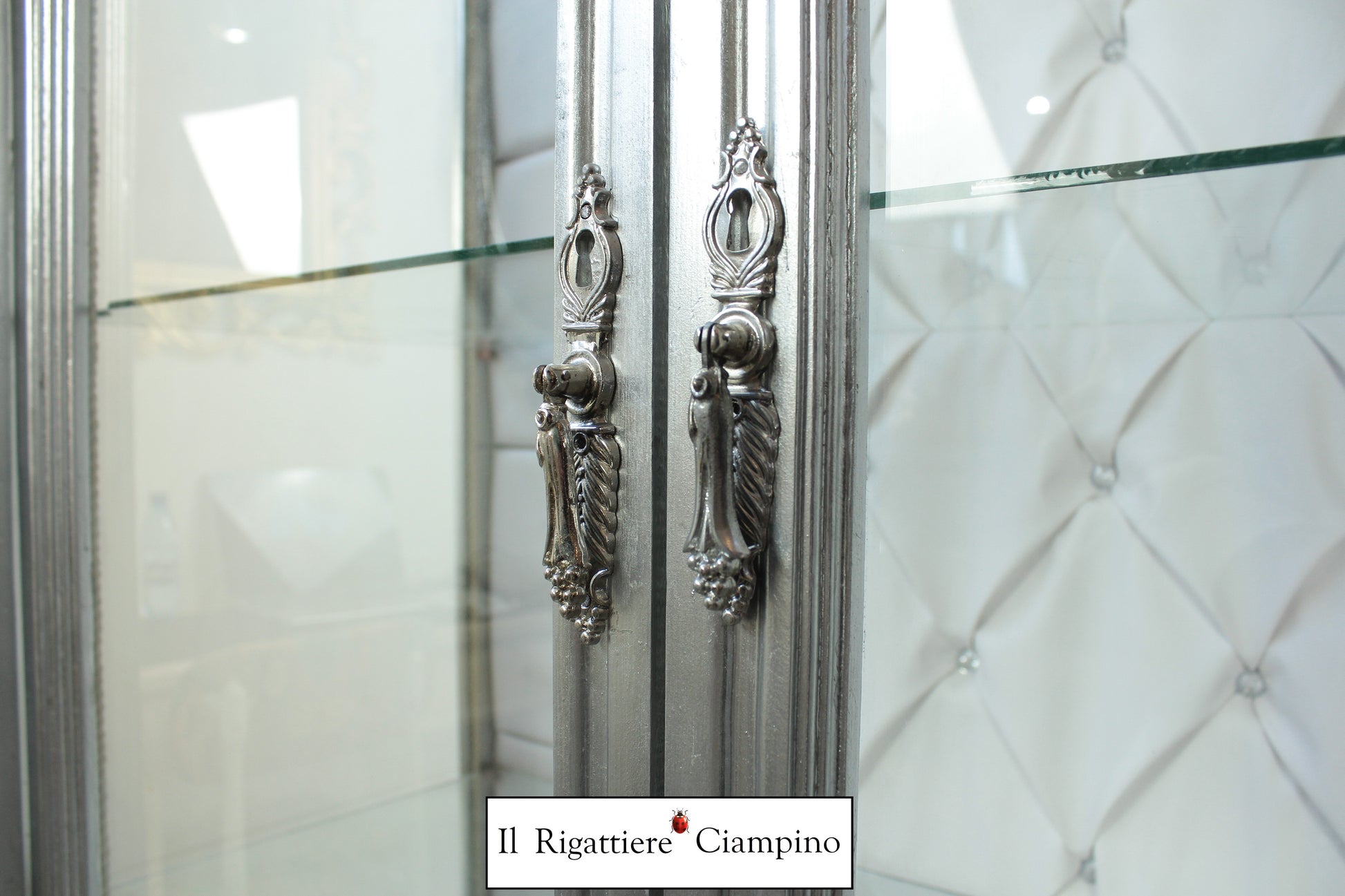 Il Rigattiere Ciampino propone una vetrina da esposizione modello Anastasia in stile barocco, a due ante. Questa splendida vetrina è coperta in foglia argento, dotata di tre piani in vetro intermedi, due cassetti e trapuntata con lavorazione capitonné in ecopelle bianca con bottoni Swarovski.