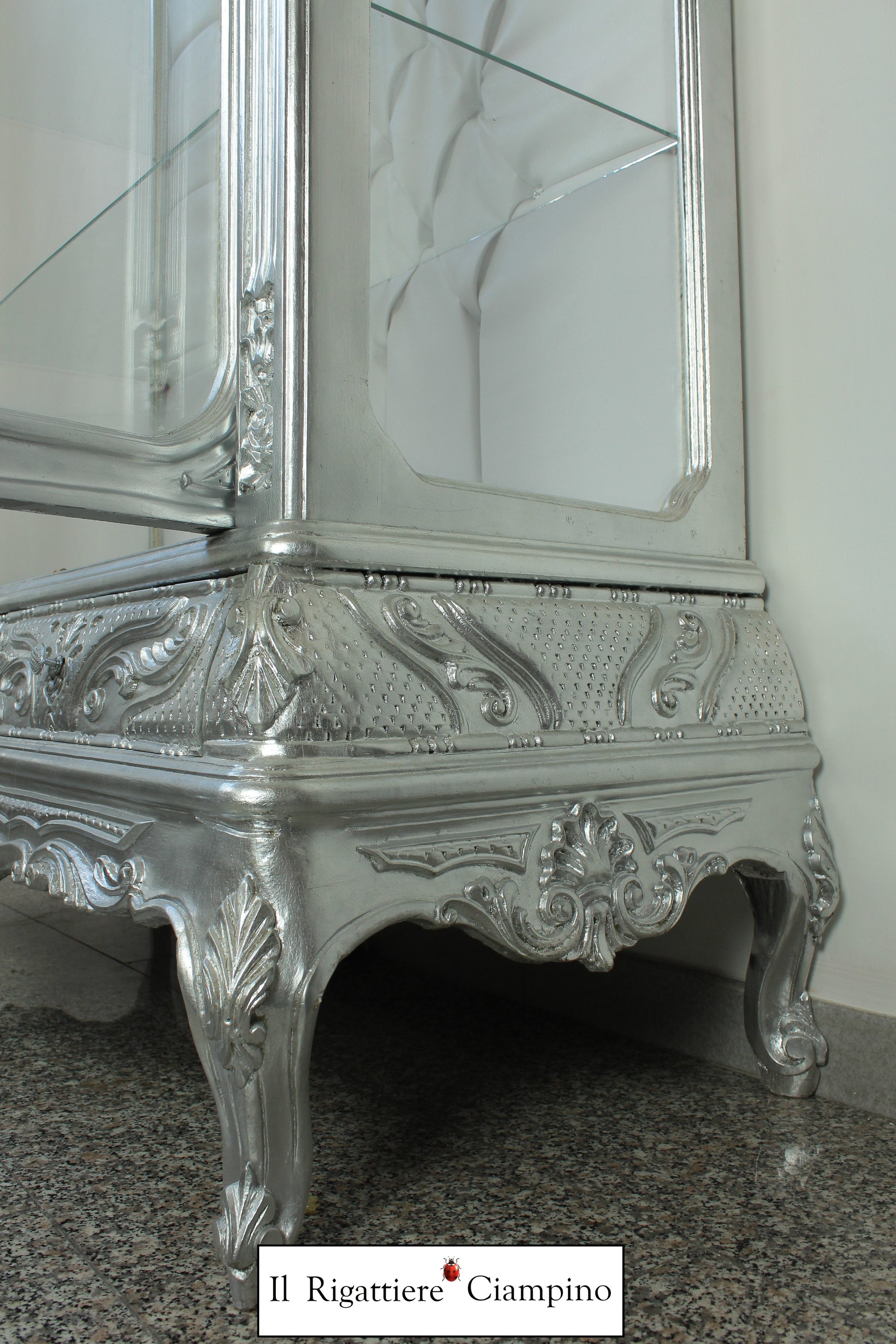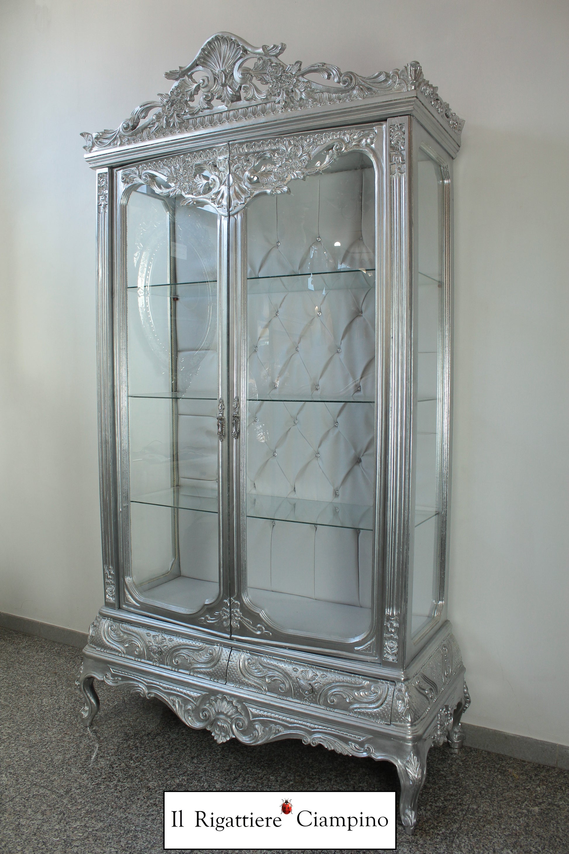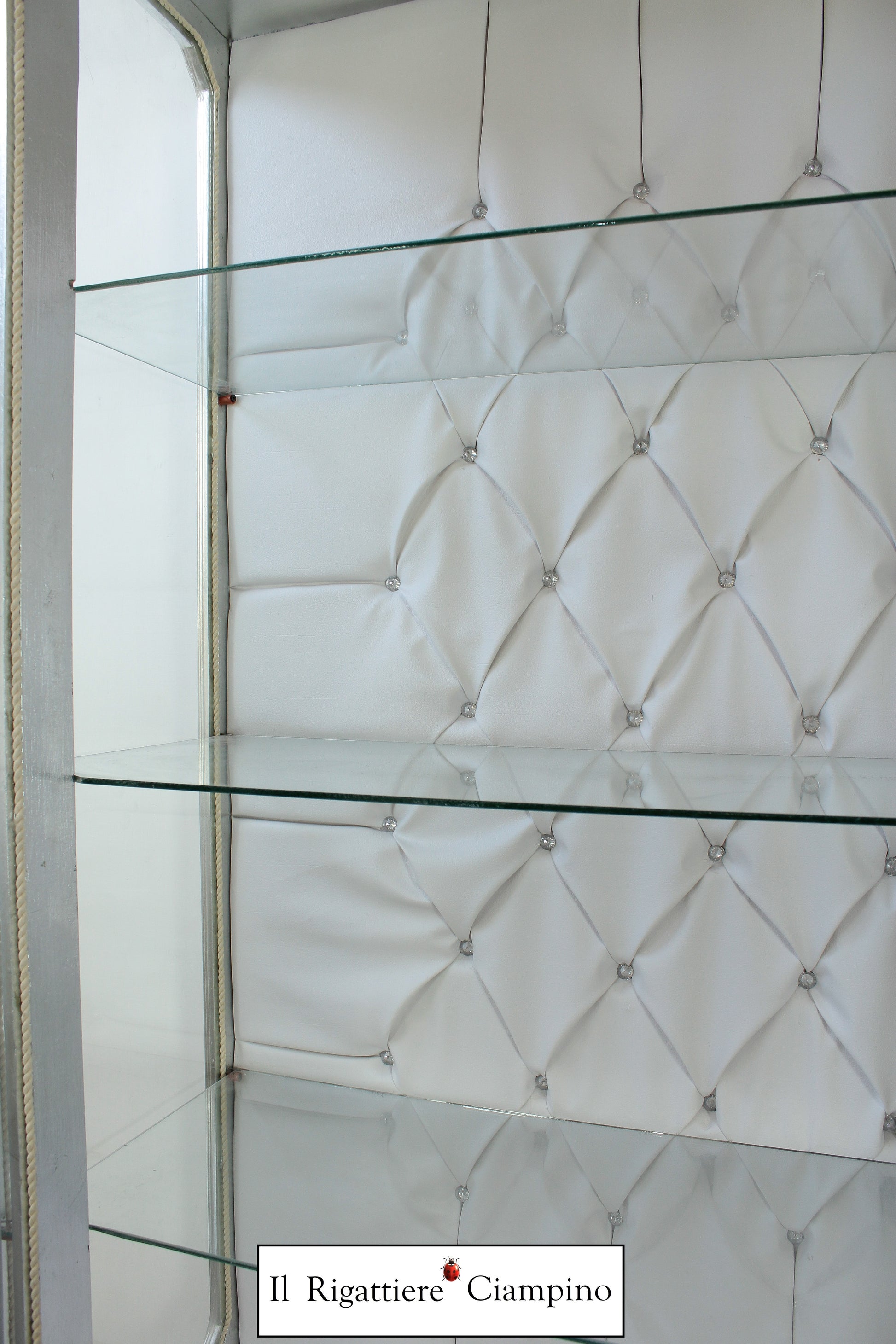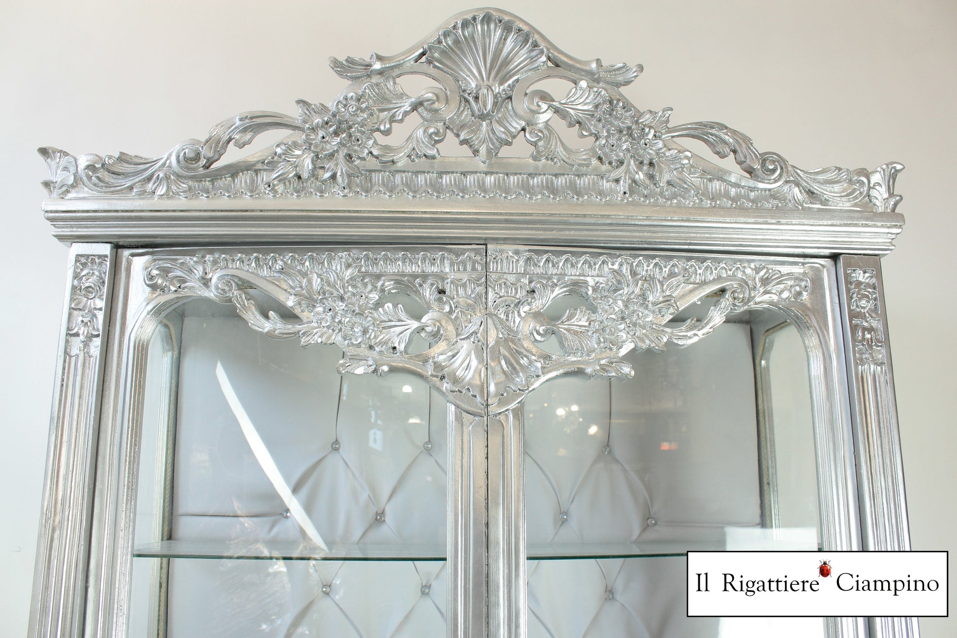 Il Rigattiere Ciampino propone una vetrina da esposizione modello Anastasia in stile barocco, a due ante. Questa splendida vetrina è coperta in foglia argento, dotata di tre piani in vetro intermedi, due cassetti e trapuntata con lavorazione capitonné in ecopelle bianca con bottoni Swarovski.