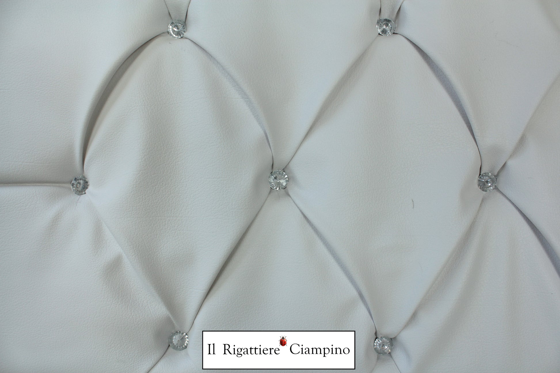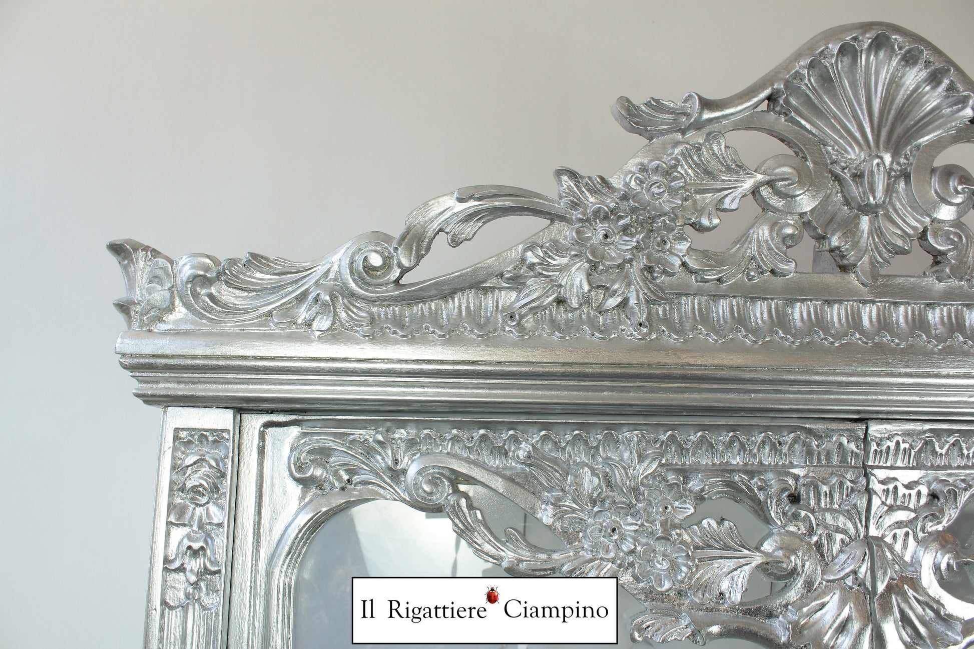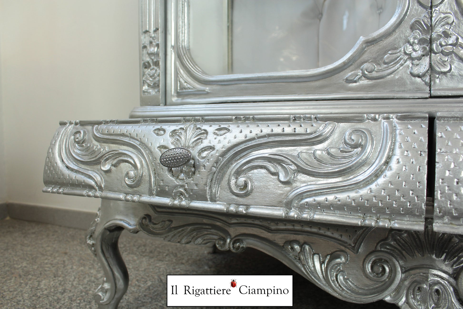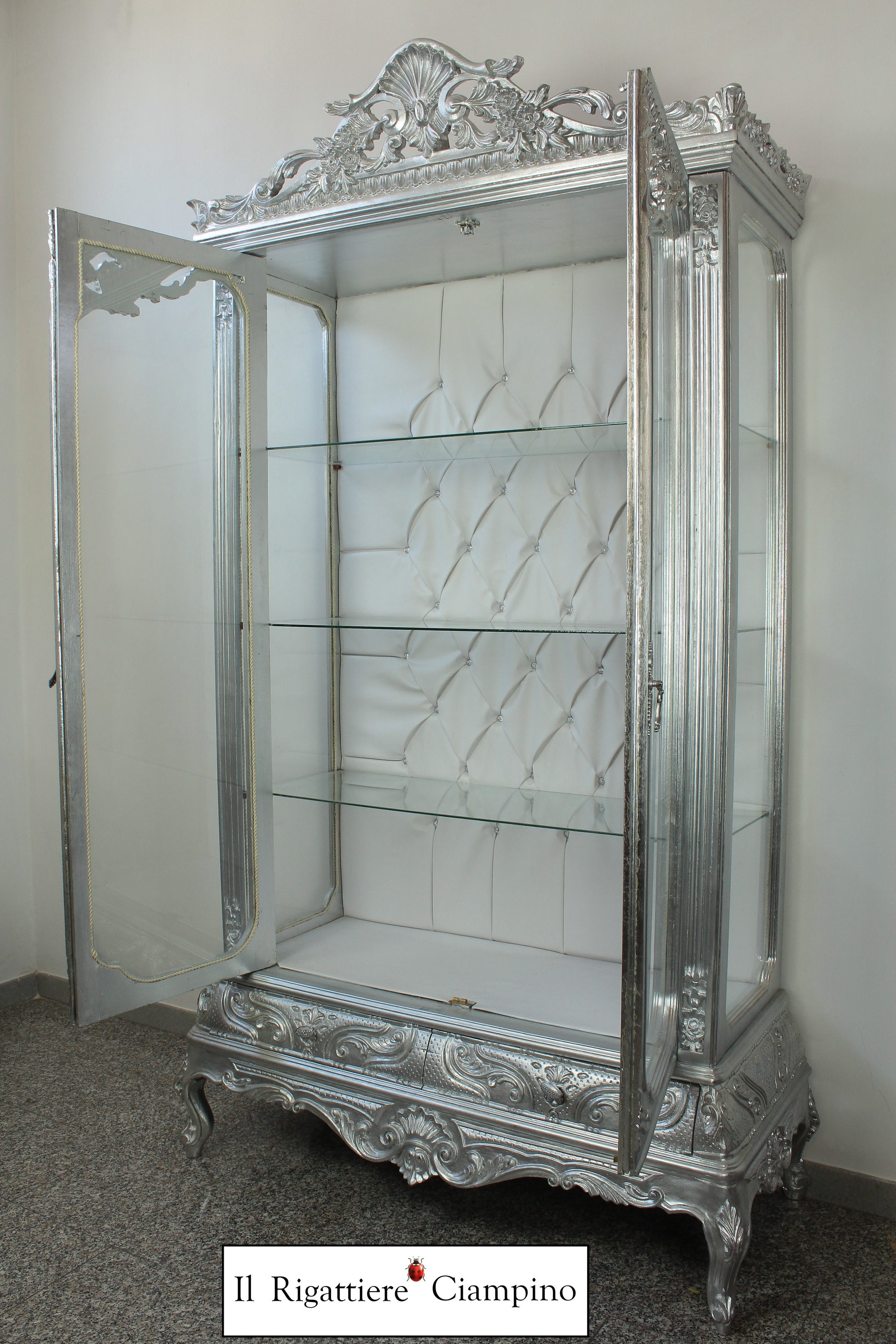 Il Rigattiere Ciampino propone una vetrina da esposizione modello Anastasia in stile barocco, a due ante. Questa splendida vetrina è coperta in foglia argento, dotata di tre piani in vetro intermedi, due cassetti e trapuntata con lavorazione capitonné in ecopelle bianca con bottoni Swarovski.