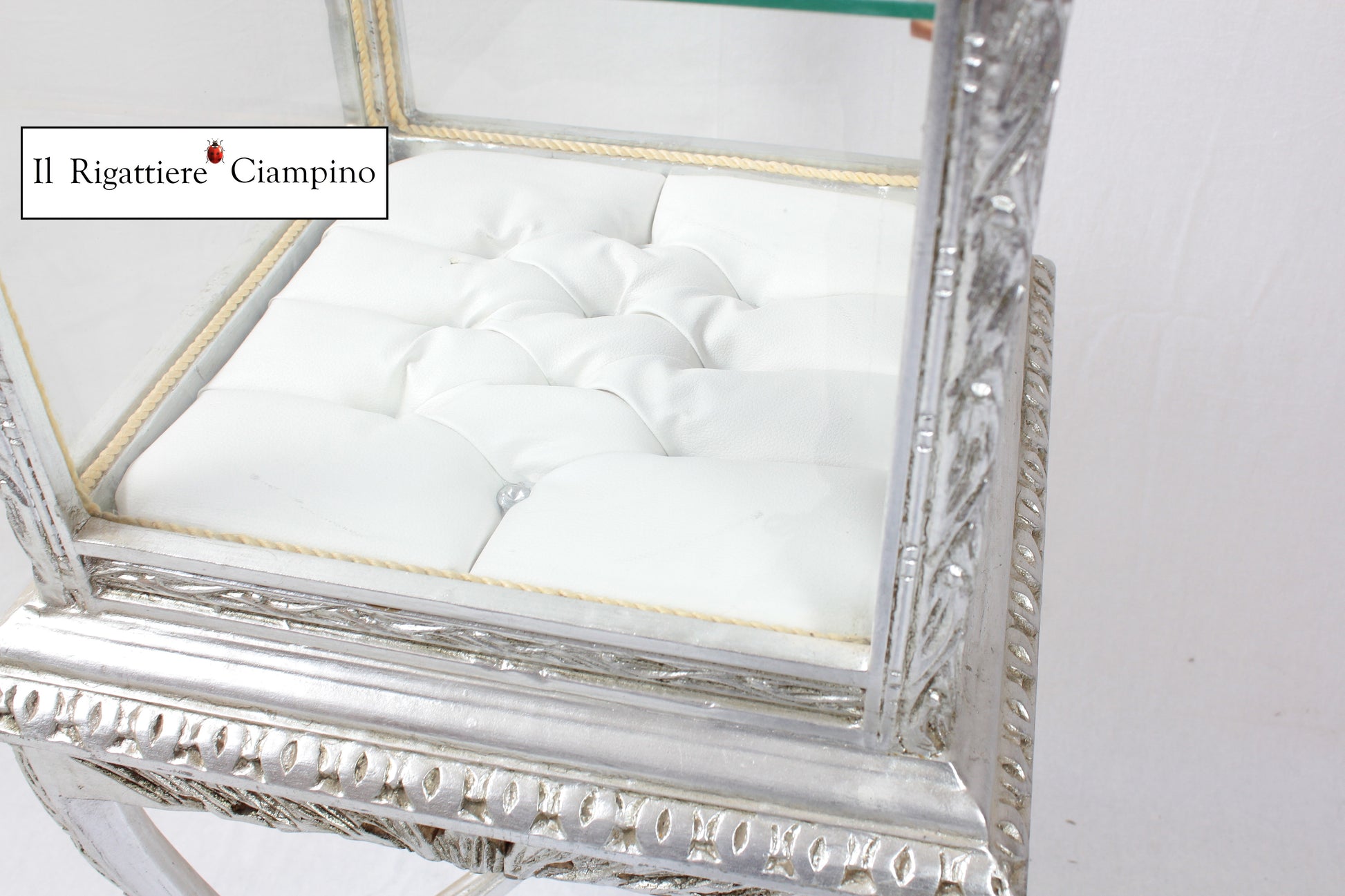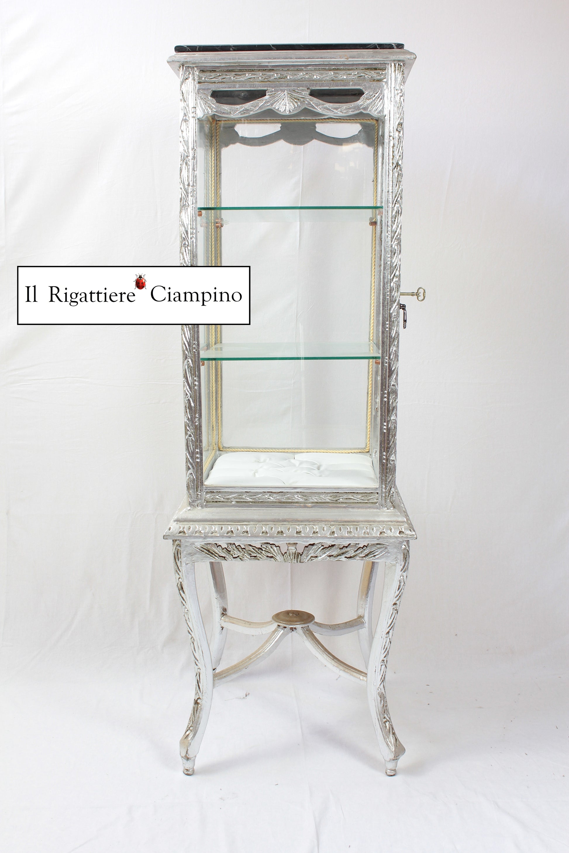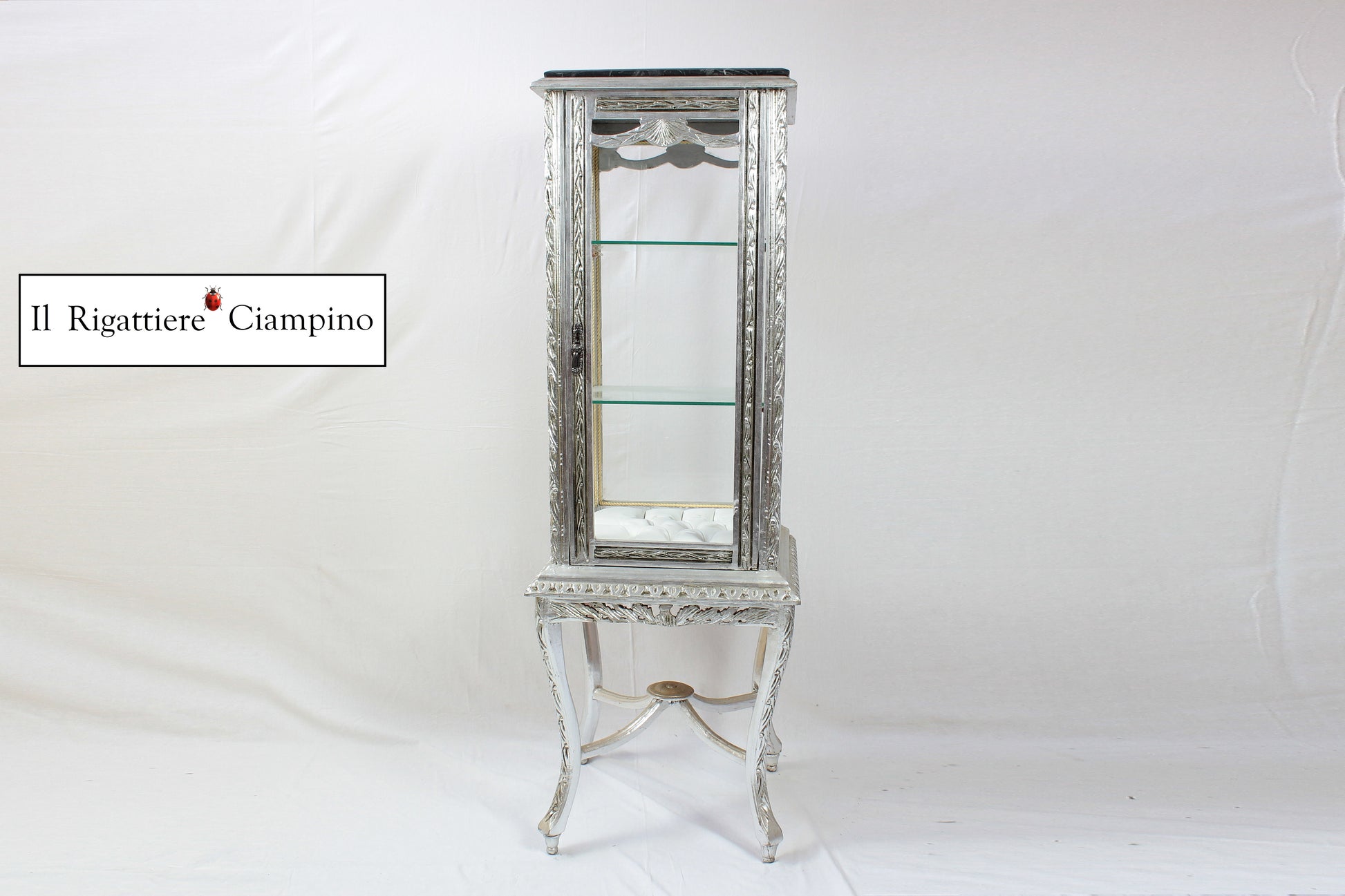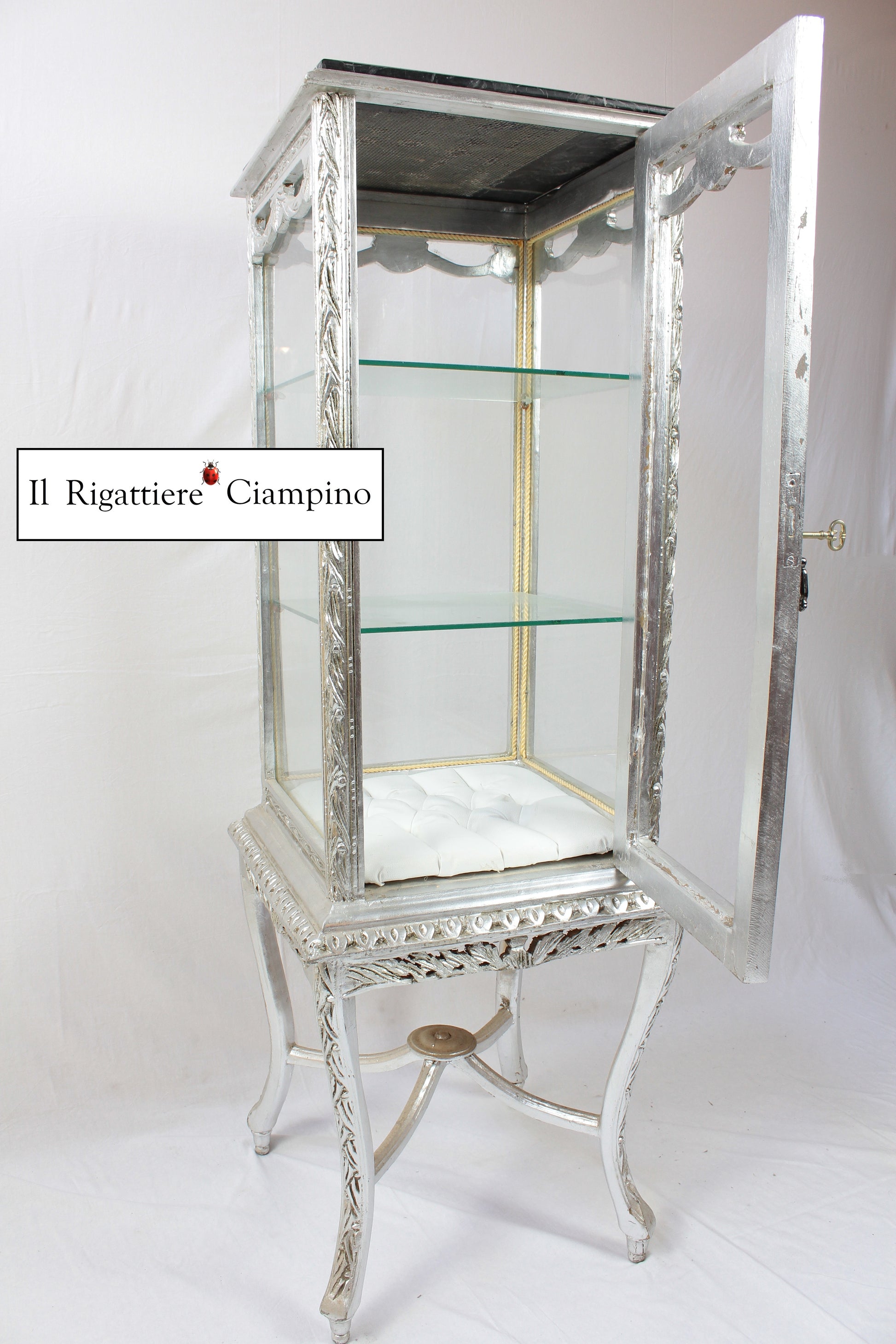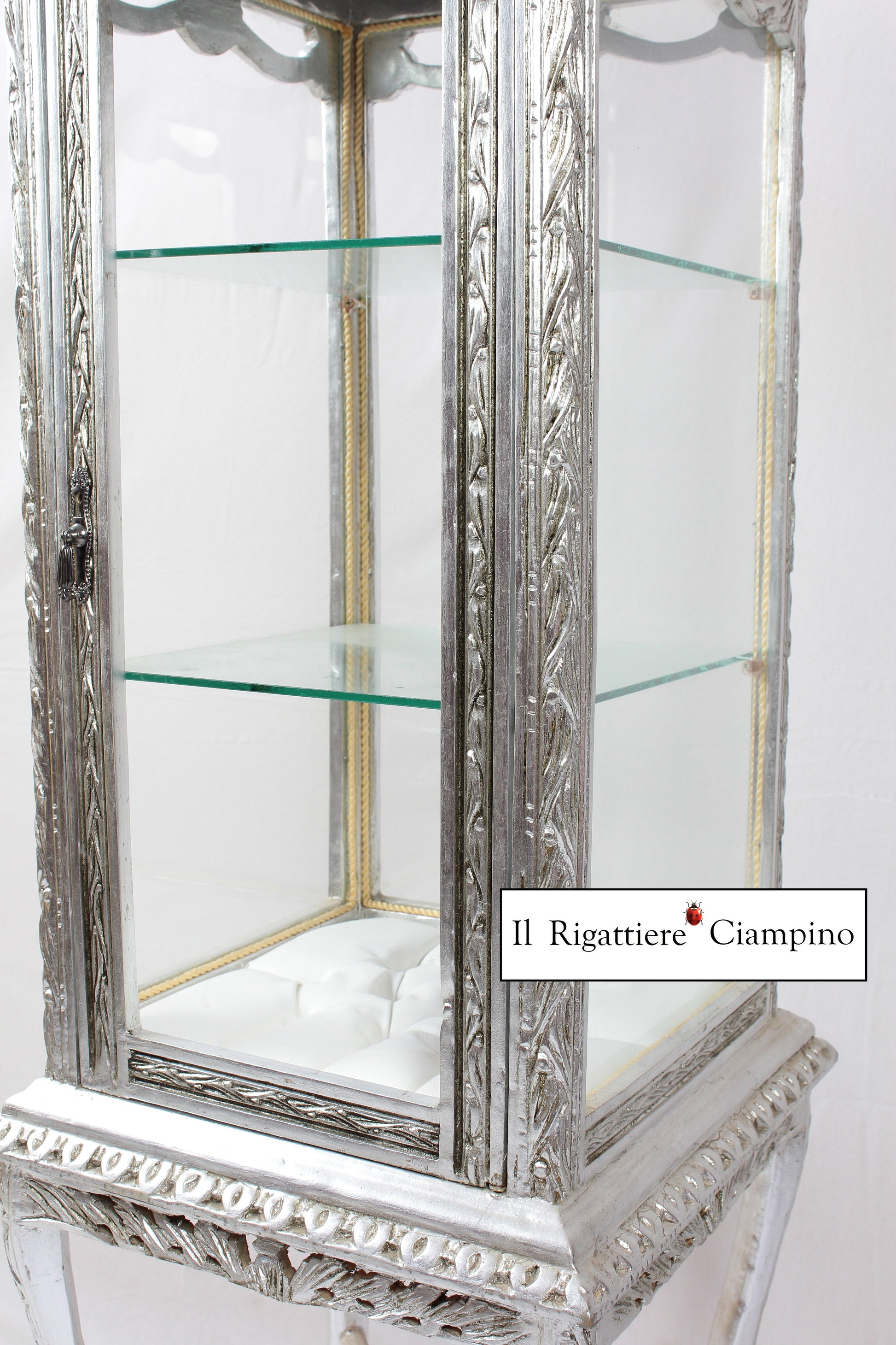 Il Rigattiere Ciampino propone una luminosa vetrina modello Anna, in stile barocco, con due piani in vetro e uno in capitonné, molto elegante e bella. Per donare splendore al tuo salotto, ed esporre e dare valore agli oggetti più belli della vostra casa.