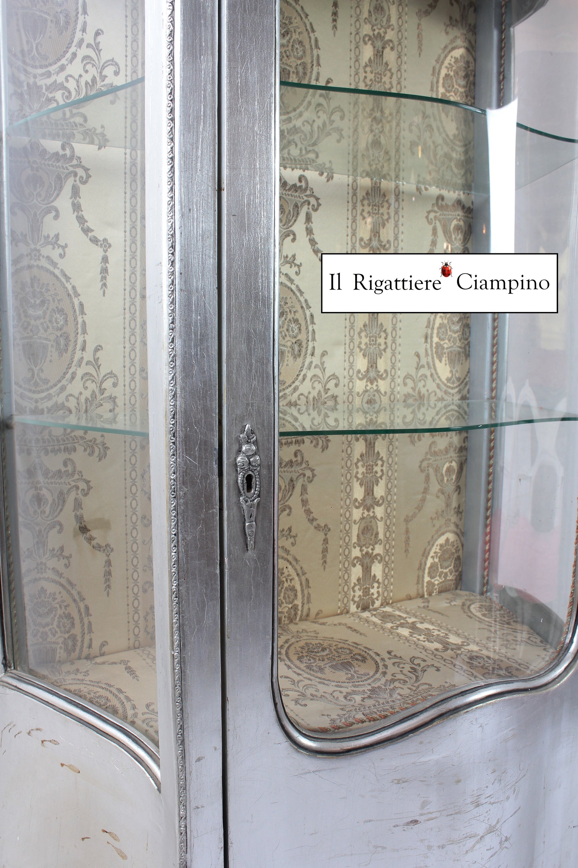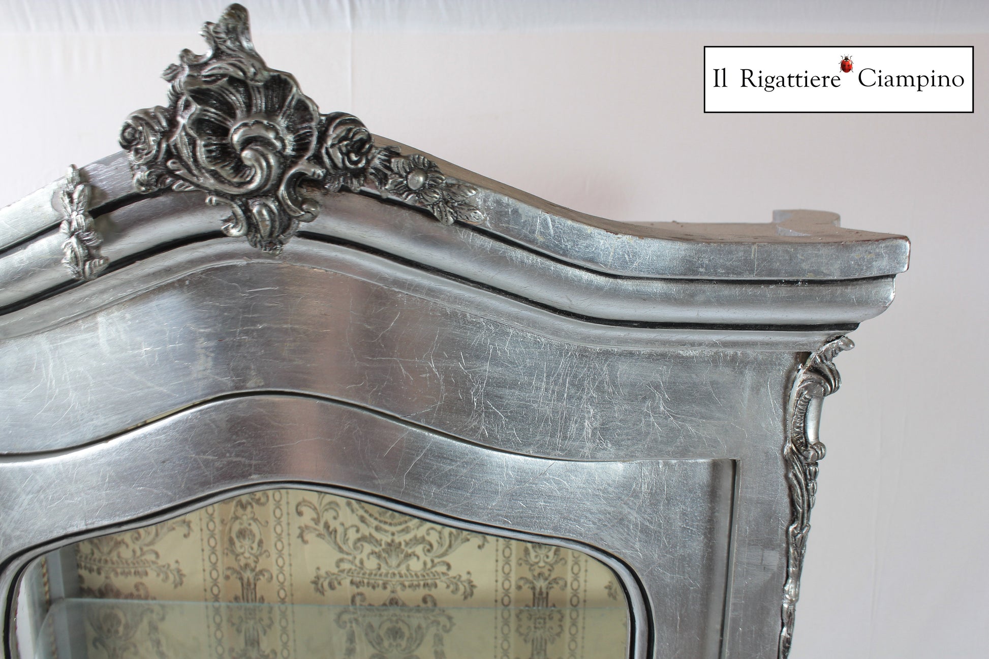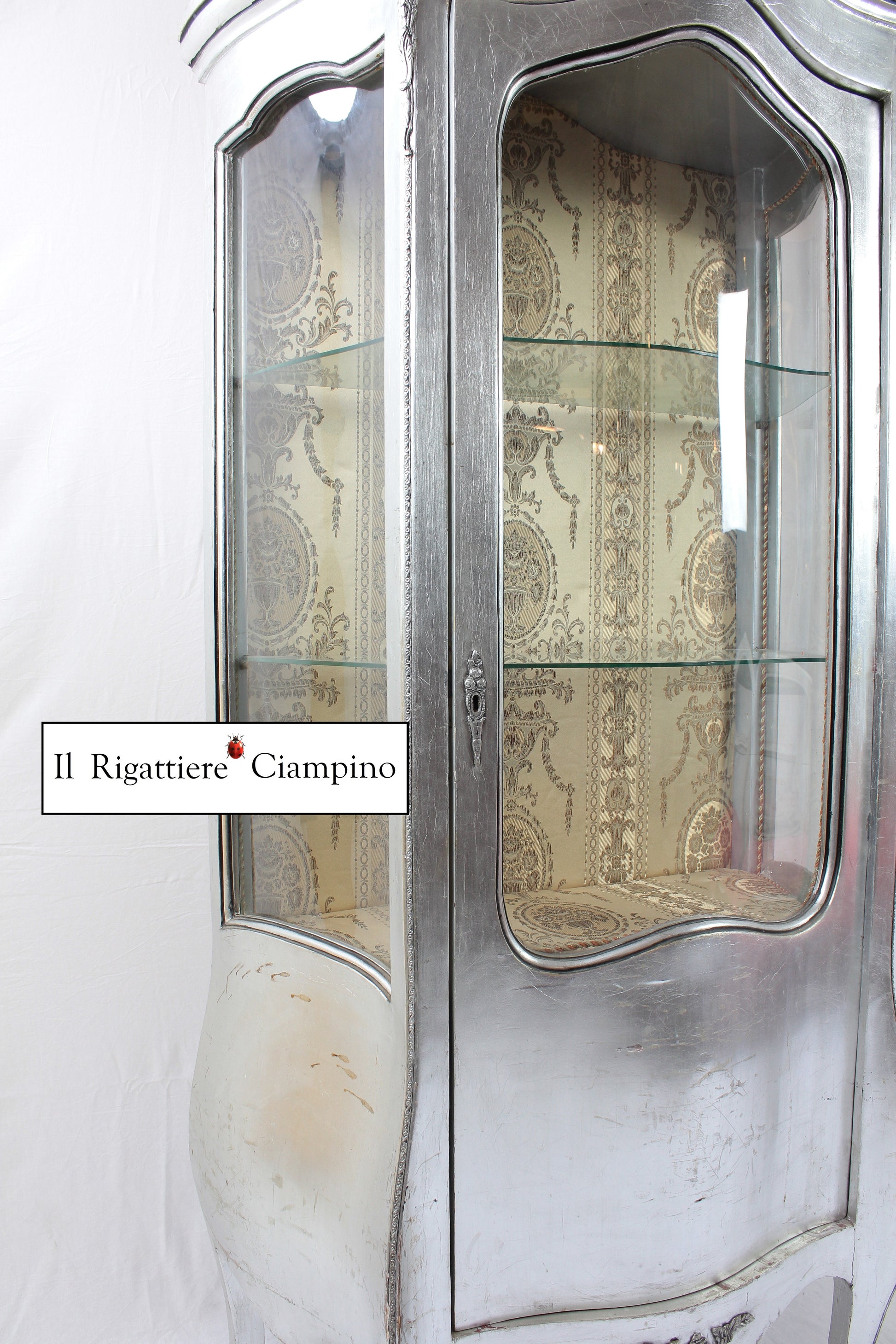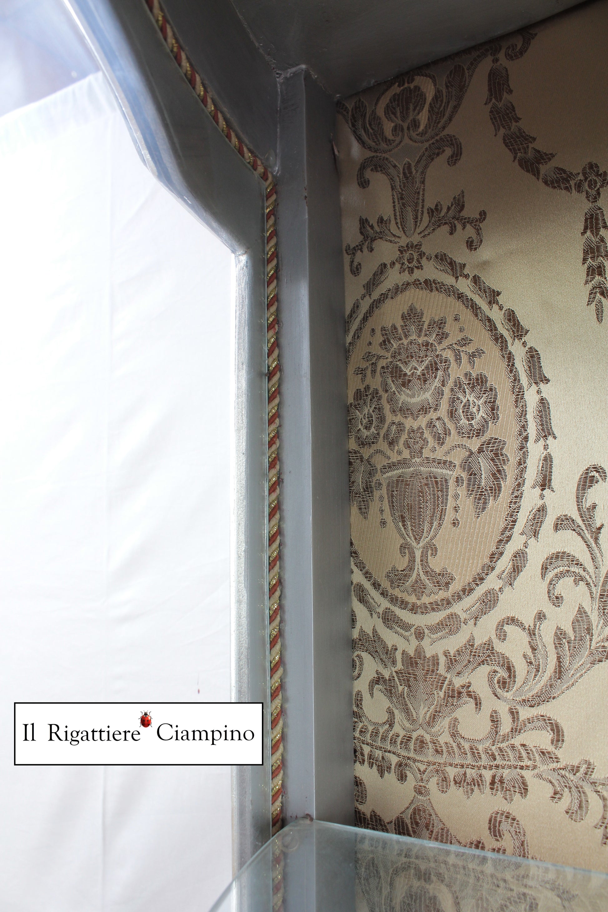 Vetrina Concetta in stile barocco, foglia argento e tessuto damasco