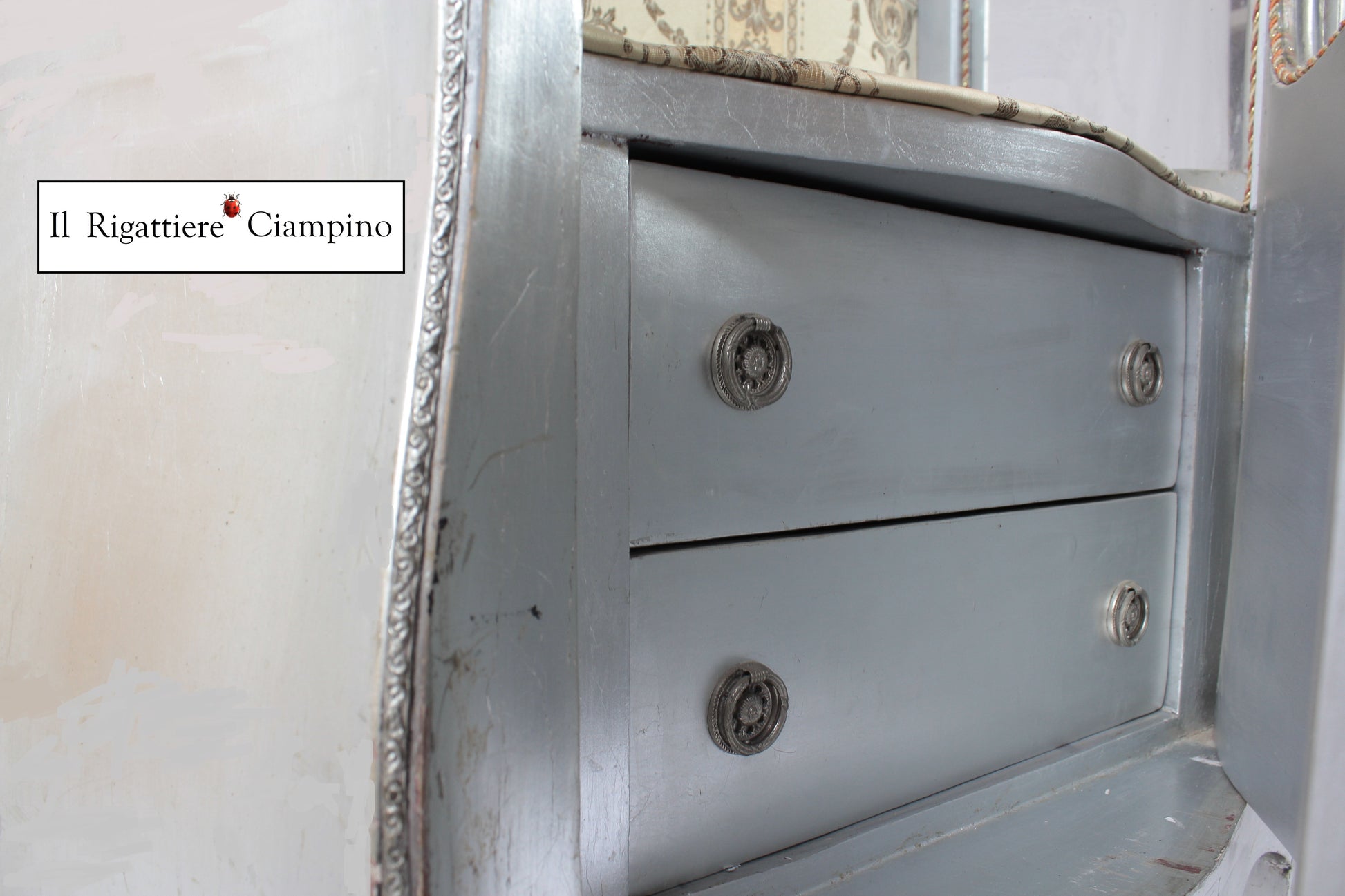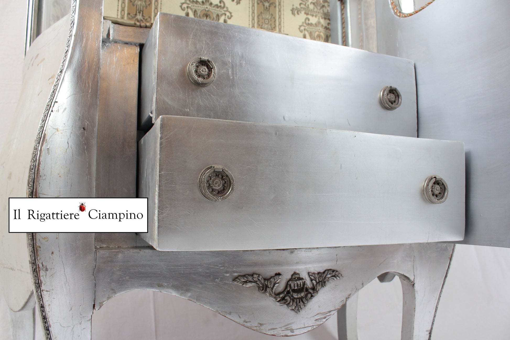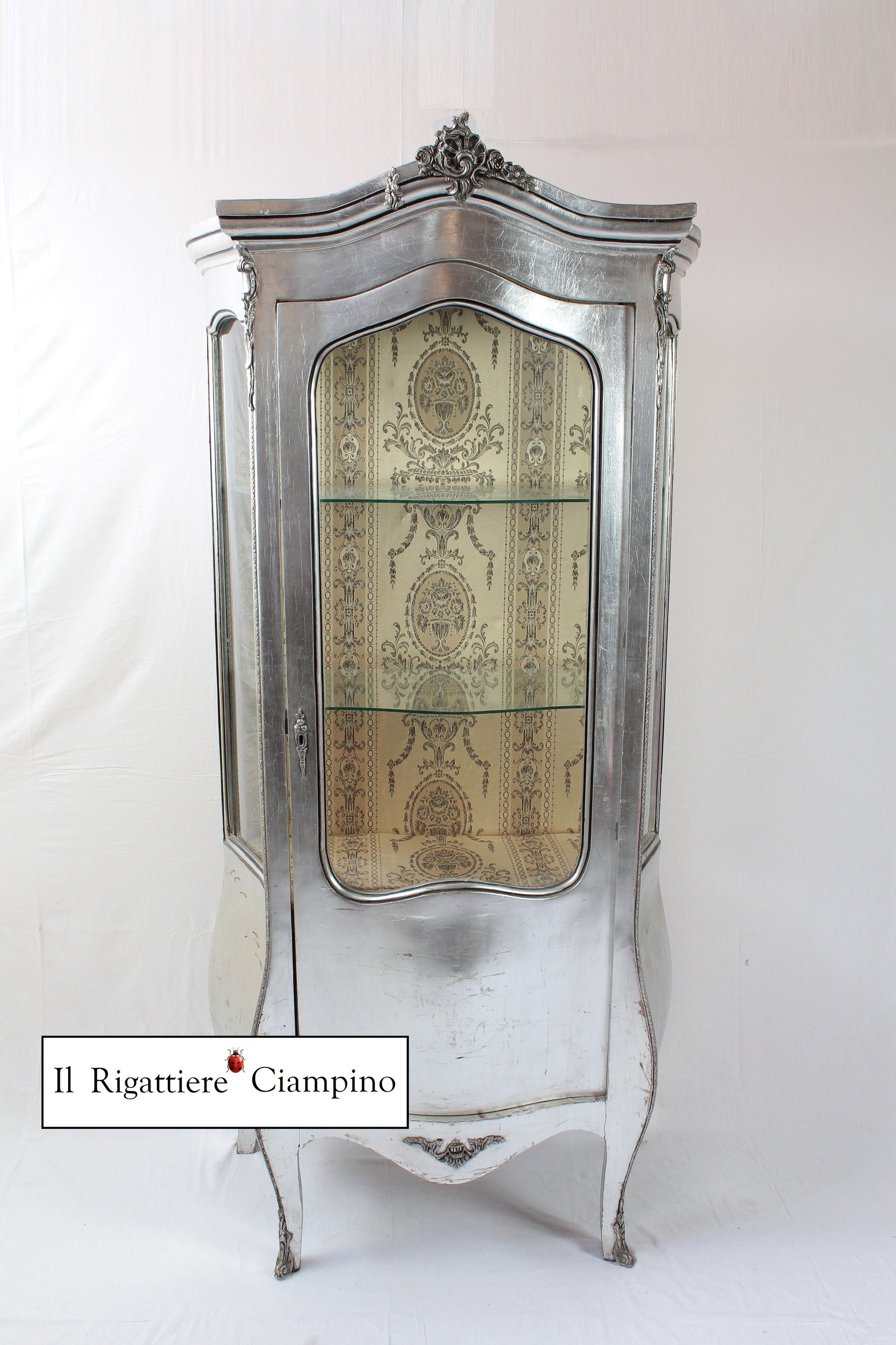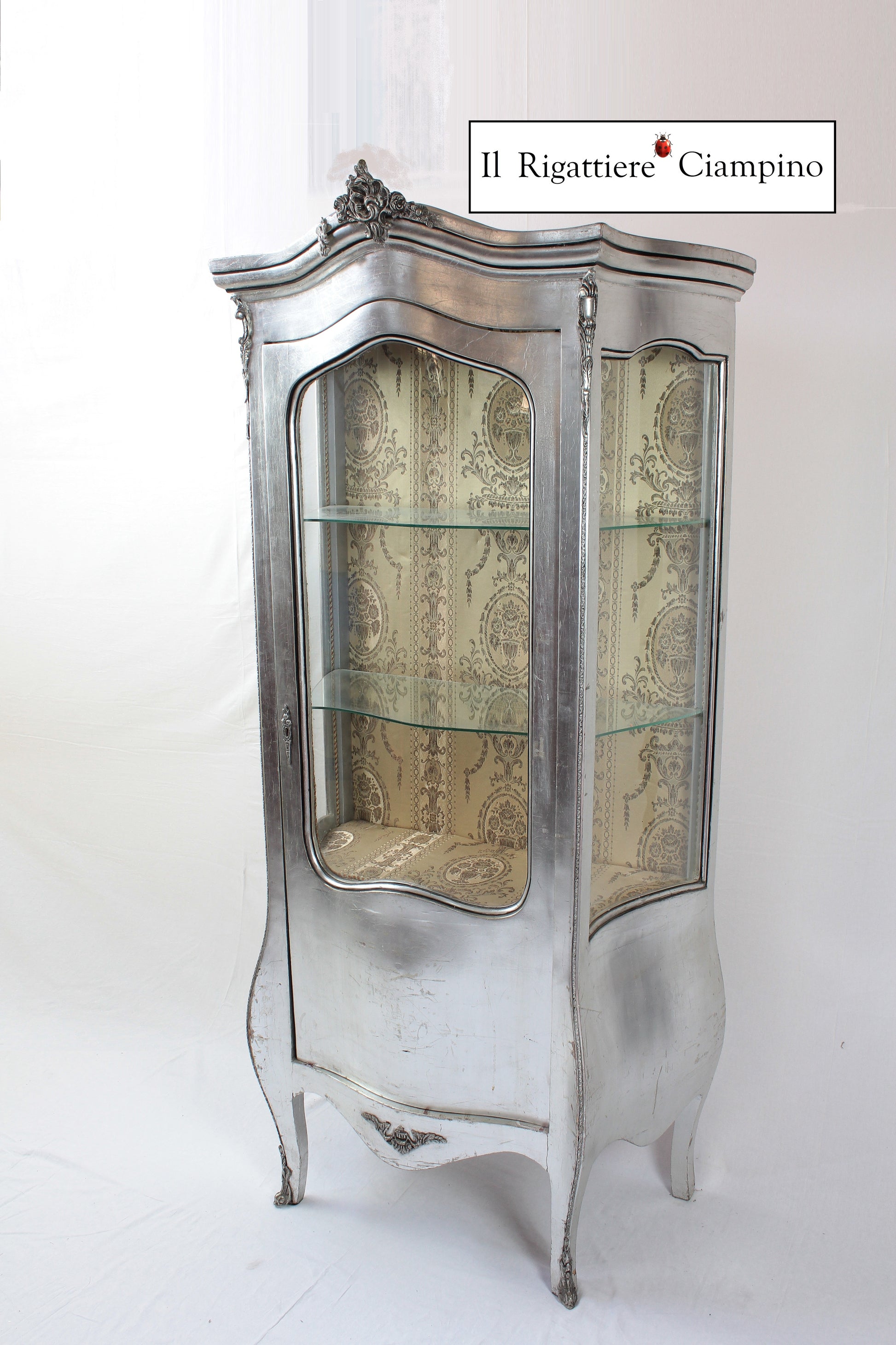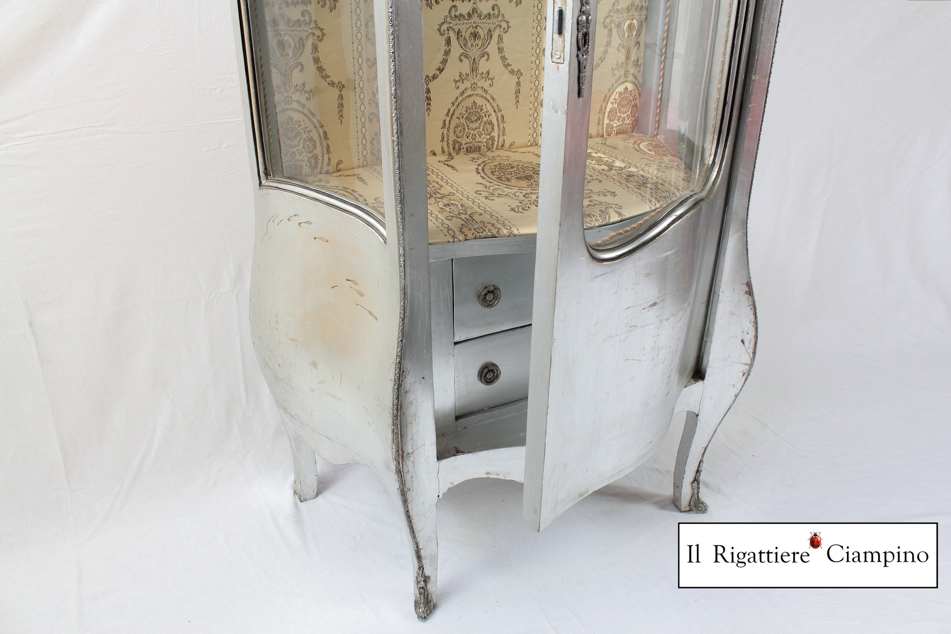 Vetrina Concetta in stile barocco, foglia argento e tessuto damasco