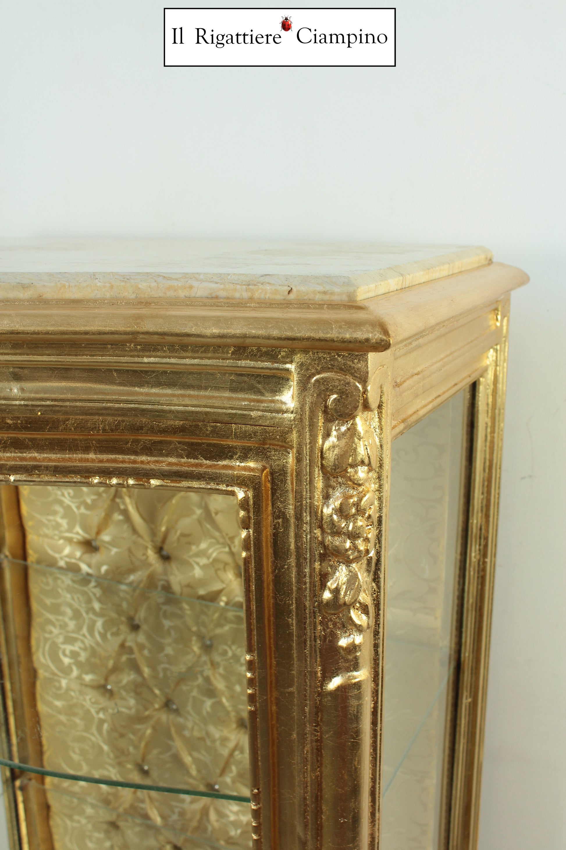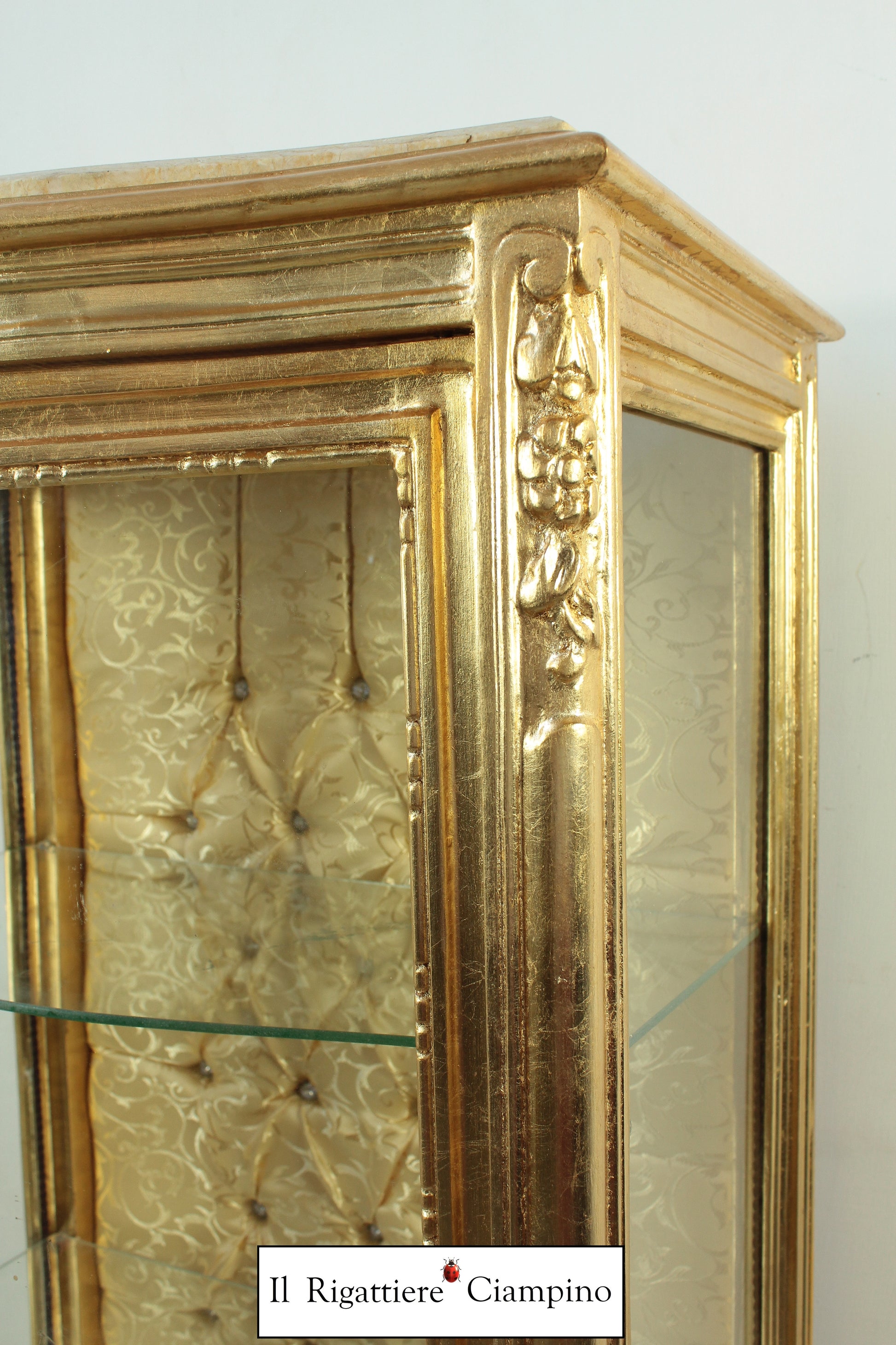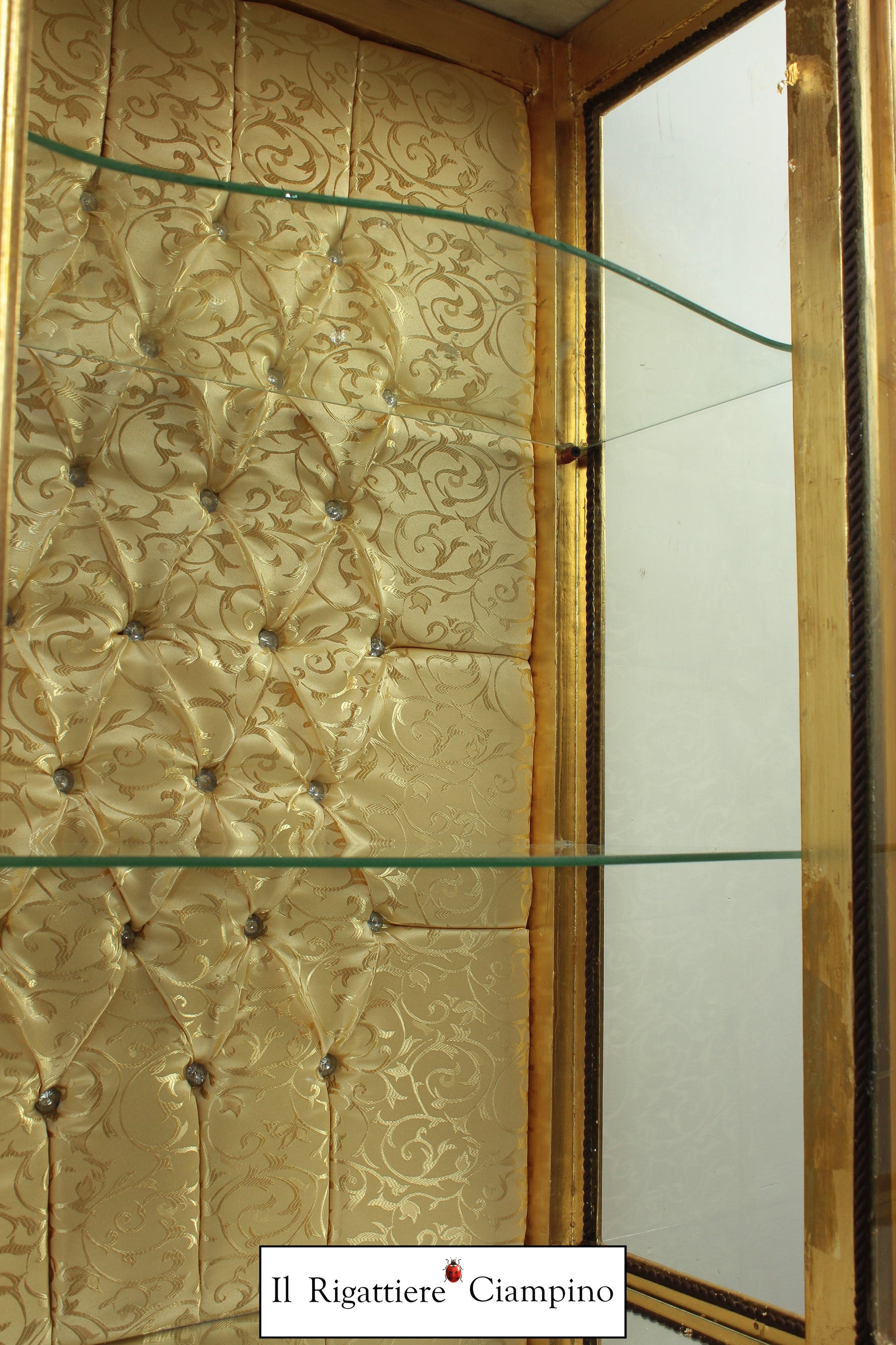 Il Rigattiere Ciampino propone una vetrina da esposizione in foglia oro, in legno massello, in stile barocco, dotata di 2 piani in vetro intermedi e fondo specchiato, rivestimento interno con lavorazione capitonné su tessuto damascato color avorio, tirato con bottoni Swarovski. Piano superiore in marmo.