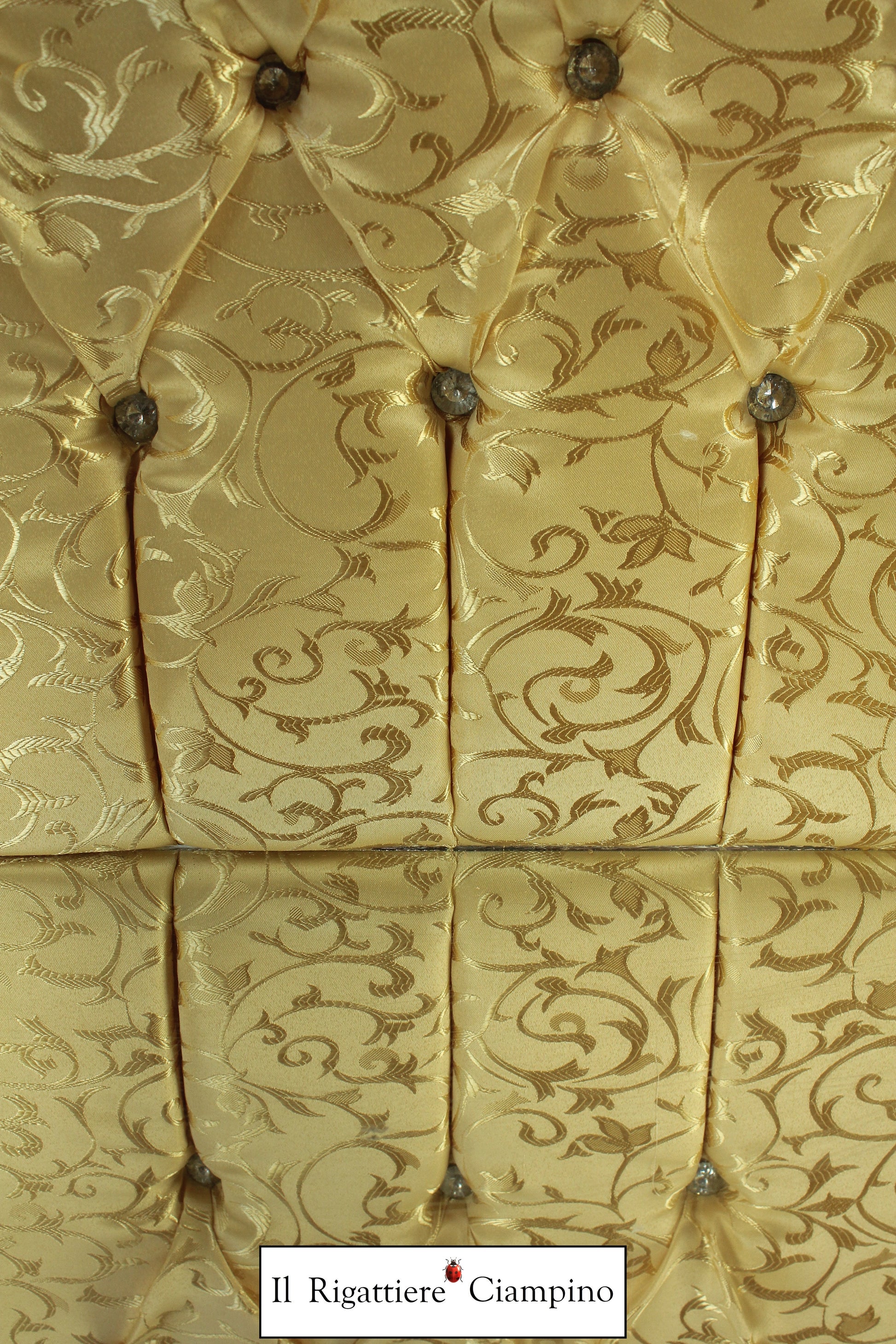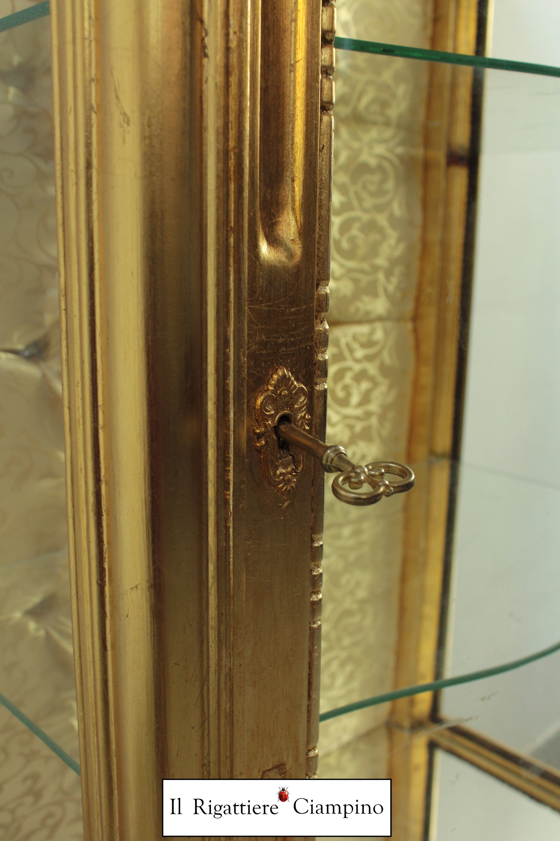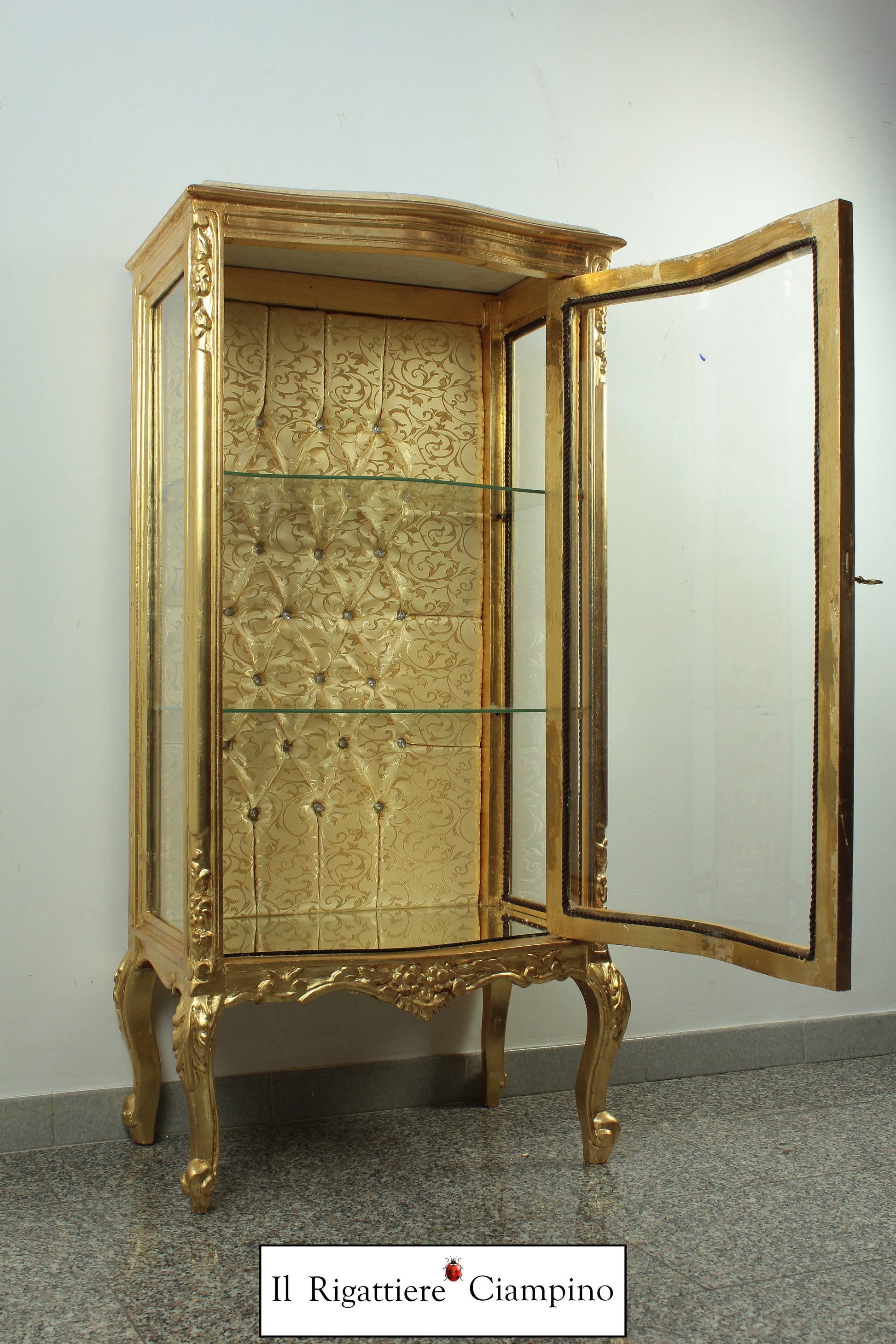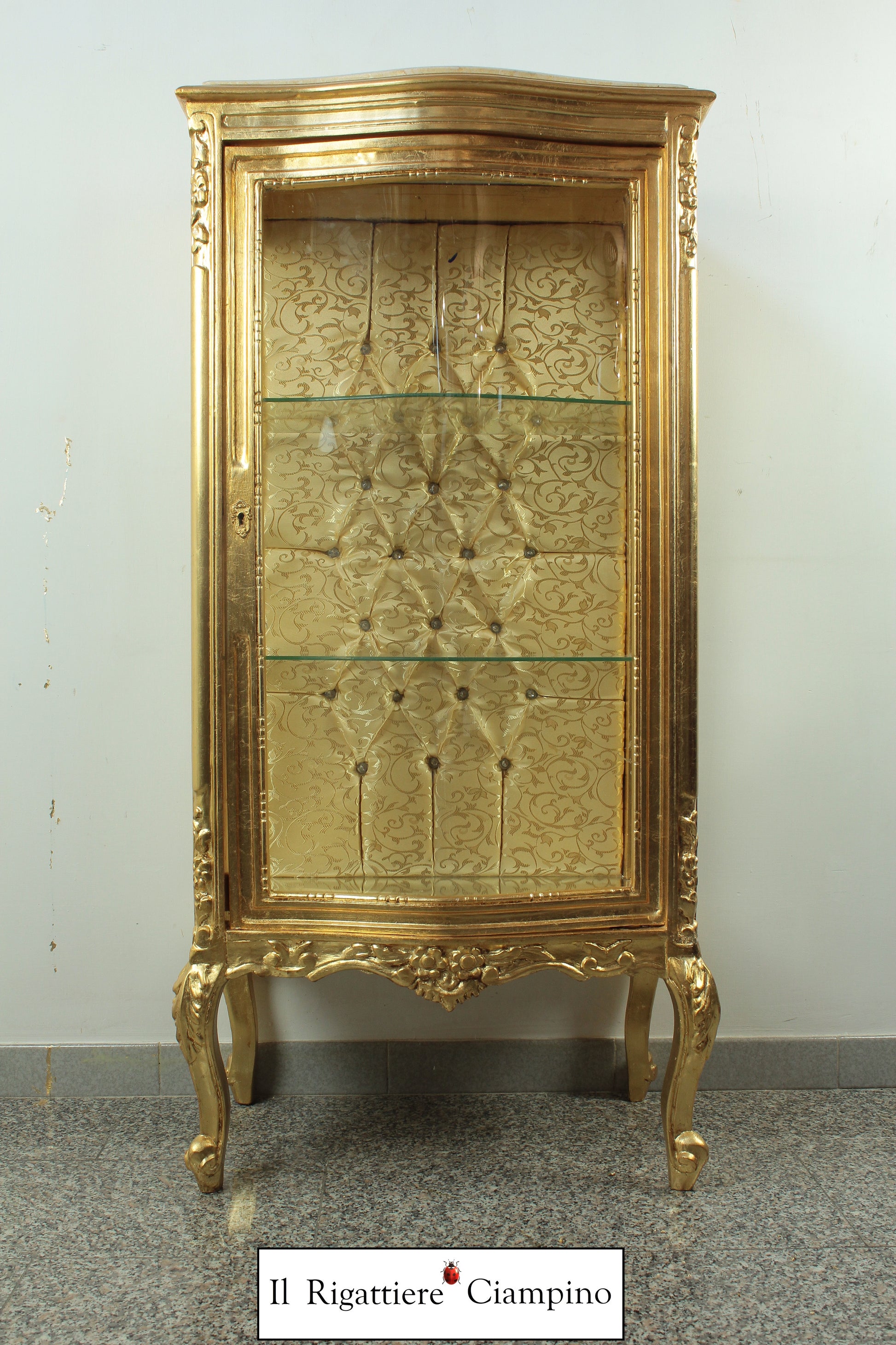 Il Rigattiere Ciampino propone una vetrina da esposizione in foglia oro, in legno massello, in stile barocco, dotata di 2 piani in vetro intermedi e fondo specchiato, rivestimento interno con lavorazione capitonné su tessuto damascato color avorio, tirato con bottoni Swarovski. Piano superiore in marmo.