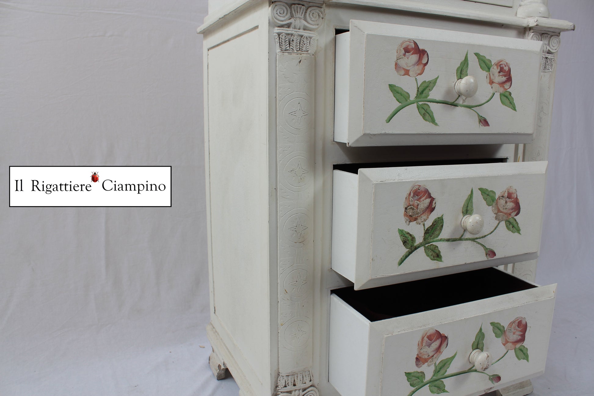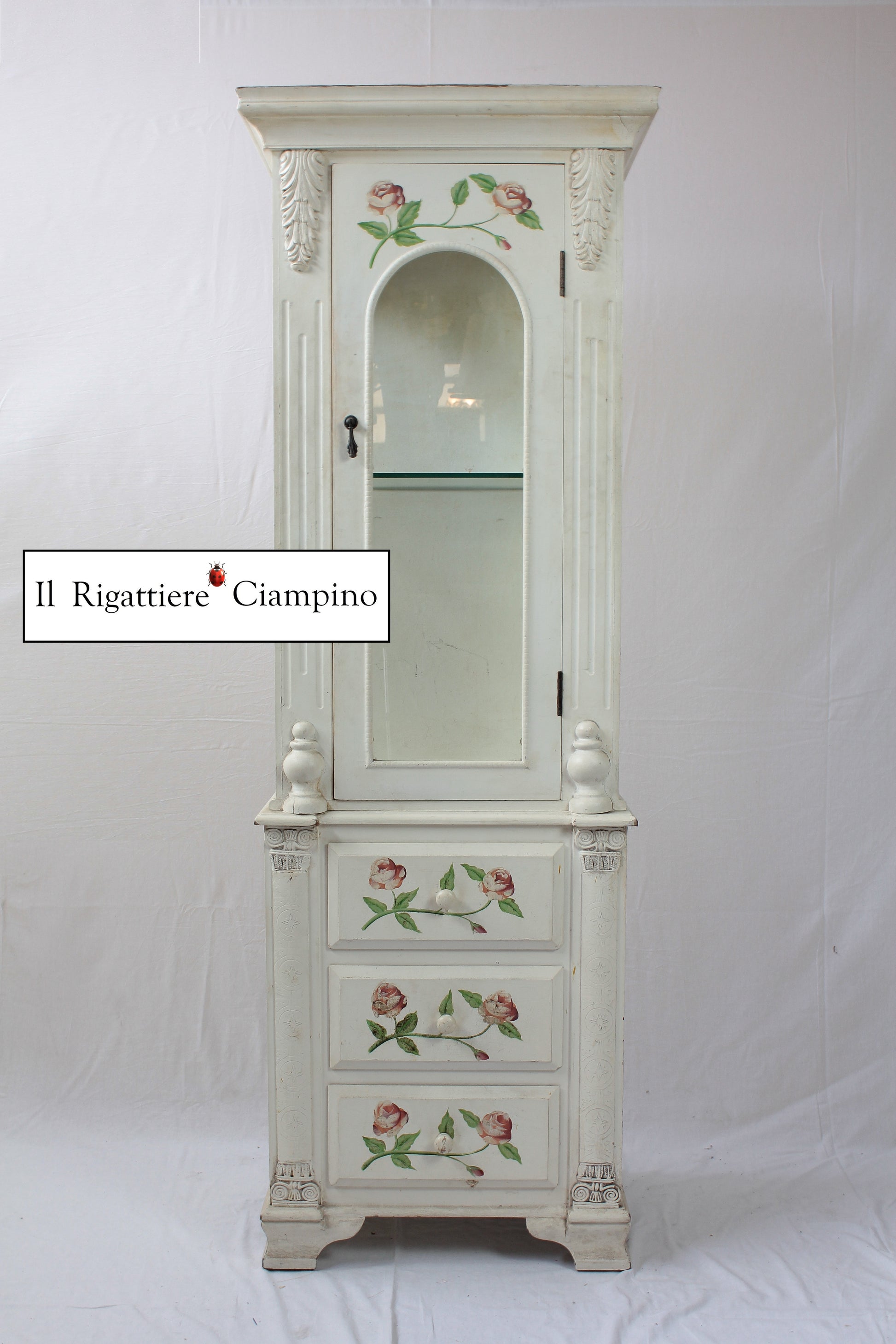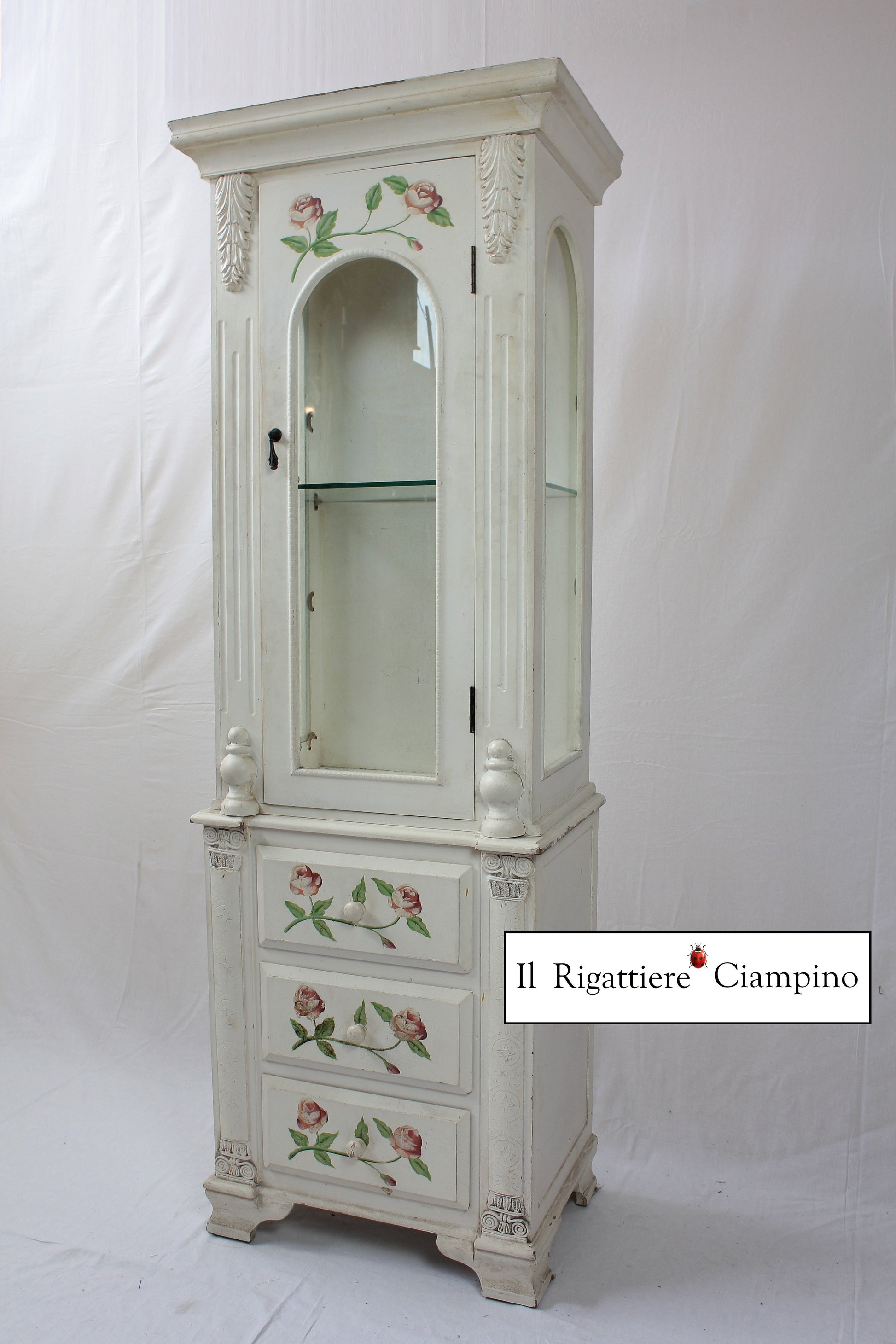 Il Rigattiere Ciampino propone una vetrina in legno mdf, modello Giuditta, in stile provenzale, impreziosita da dipinti a mano in acrilico, con 3 cassetti e 1 piano intermedio in vetro oltre al piano della base. Per donare armonia e luminosità al tuo salotto.