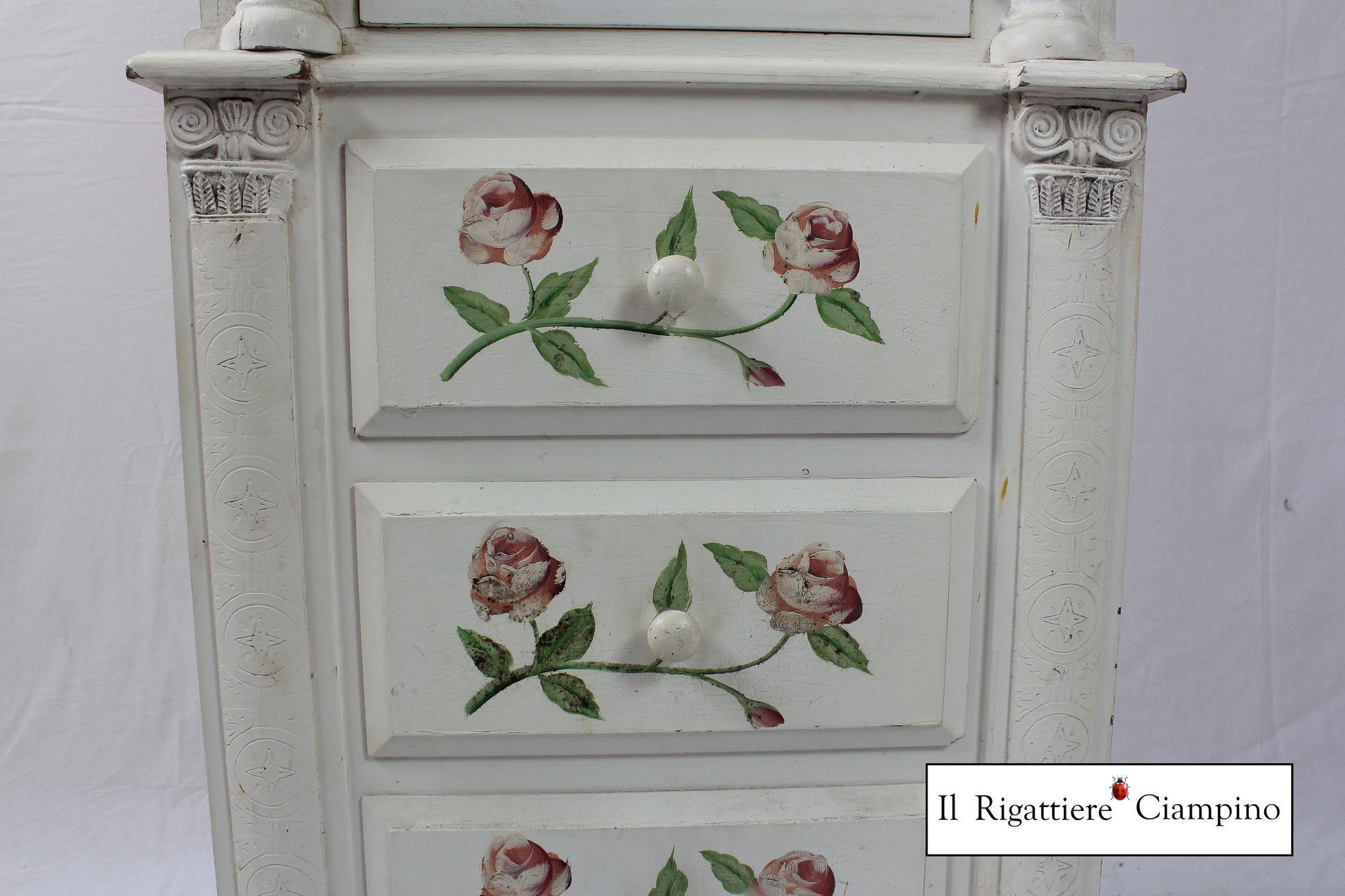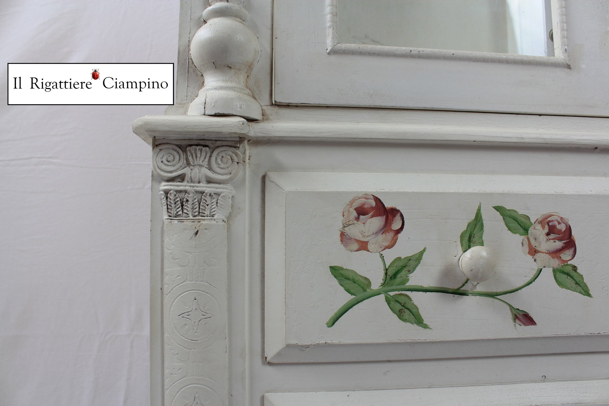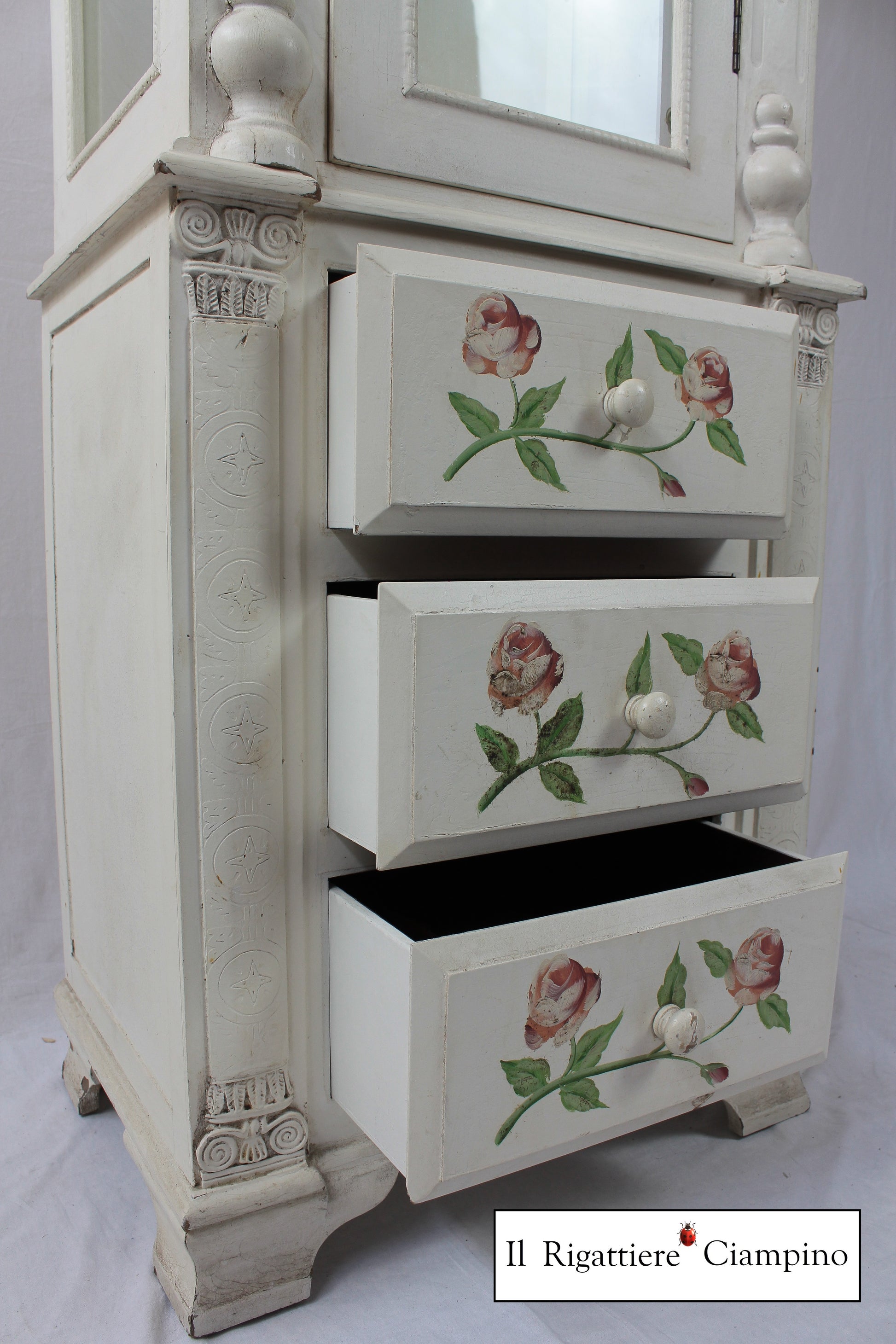 Il Rigattiere Ciampino propone una vetrina in legno mdf, modello Giuditta, in stile provenzale, impreziosita da dipinti a mano in acrilico, con 3 cassetti e 1 piano intermedio in vetro oltre al piano della base. Per donare armonia e luminosità al tuo salotto.