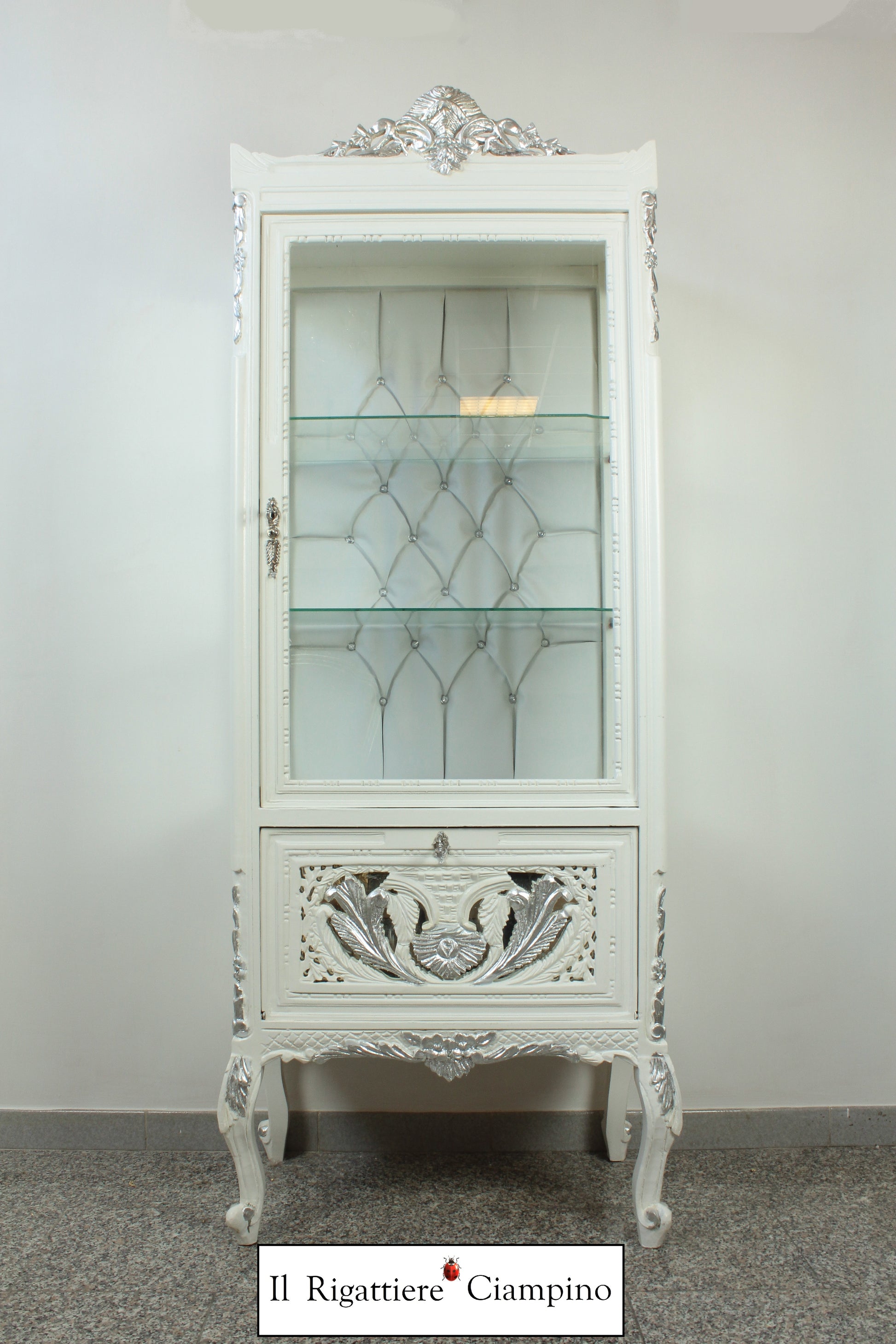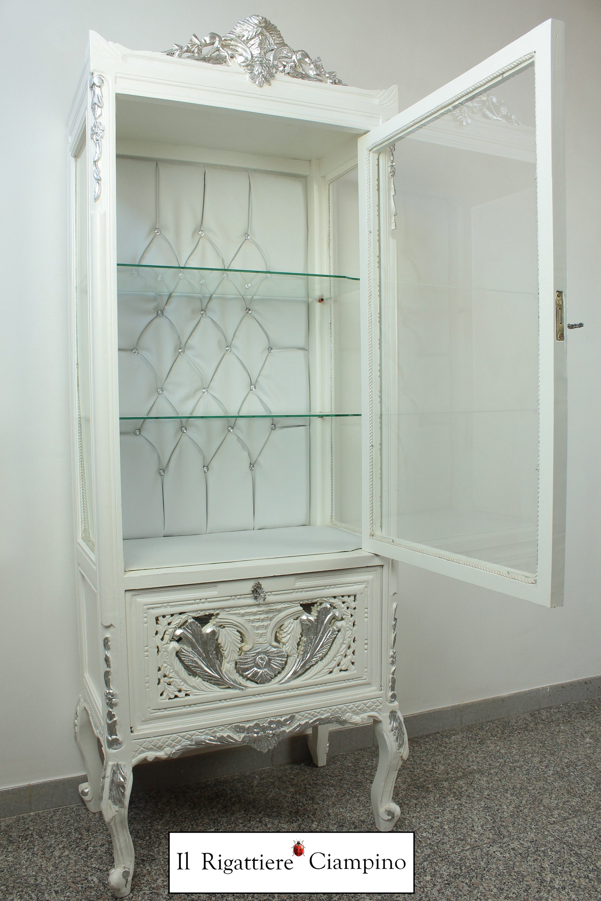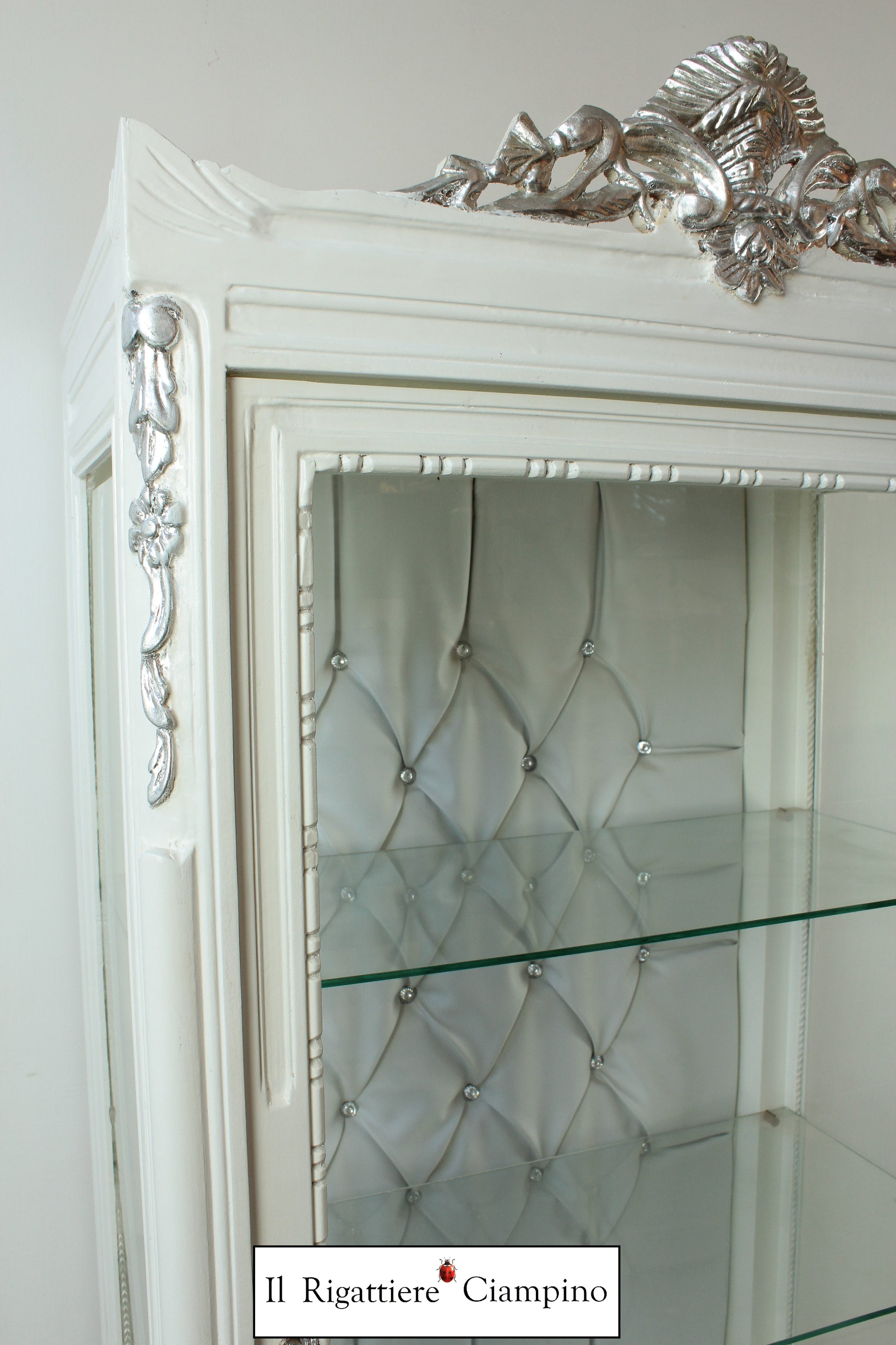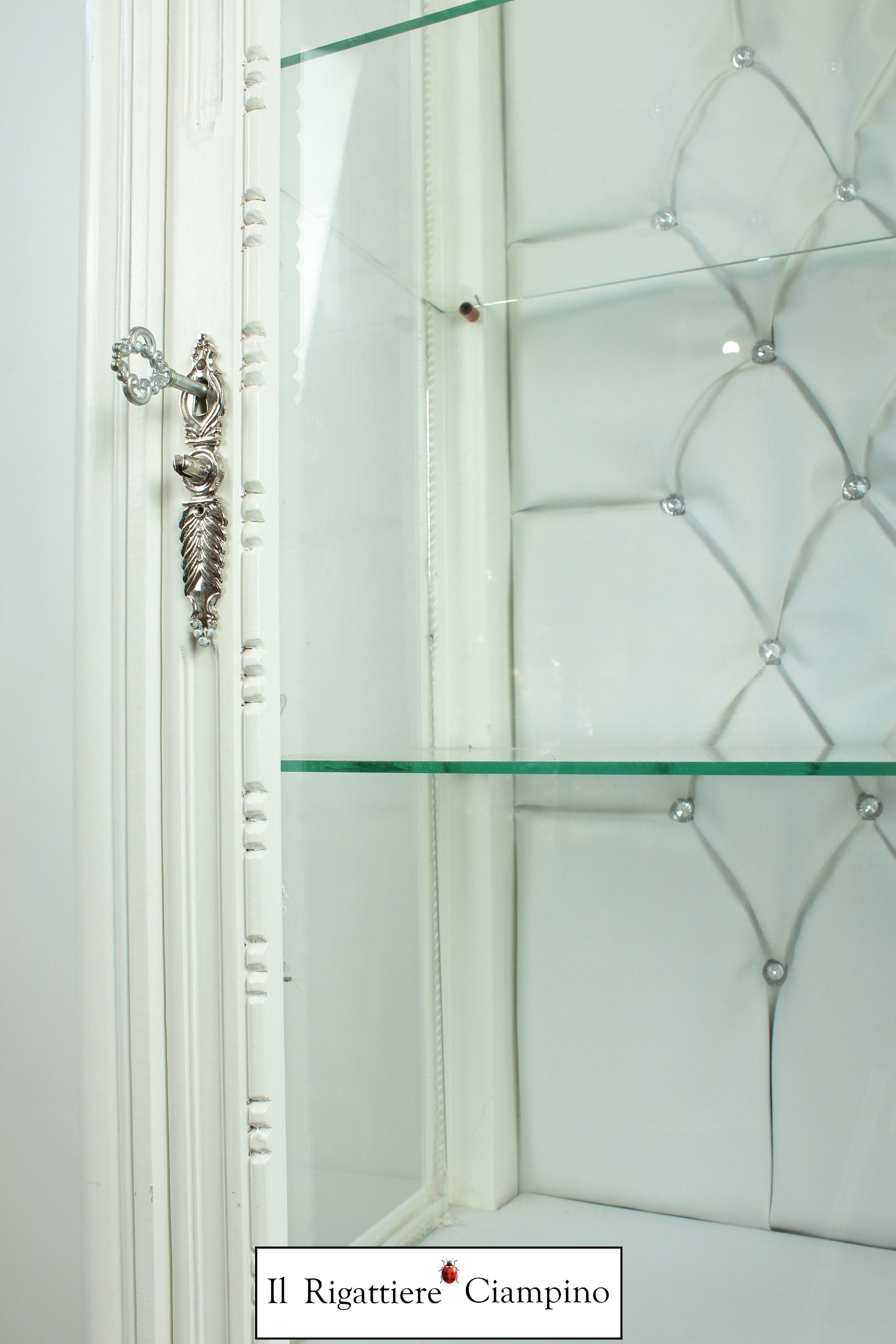 Il Rigattiere Ciampino propone una vetrina modello Grace, in stile barocco, dotata di 2 piani in vetro intermedi e botola, lavorazione Capitonné in ecopelle bianca o tessuto damasco con bottoni Swarovski.