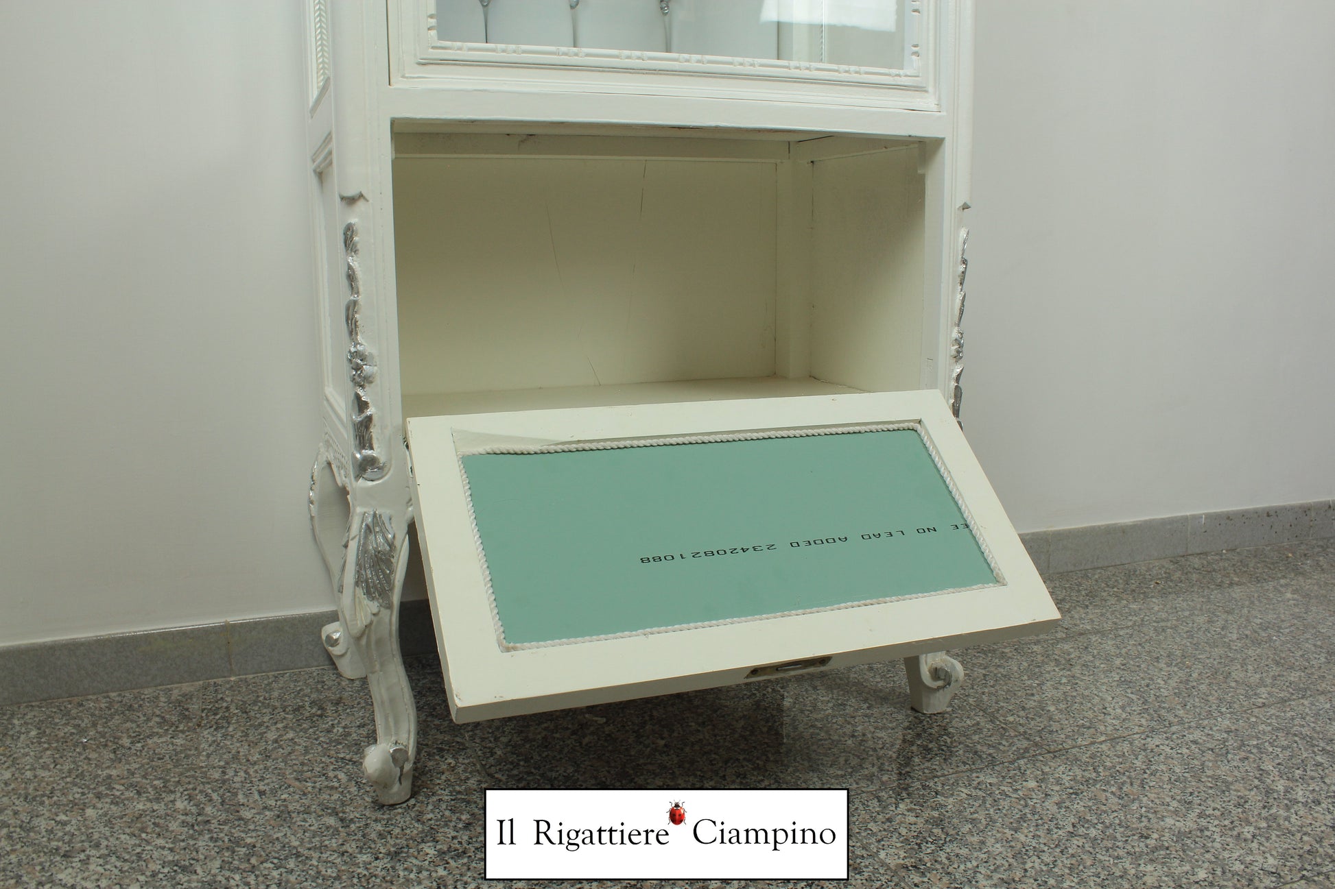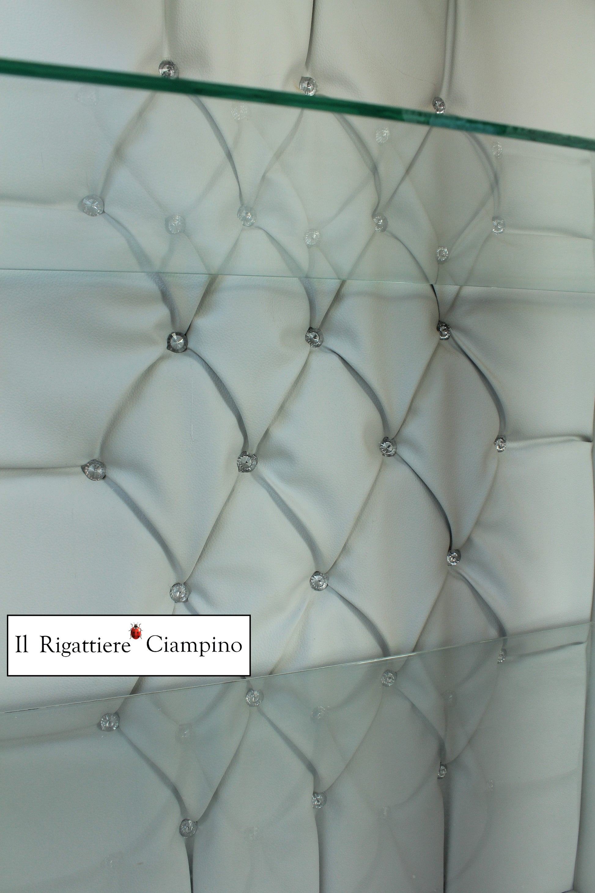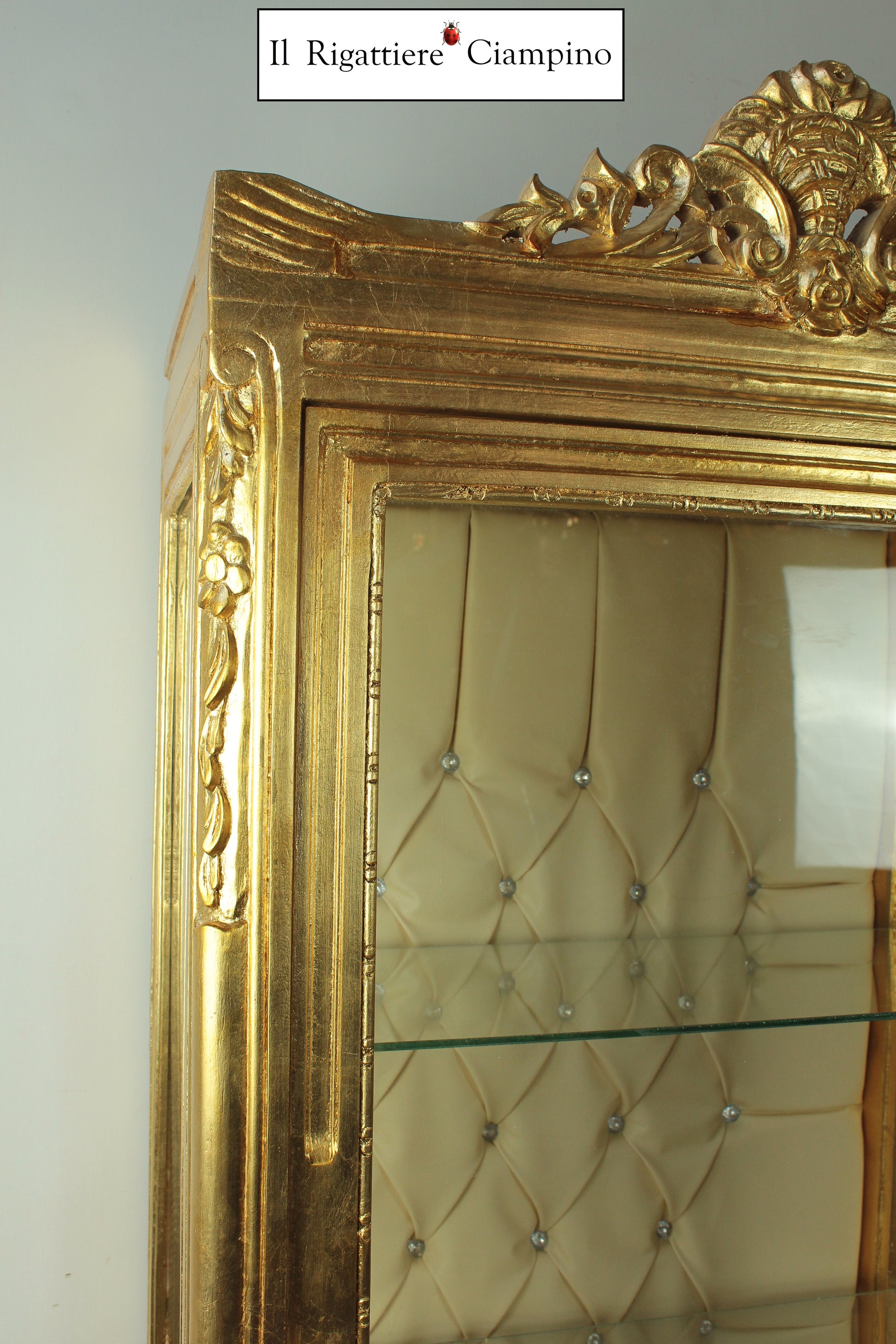 Il Rigattiere Ciampino propone una vetrina modello Grace, in stile barocco, dotata di 2 piani in vetro intermedi e botola, lavorazione Capitonné in ecopelle bianca o tessuto damasco con bottoni Swarovski.