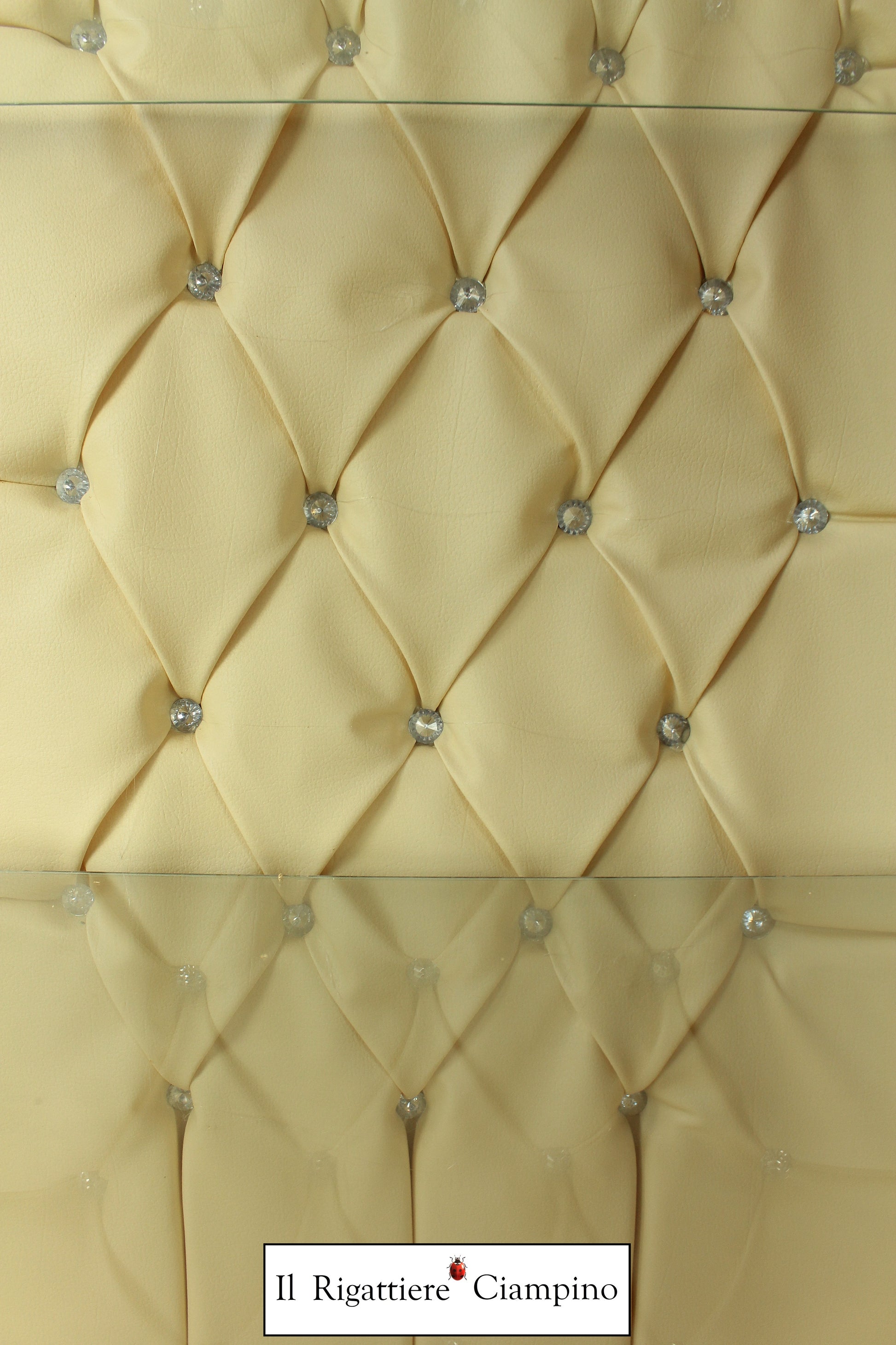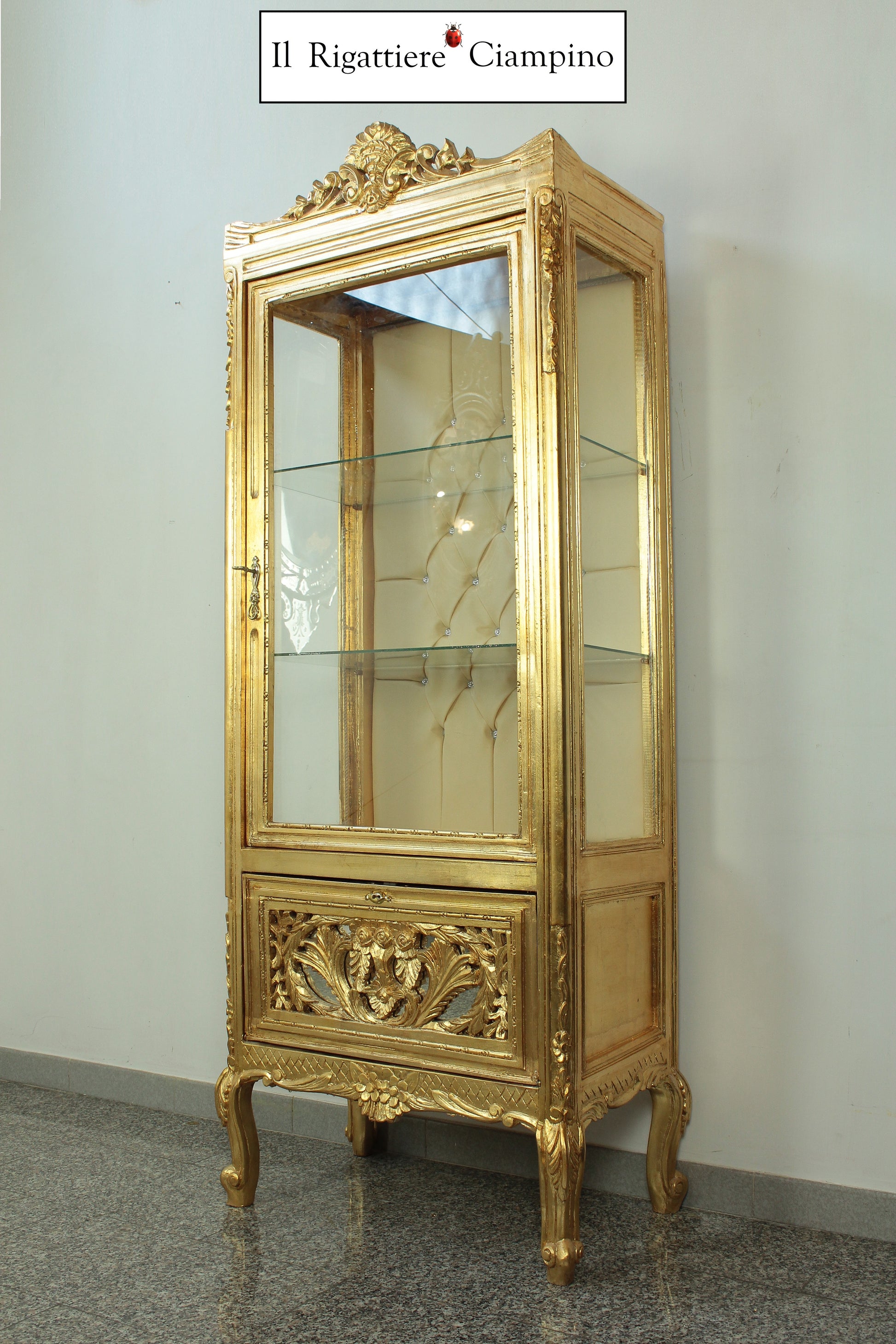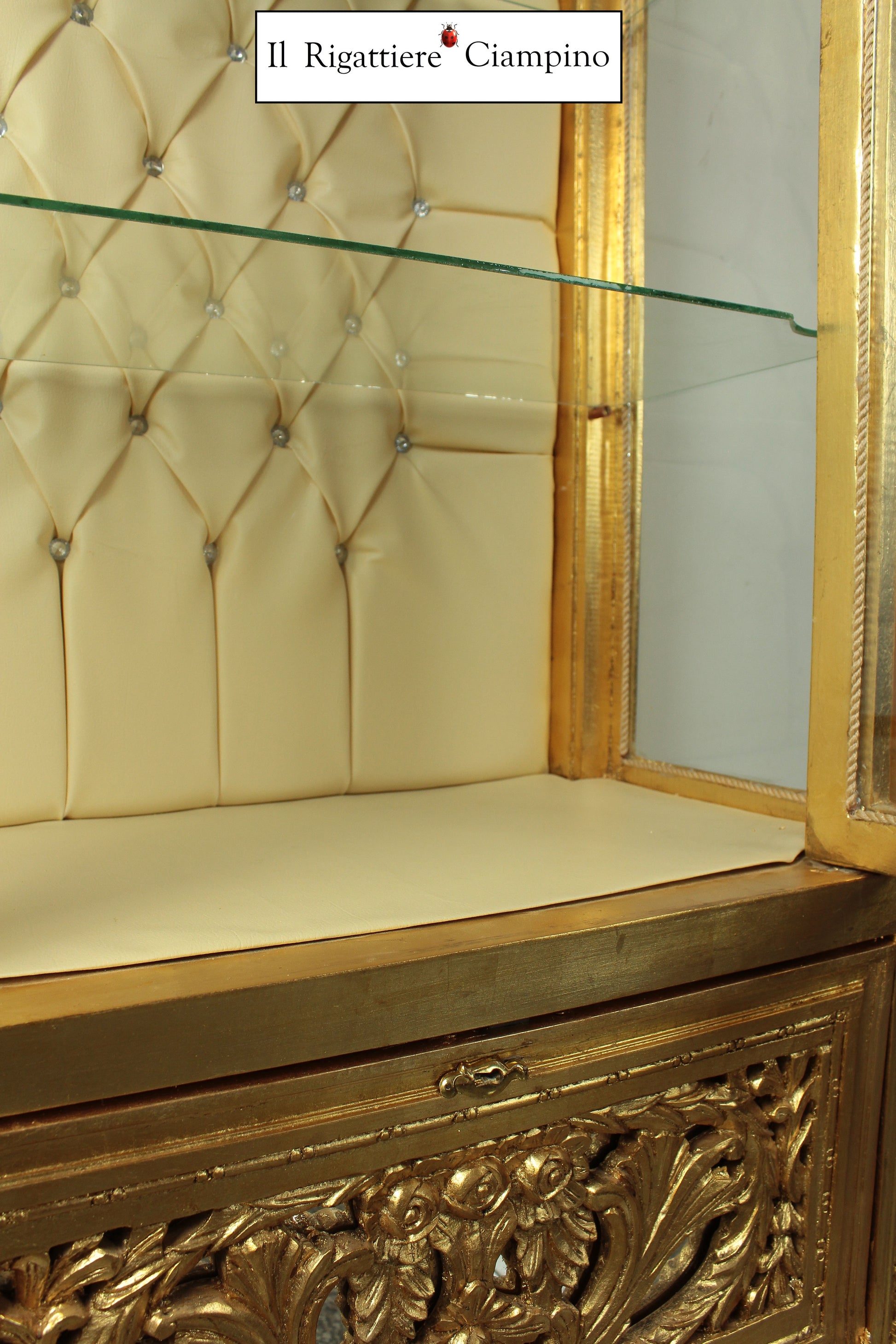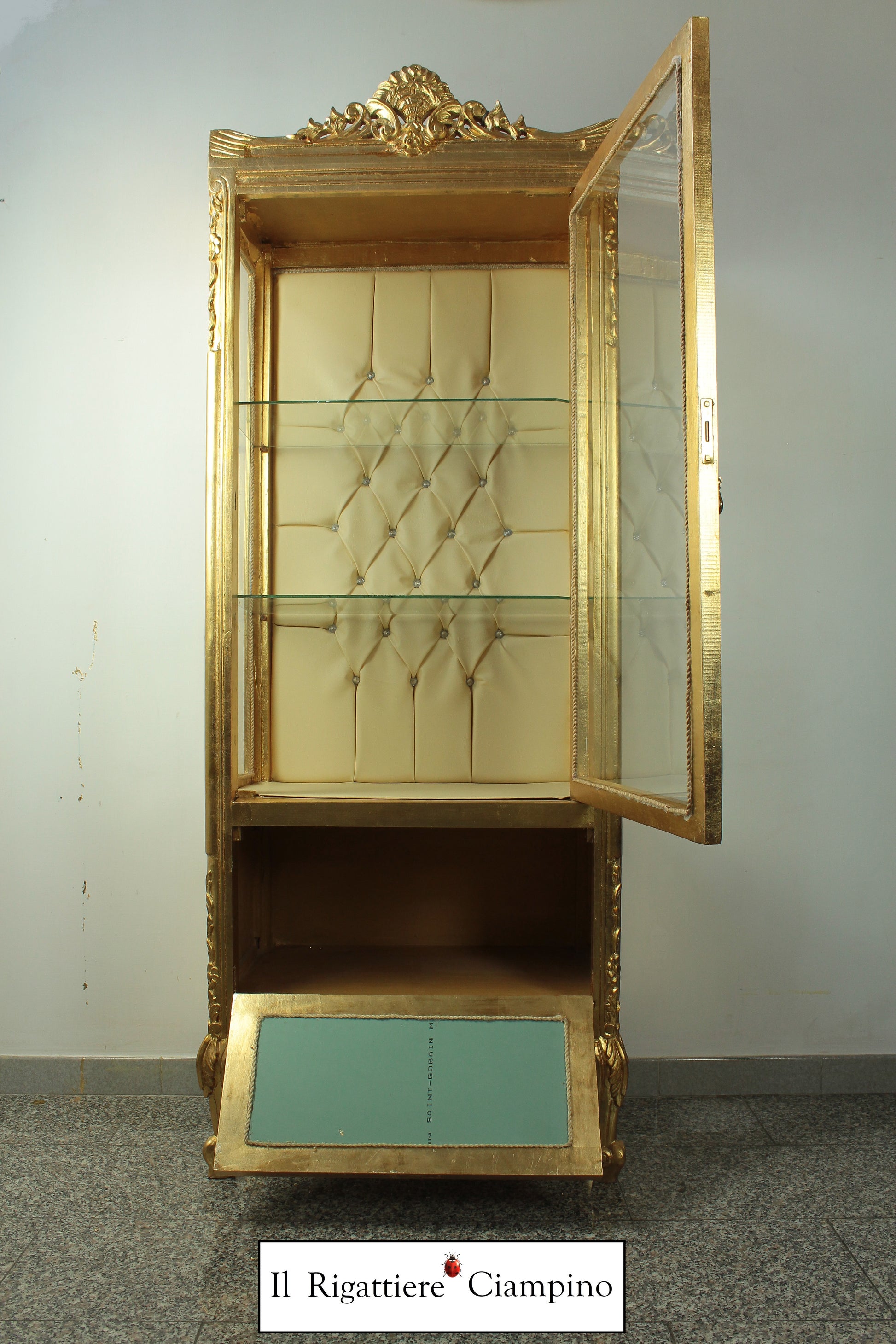 Il Rigattiere Ciampino propone una vetrina modello Grace, in stile barocco, dotata di 2 piani in vetro intermedi e botola, lavorazione Capitonné in ecopelle bianca o tessuto damasco con bottoni Swarovski.